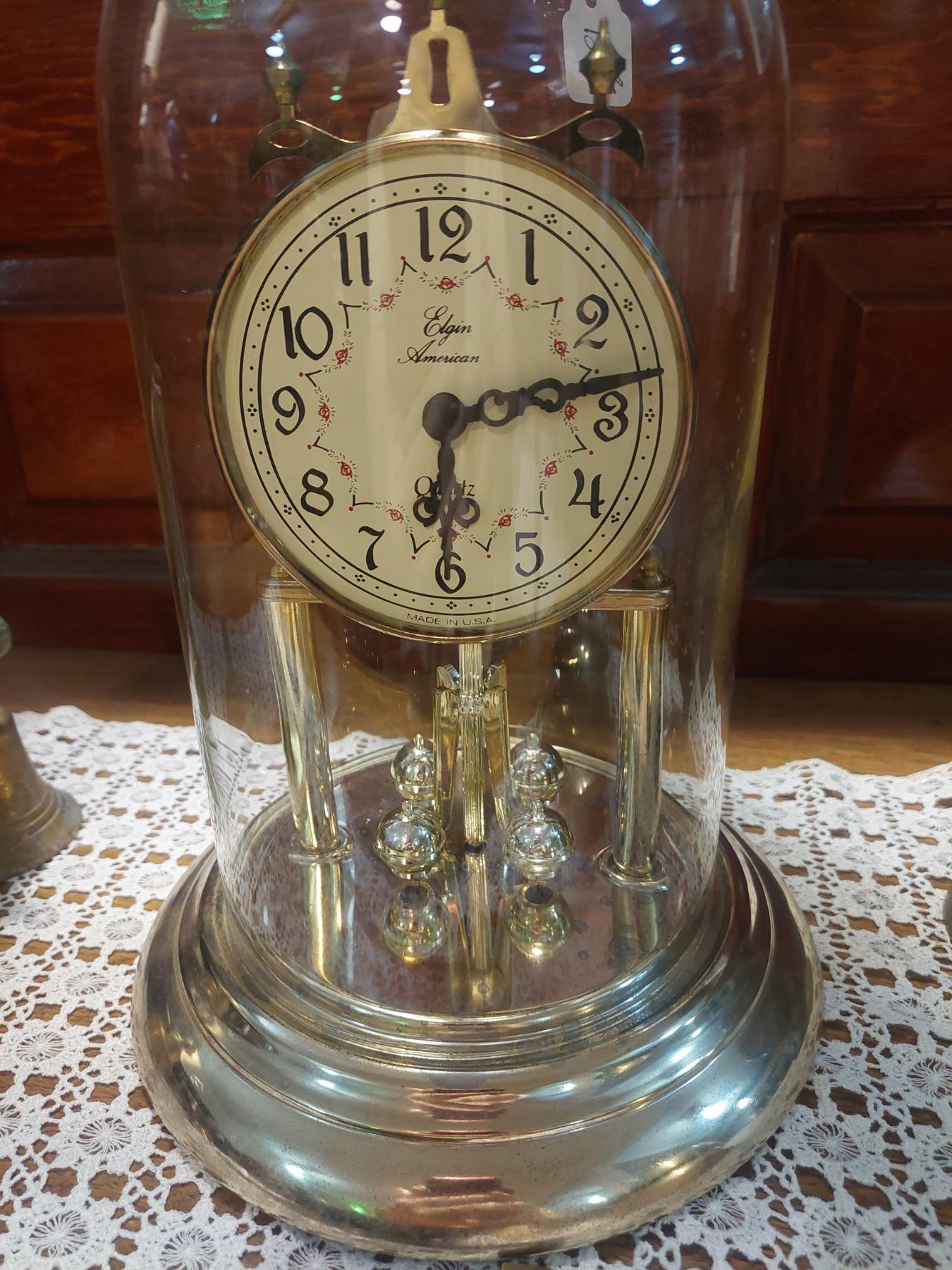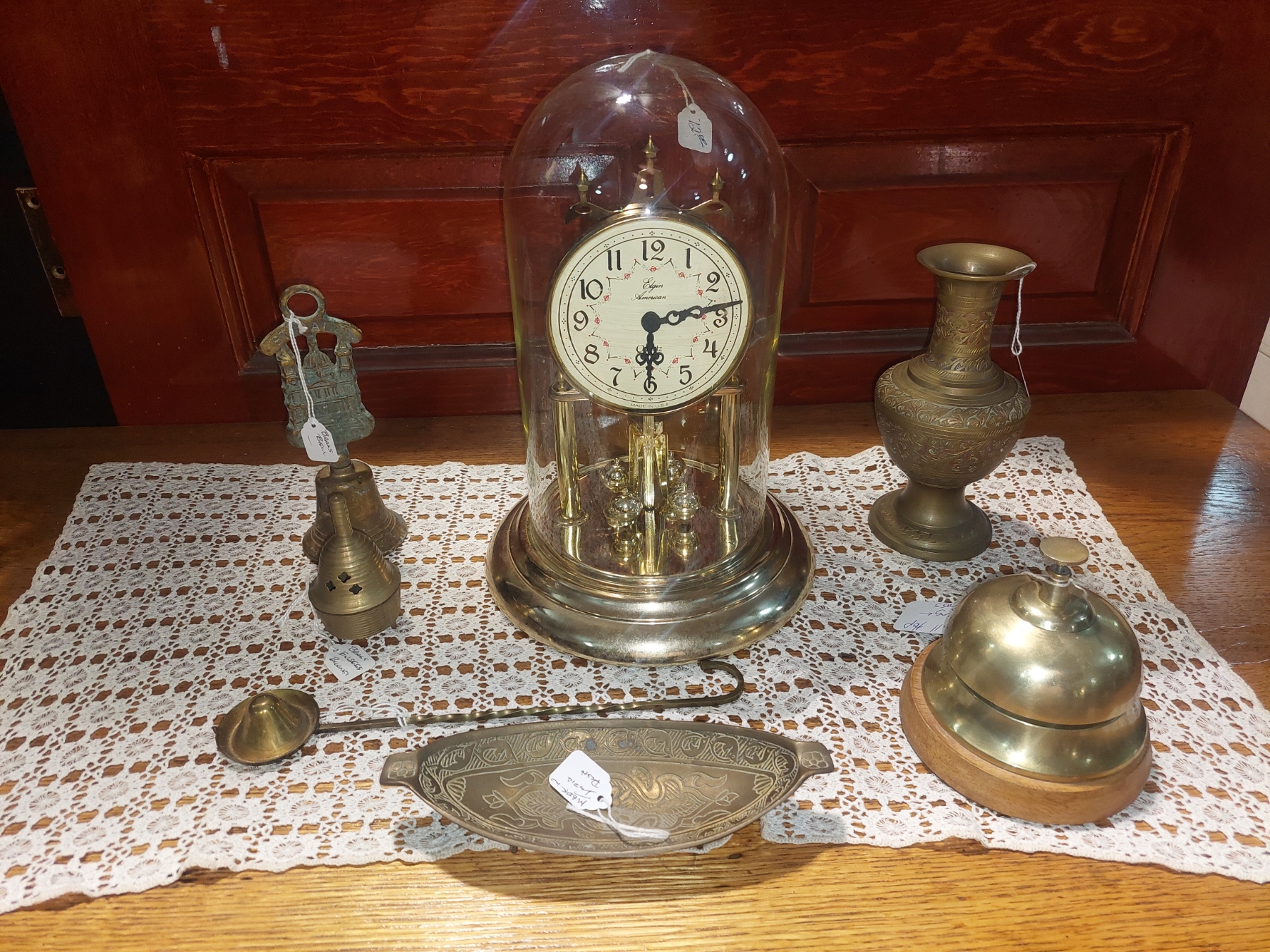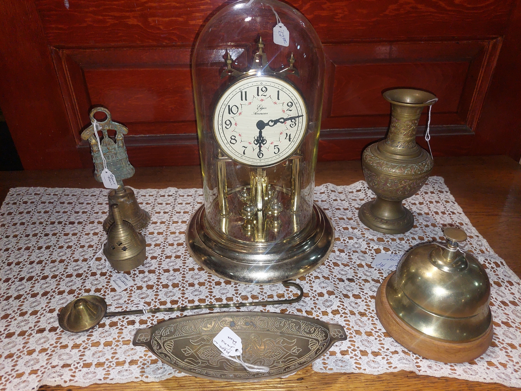 Nice Grouping Of Brass Table Pieces With Elgin 8 Day Spinning Anniversary Clock - See Pics