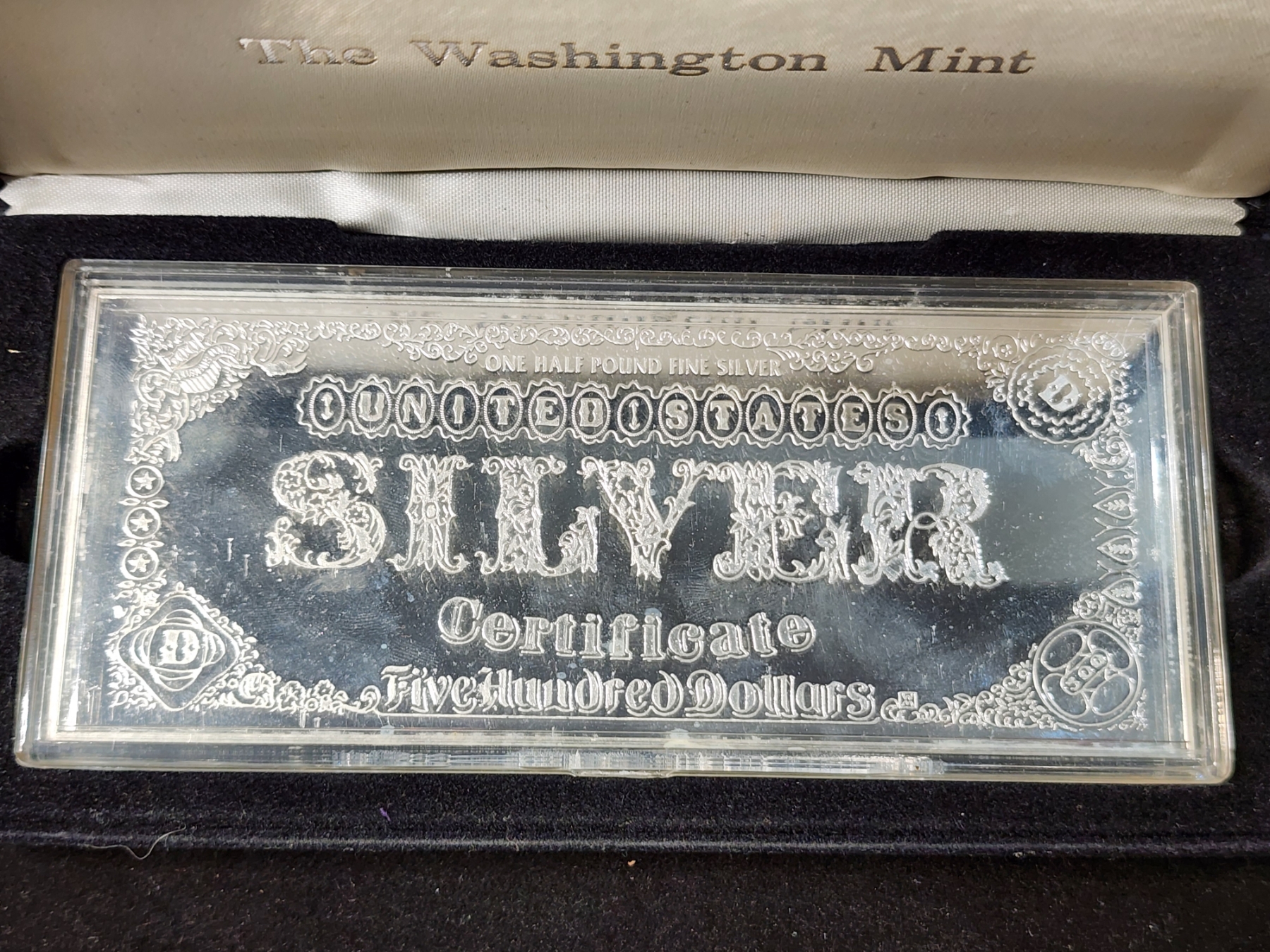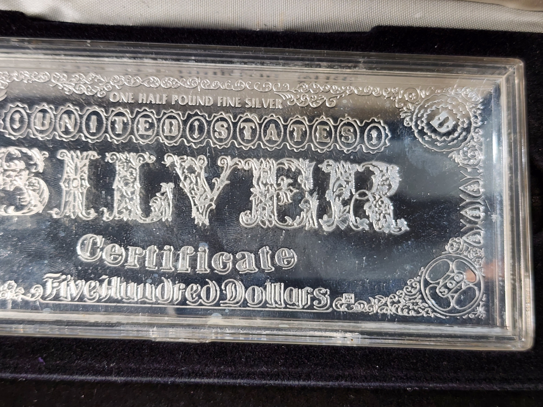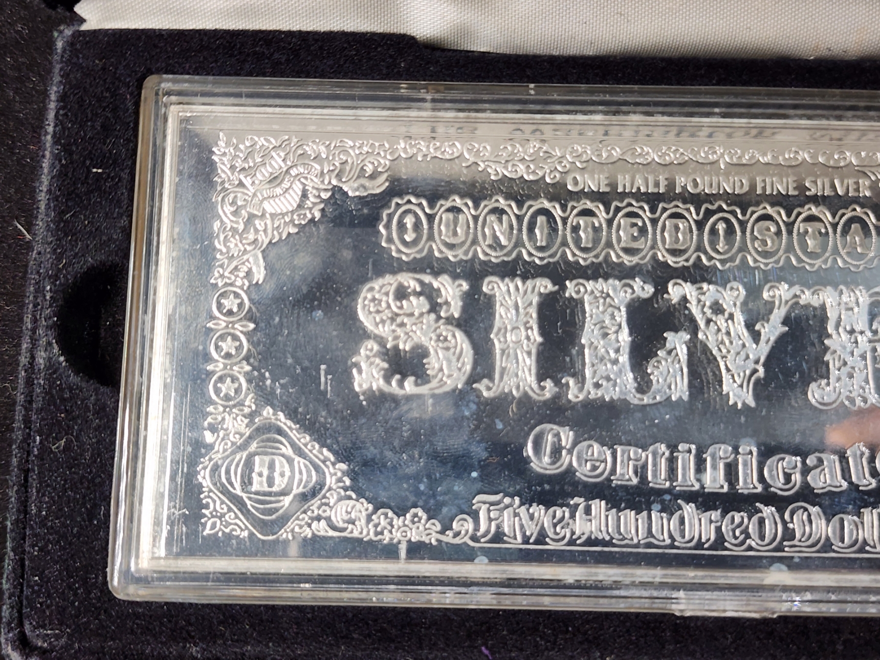 One Half Pound .999 Fine Silver $500 Silver Certificate Bar - Beautiful Artwork!