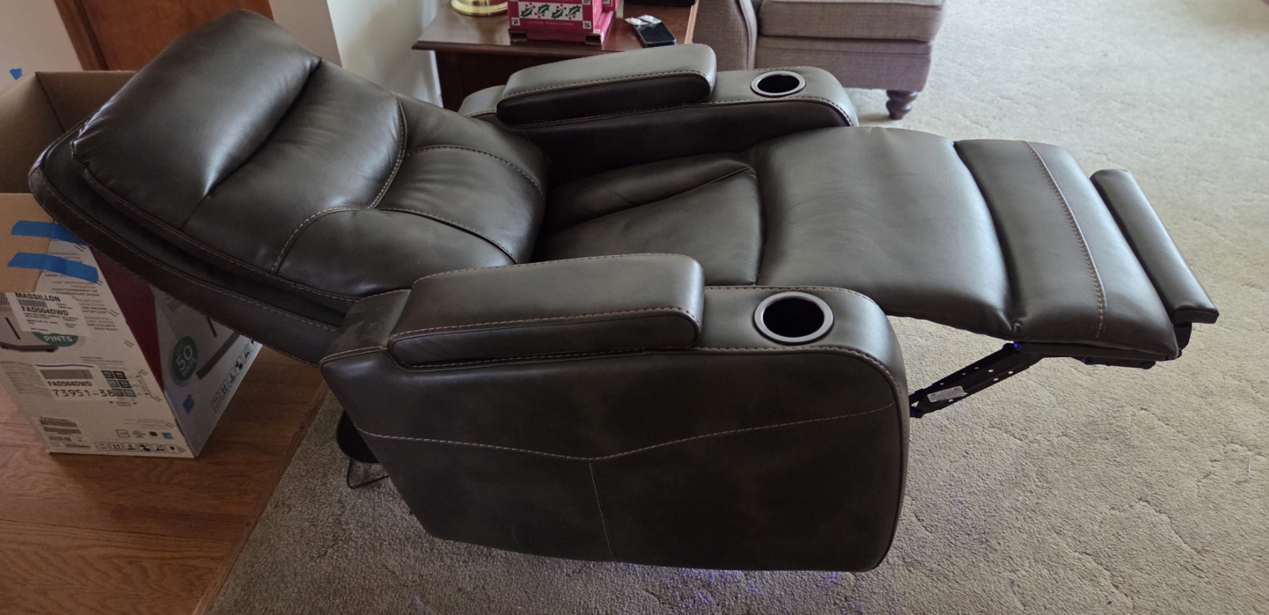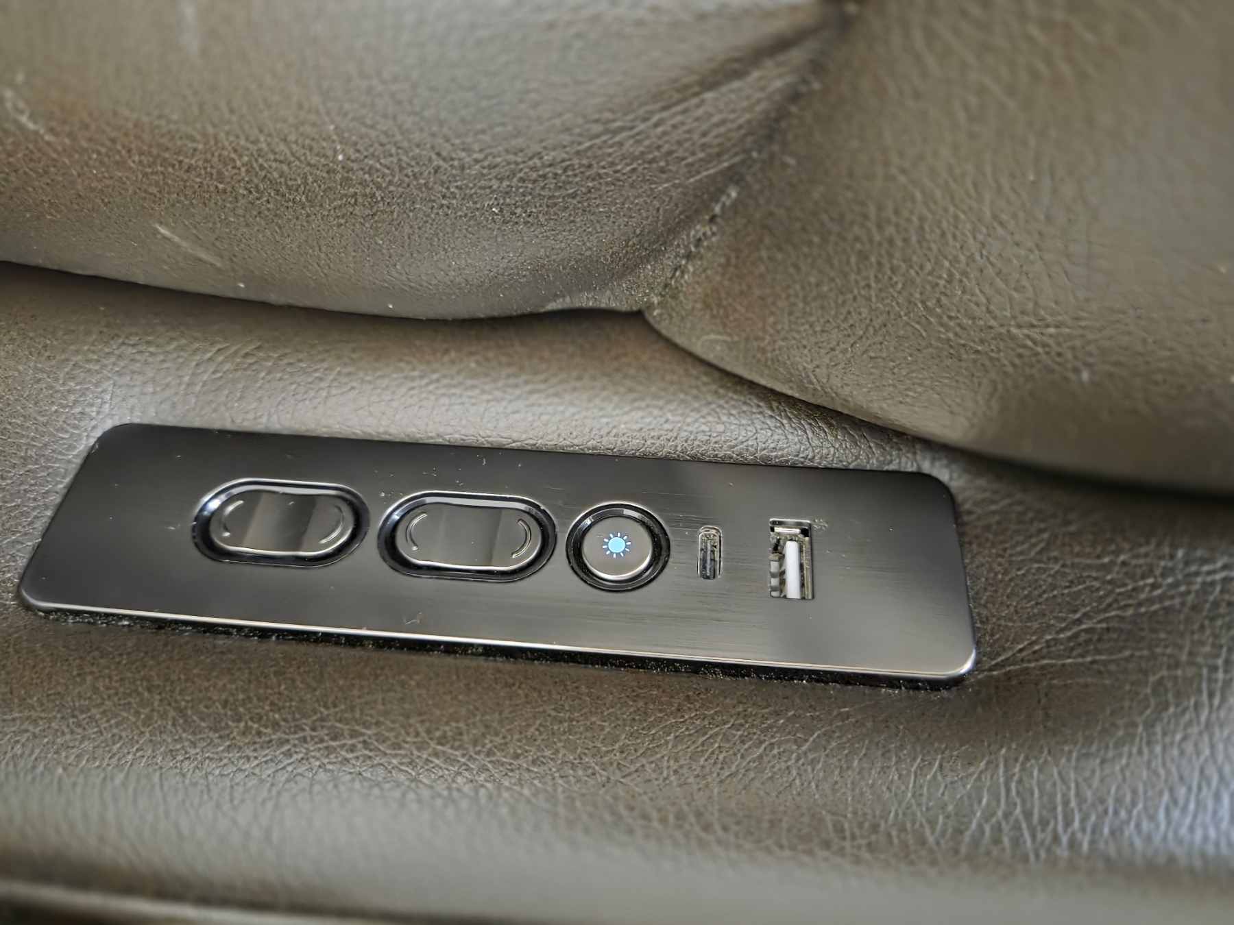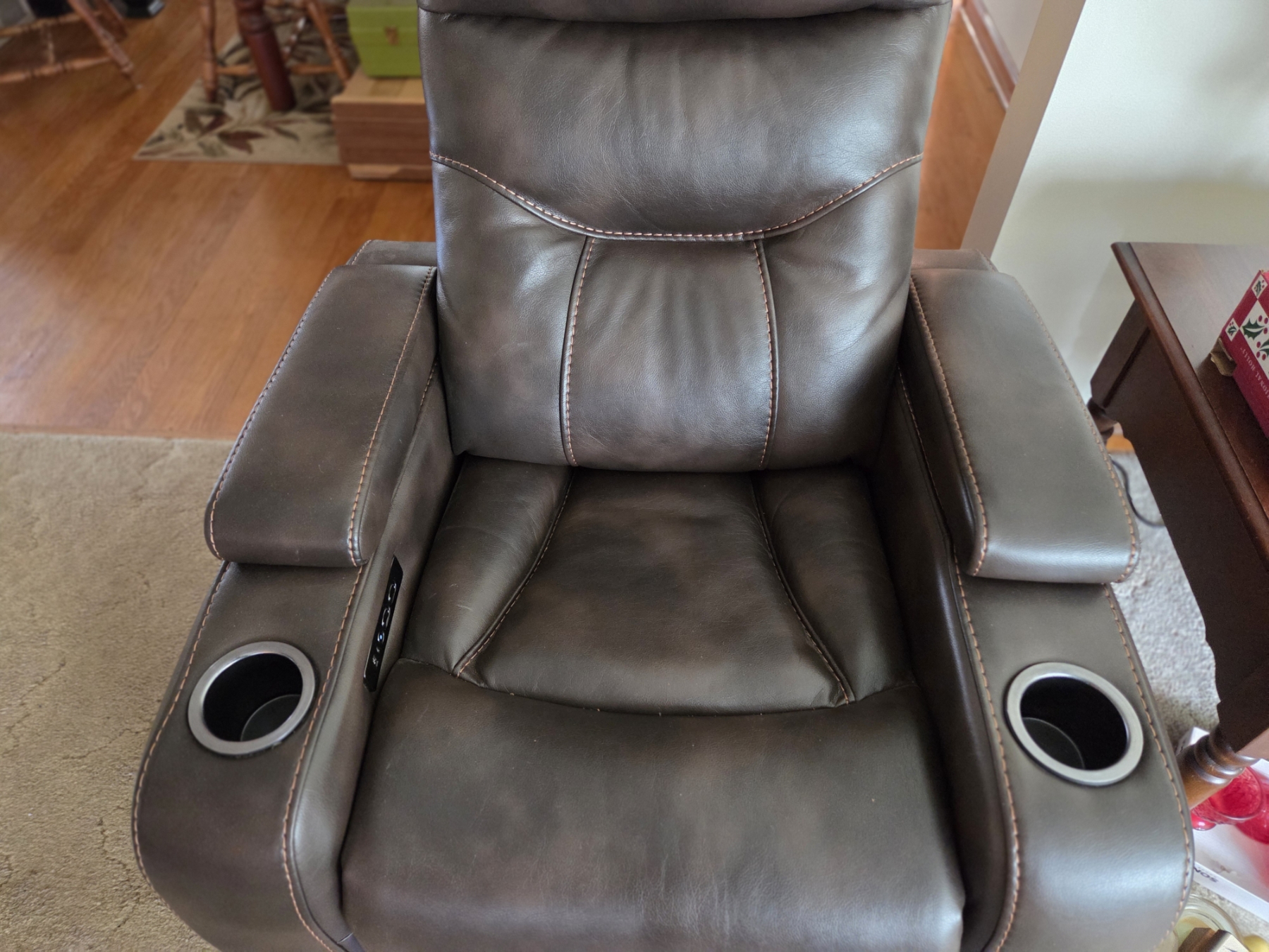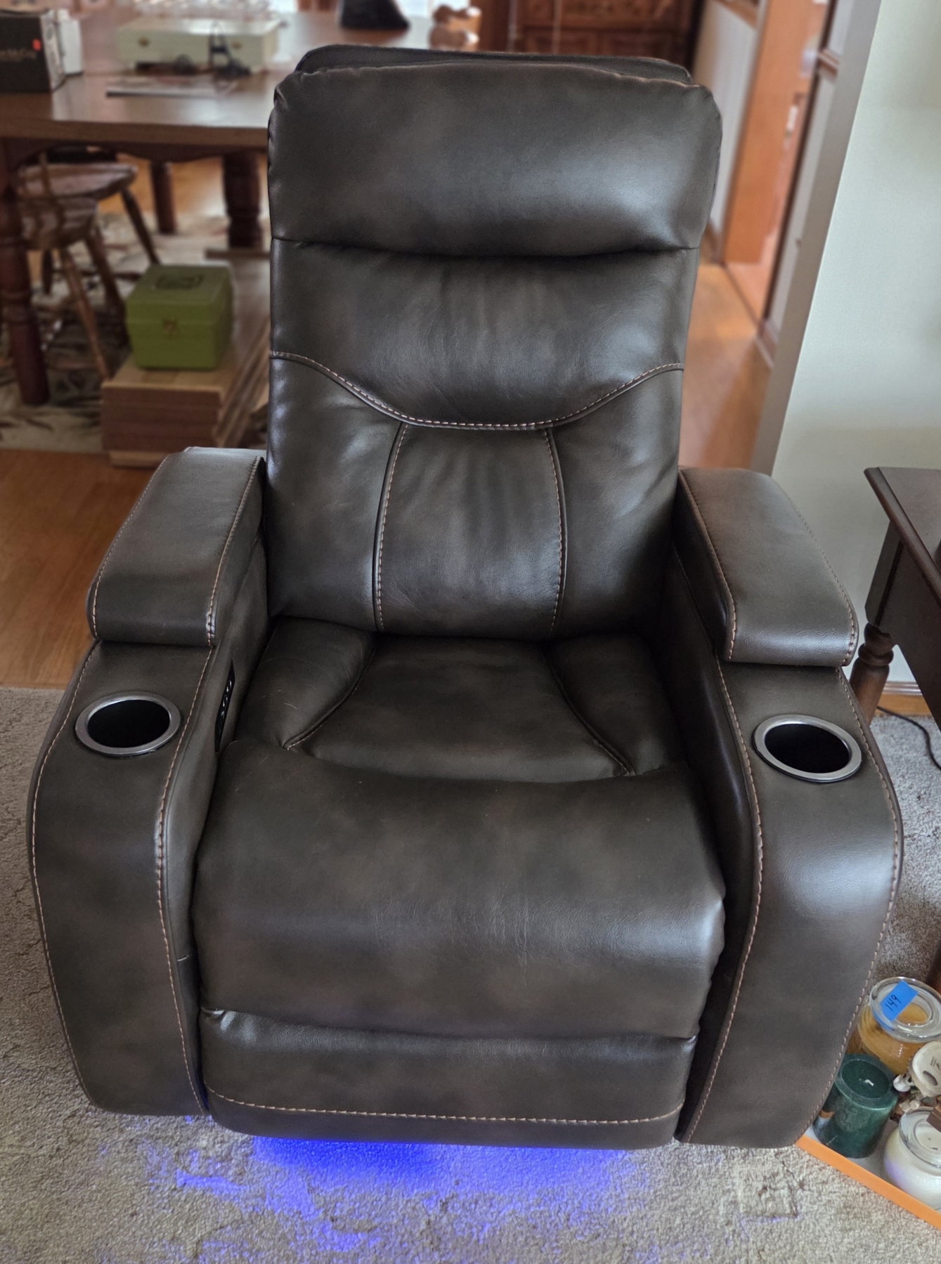 PICKUP IN CANTON - Gorgeous, Rich Brown Soft Leather Power Recliner Like New Condition! LED Blue Light Underneath, Charging Ports, Easy To Access Button Control Fully Reclines!! 33.5''x42''