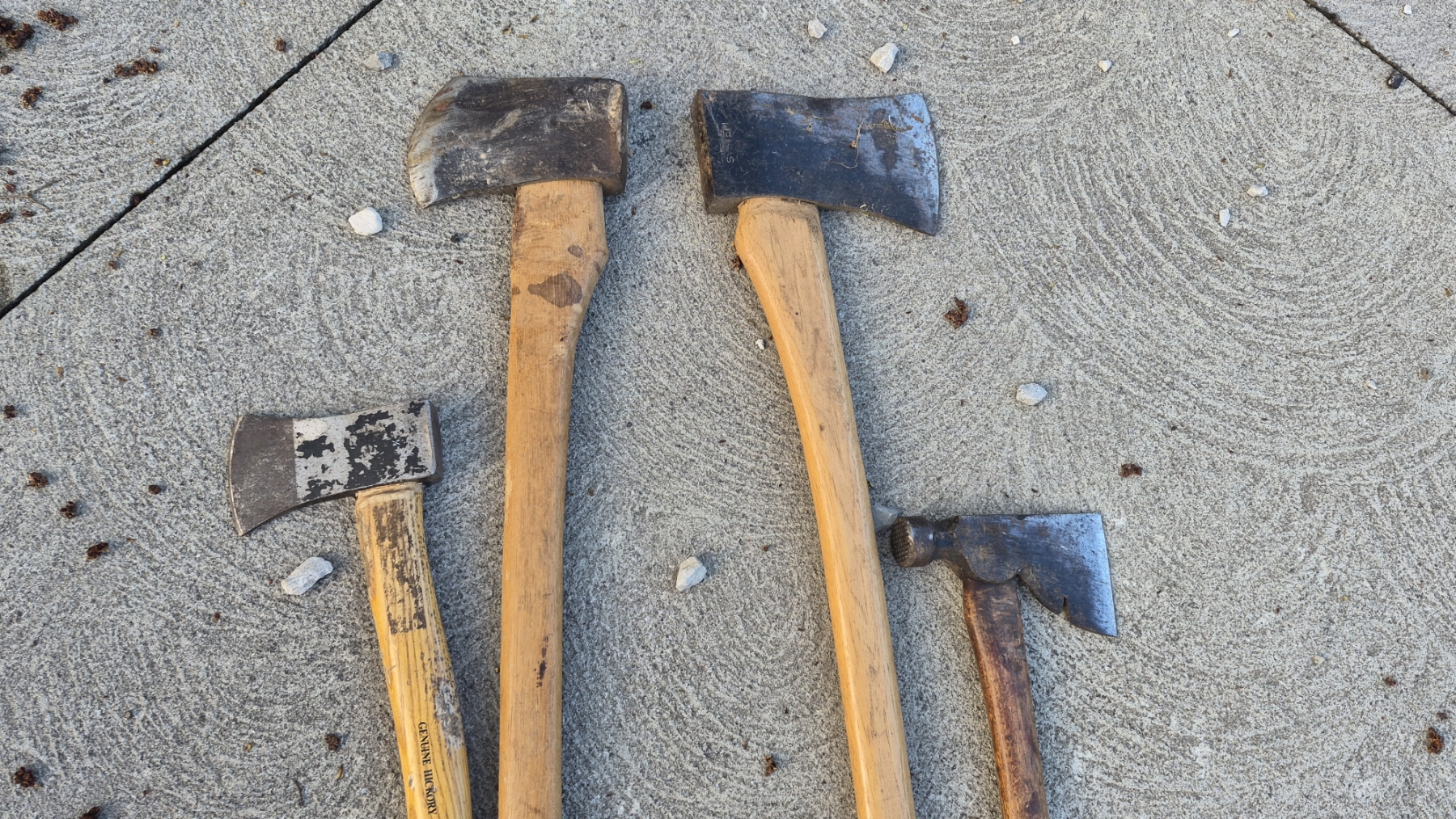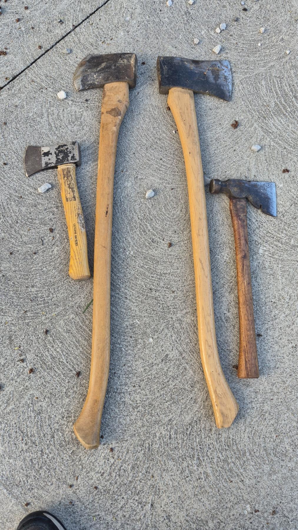 PICKUP IN CANTON - LOT OF 4 AXES AS SHOWN - 2 BROAD AXE & 2 HAND AXES / HATCHETS - GOOD CONDITION