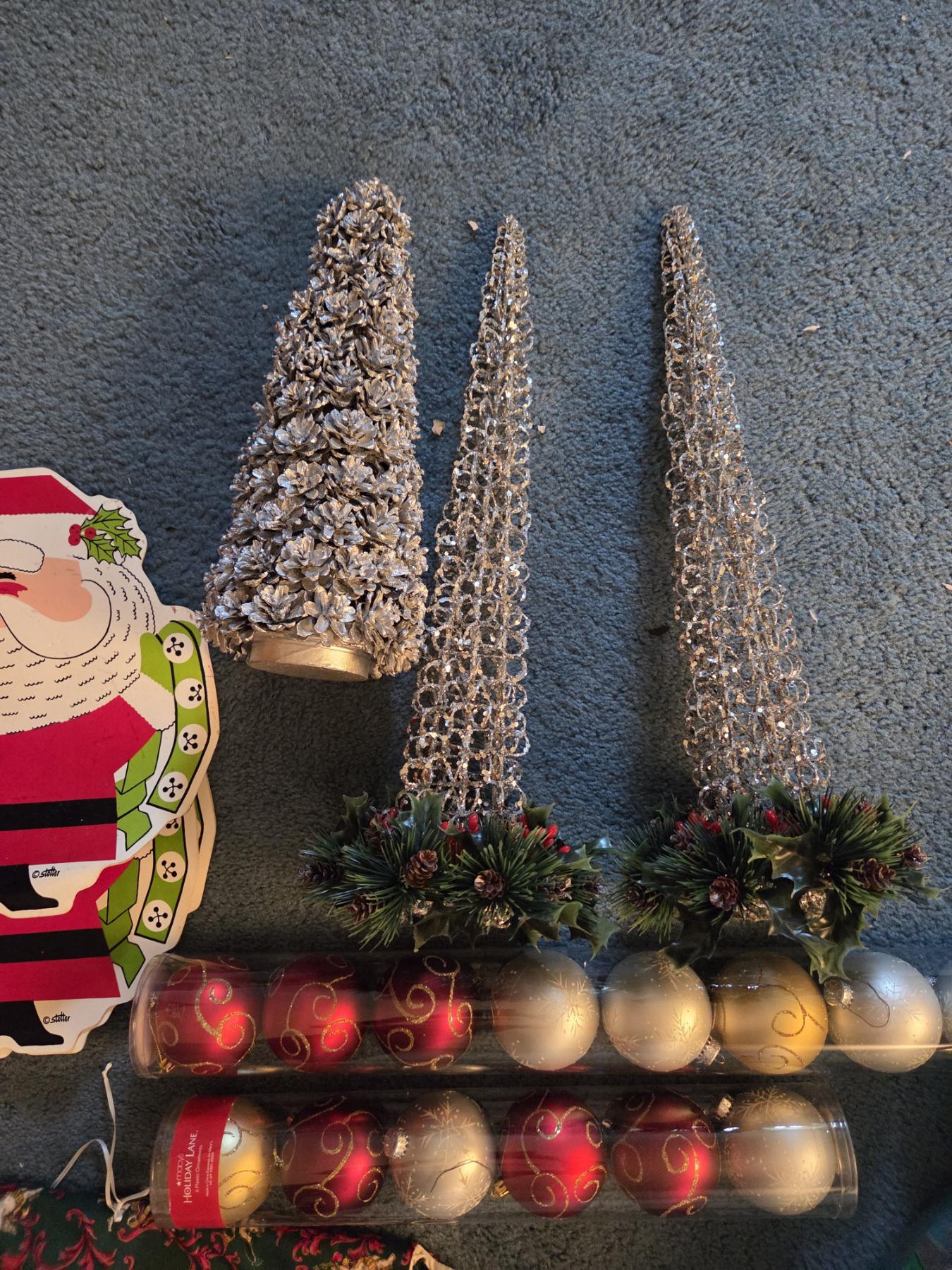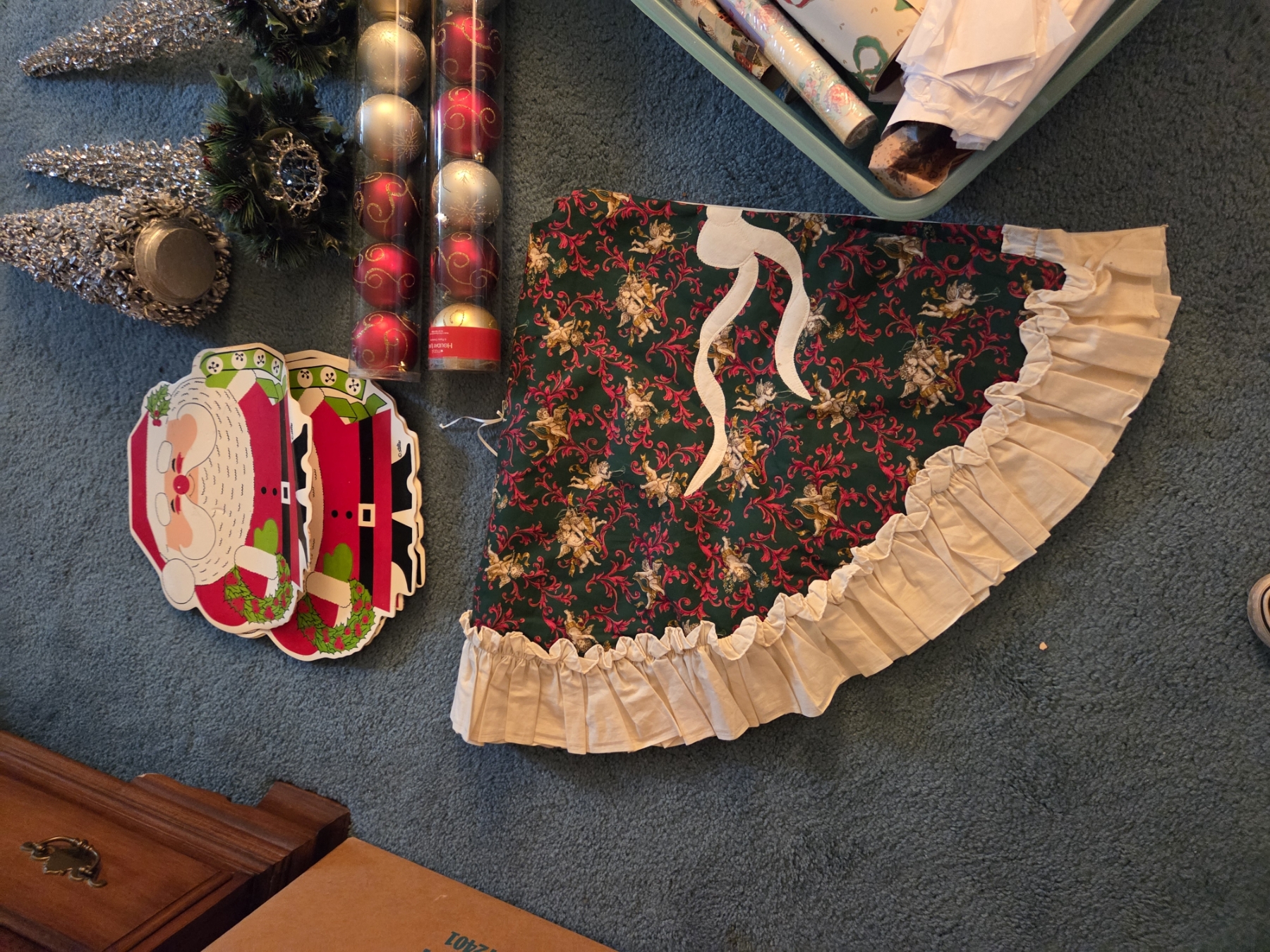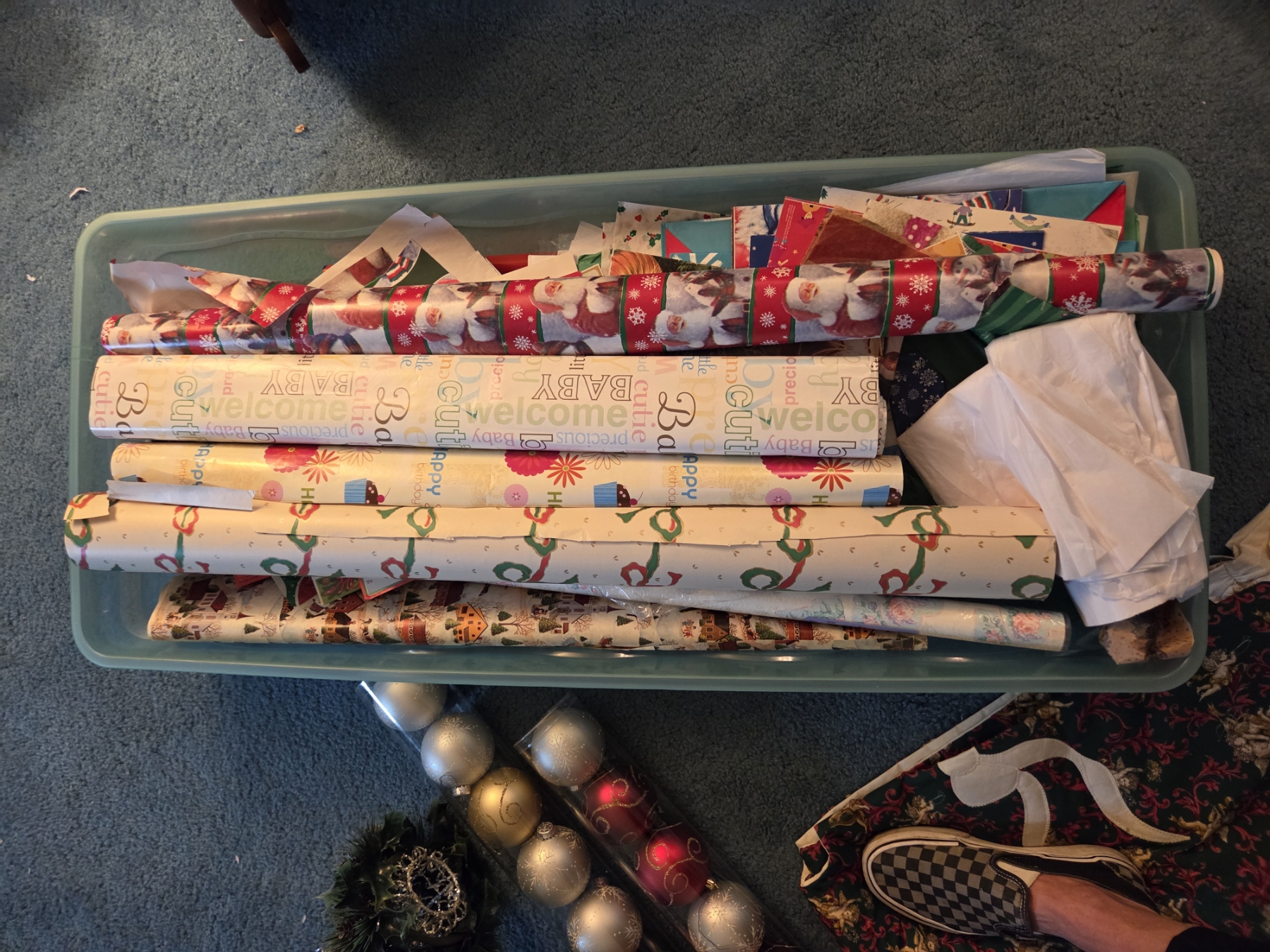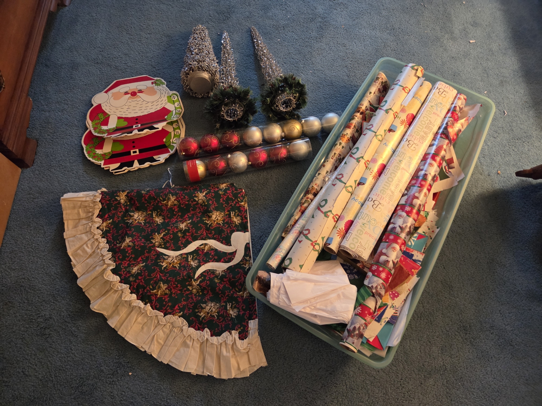 PICKUP IN CANTON- Large Plastic Storage Container With Wrapping Paper, Christmas Tree Decor, Placemats & More!