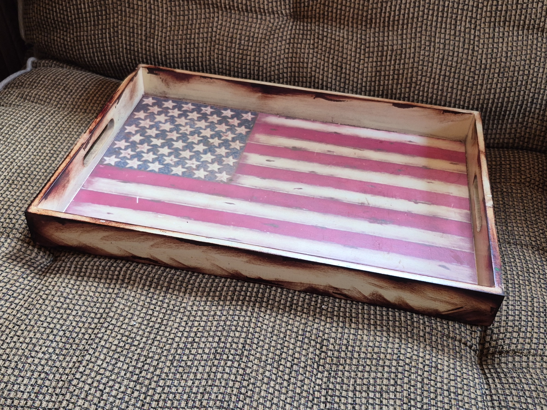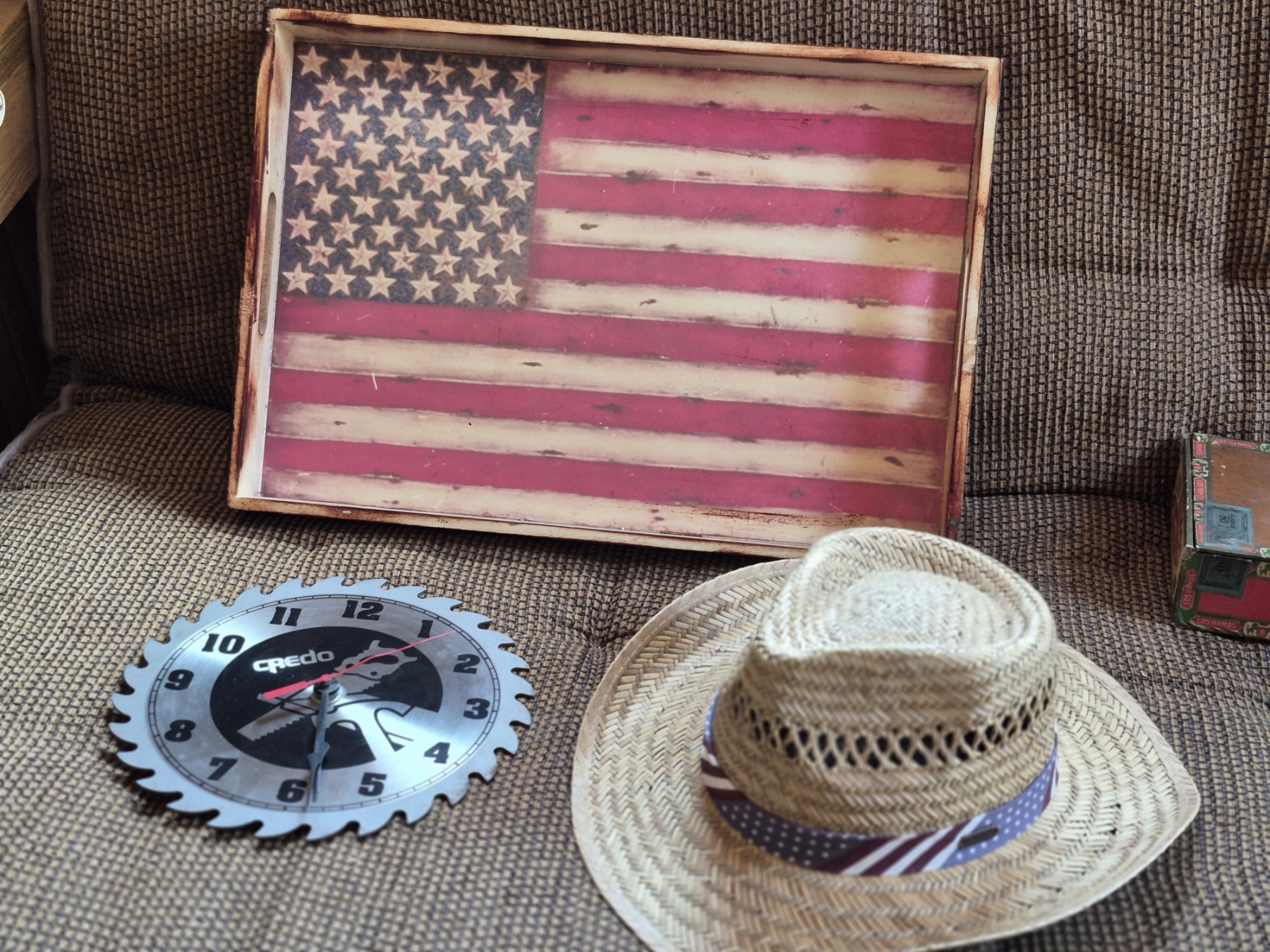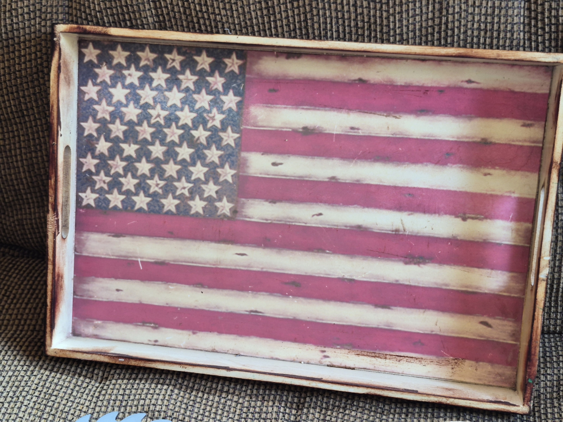 PICKUP IN CANTON - Patriotic Group As Shown - Hat, Wooden American Flag Tray - Wall Clock