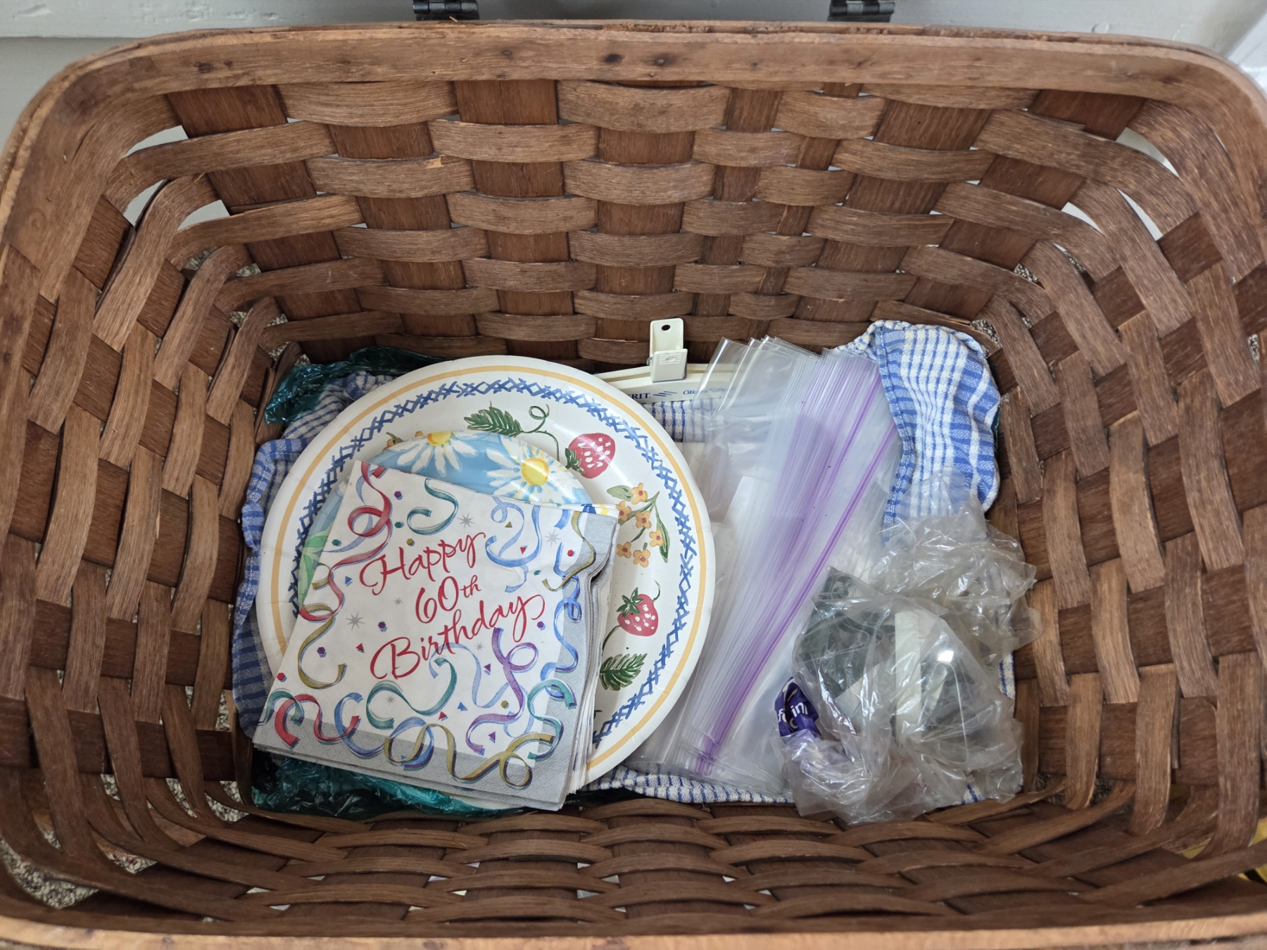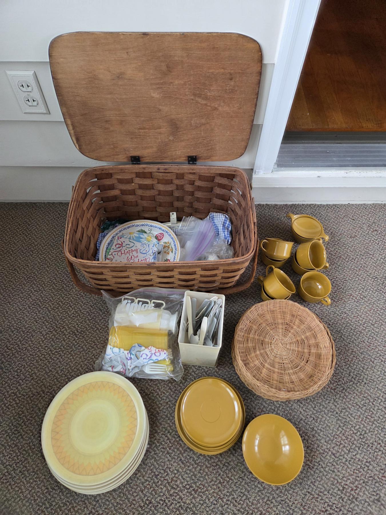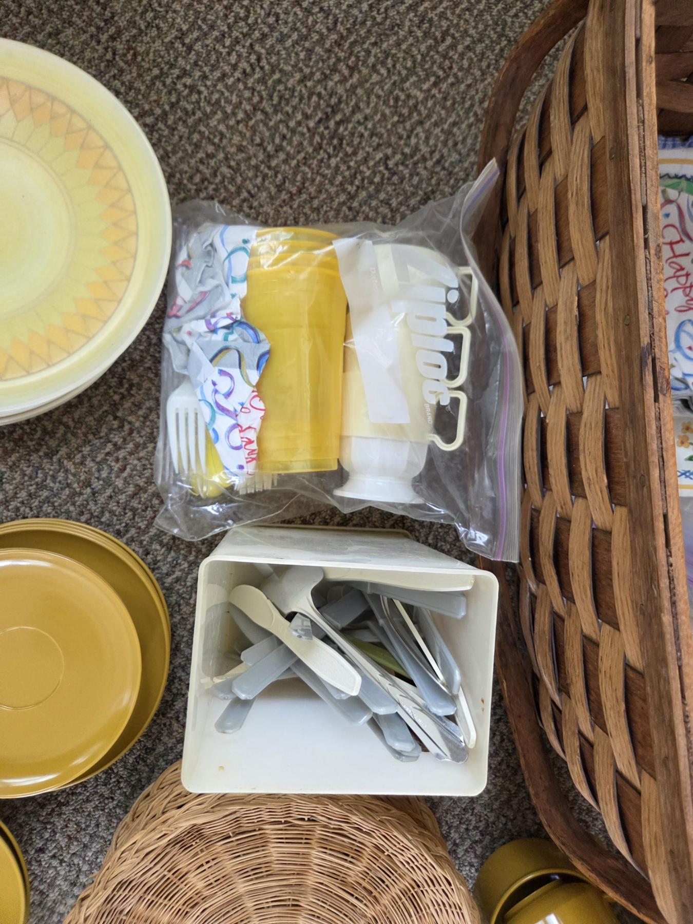 PICKUP IN CANTON - Vintage Picnic Basket, Includes Wicker Plate Holders, Cups, Plates Table Cloth, And More
