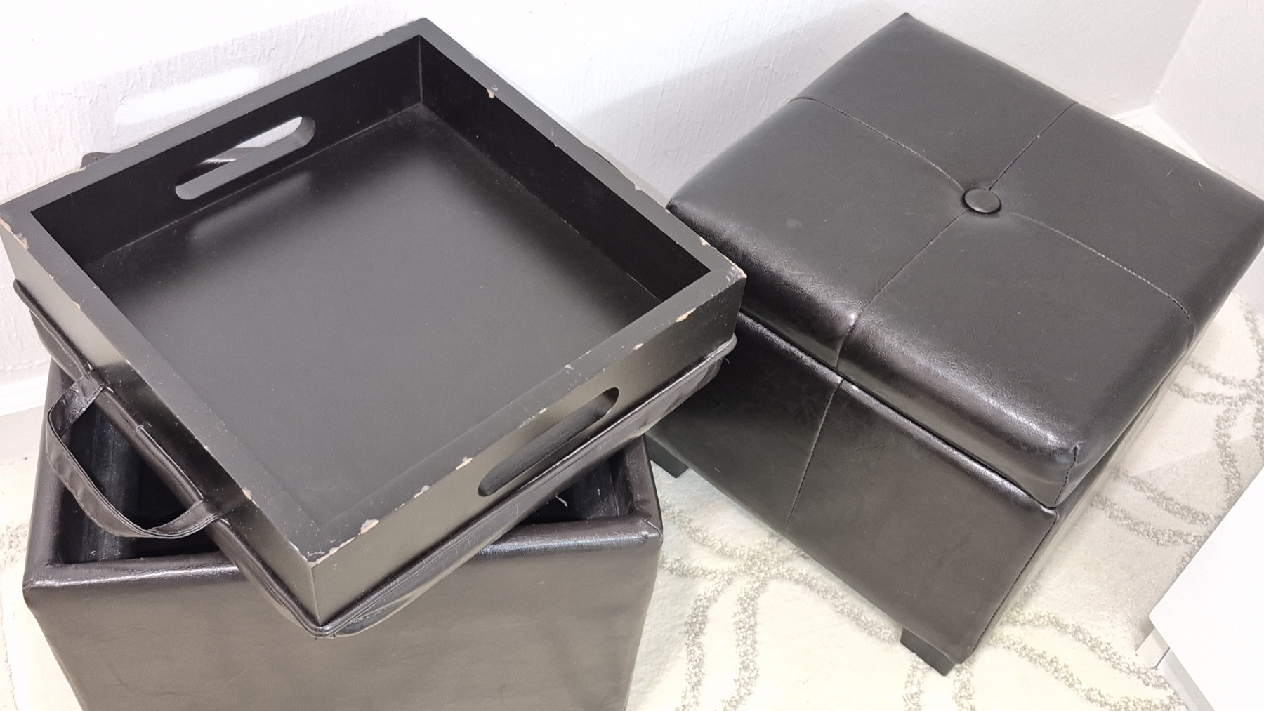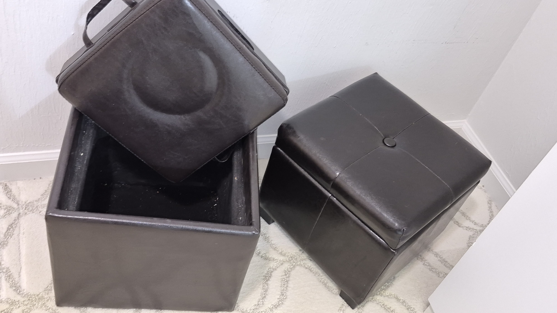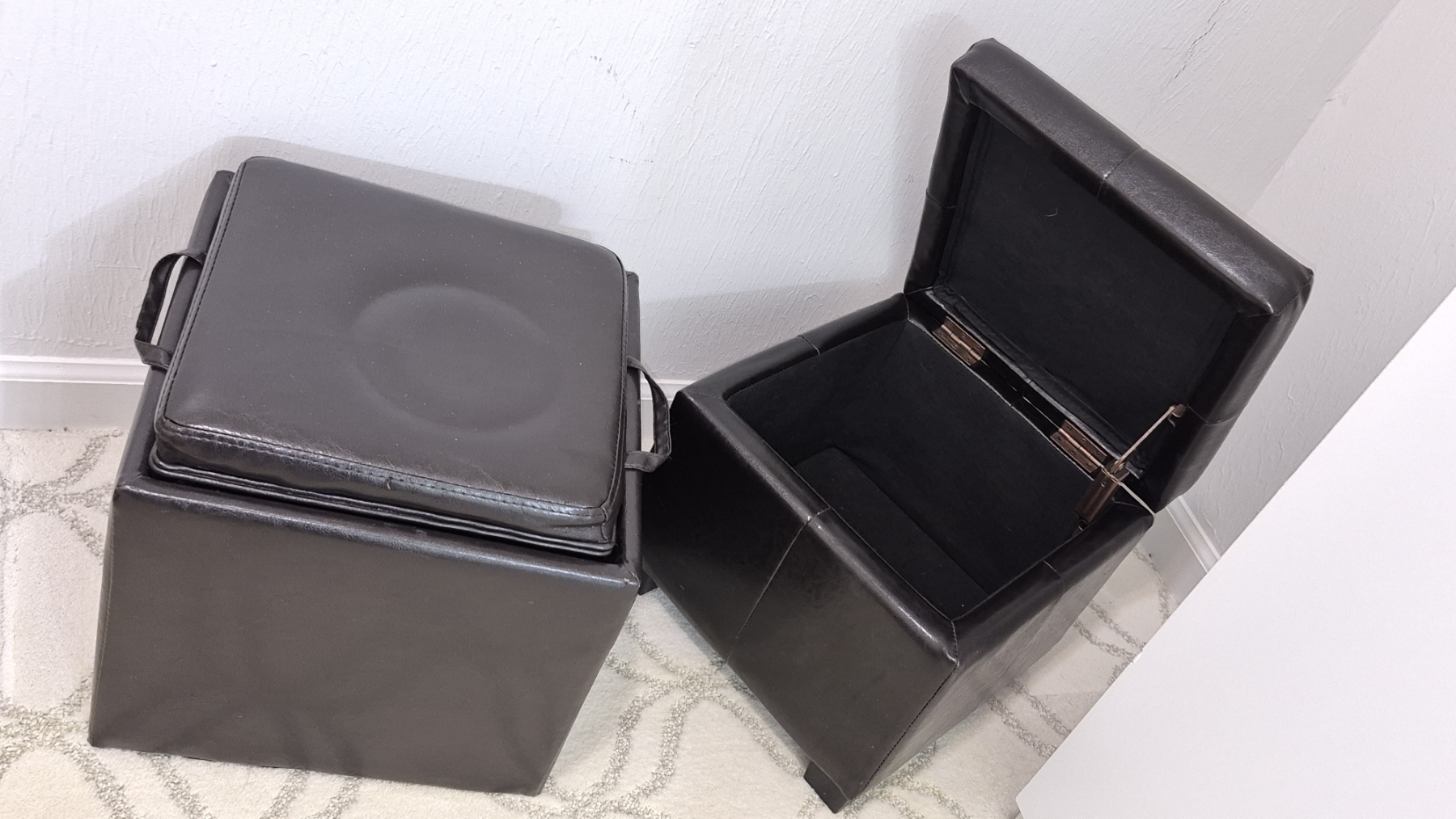 PICKUP IN NORTHFIELD - 2 Pcs Leather Upholstered Storage Boxes 14 x 14 x 14 - One is a hinged lid... Other is a removable and reversible Seat / Tray - See Pics - (All Items noting "Pickup In Northfield" will be available the following Saturday after this auction ends. Other items in this auction will be available at our Louisville Office. Winners of Northfield items will be notified with the address and times, after the auction closes.)