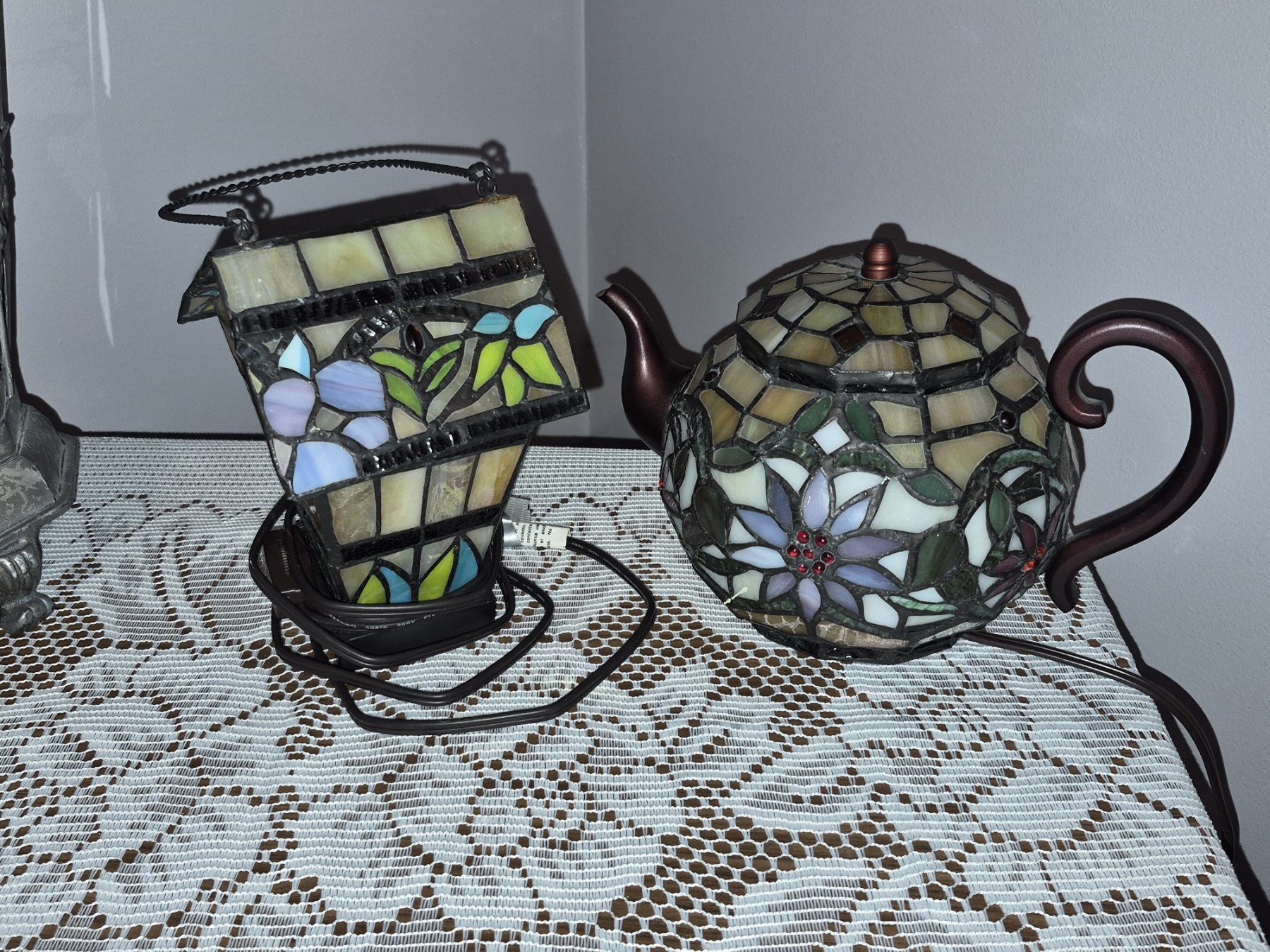 PICKUP IN NORTHFIELD - 2 Pcs Small Leaded Glass Teapot Lamp & Lantern- See Pics - (All Items noting "Pickup In Northfield" will be available the following Saturday after this auction ends. Other items in this auction will be available at our Louisville Office. Winners of Northfield items will be notified with the address and times, after the auction closes.)