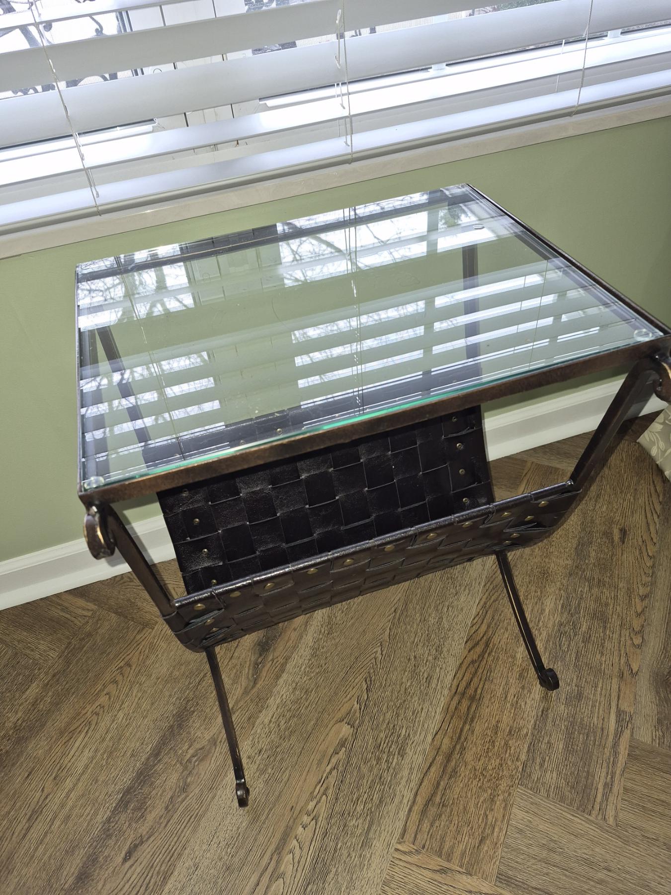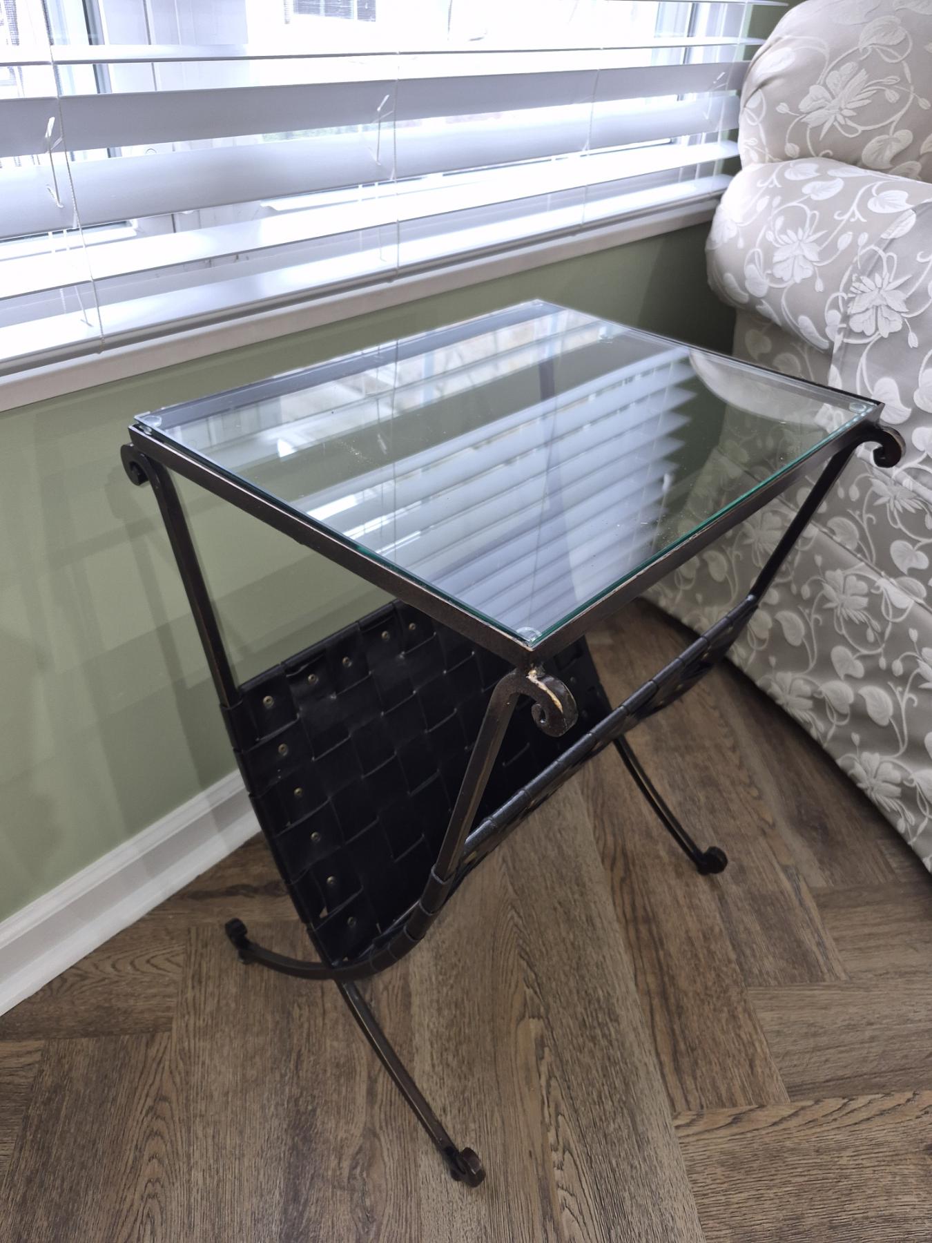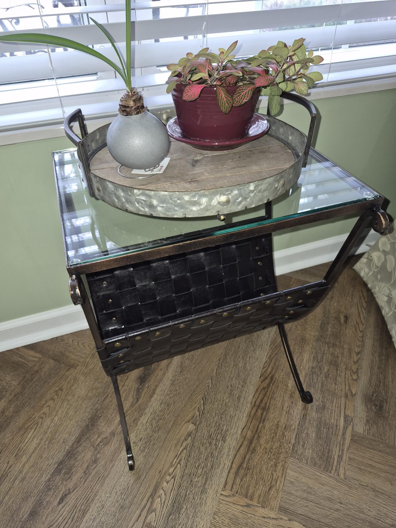 PICKUP IN NORTHFIELD - 2nd Of 2 Glass Top Metal Magazine Rack 24" Tall - 16" x 18" - Includes Plants Shown - See Pics - (All Items noting "Pickup In Northfield" will be available the following Saturday after this auction ends. Other items in this auction will be available at our Louisville Office. Winners of Northfield items will be notified with the address and times, after the auction closes.)