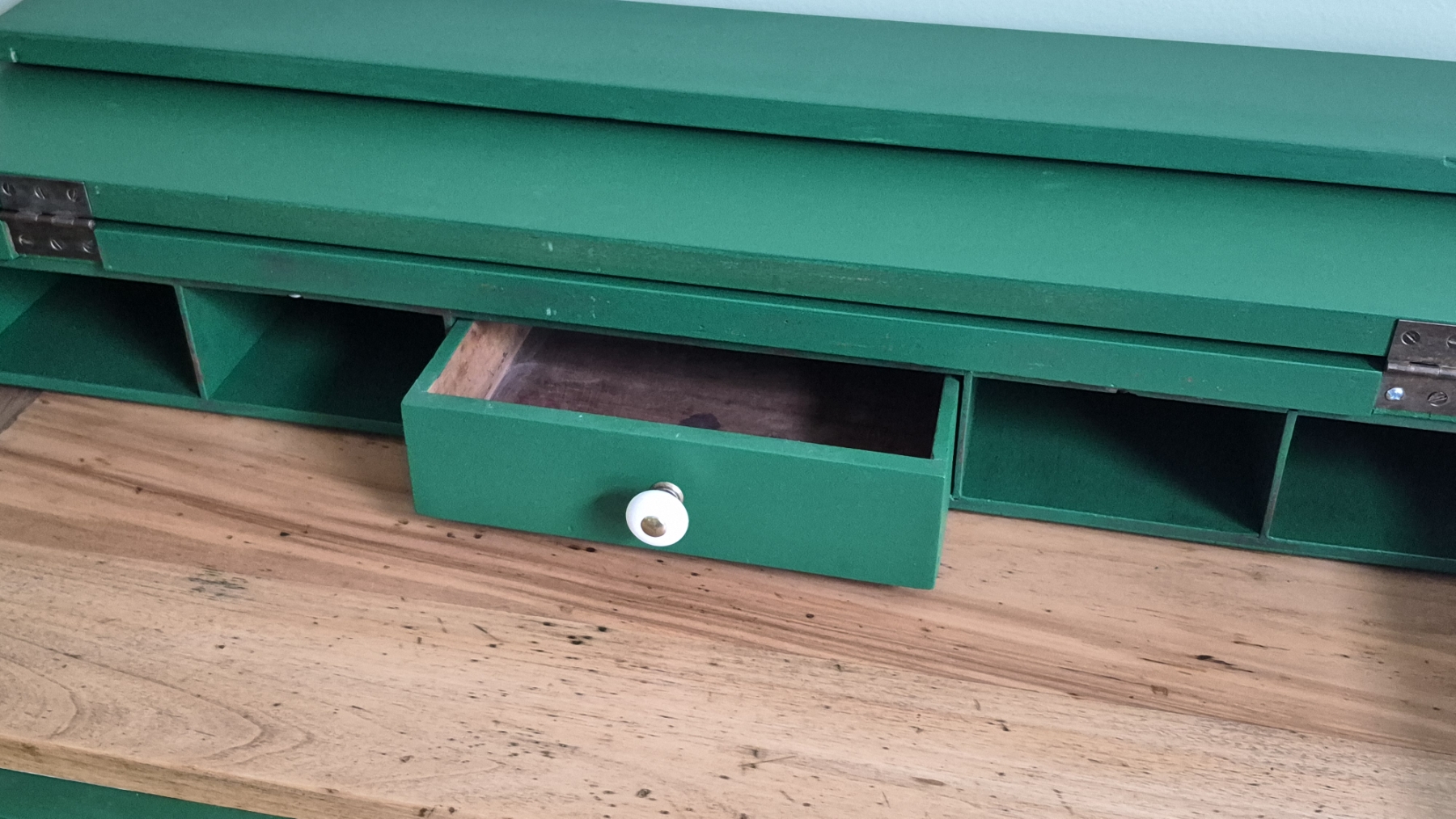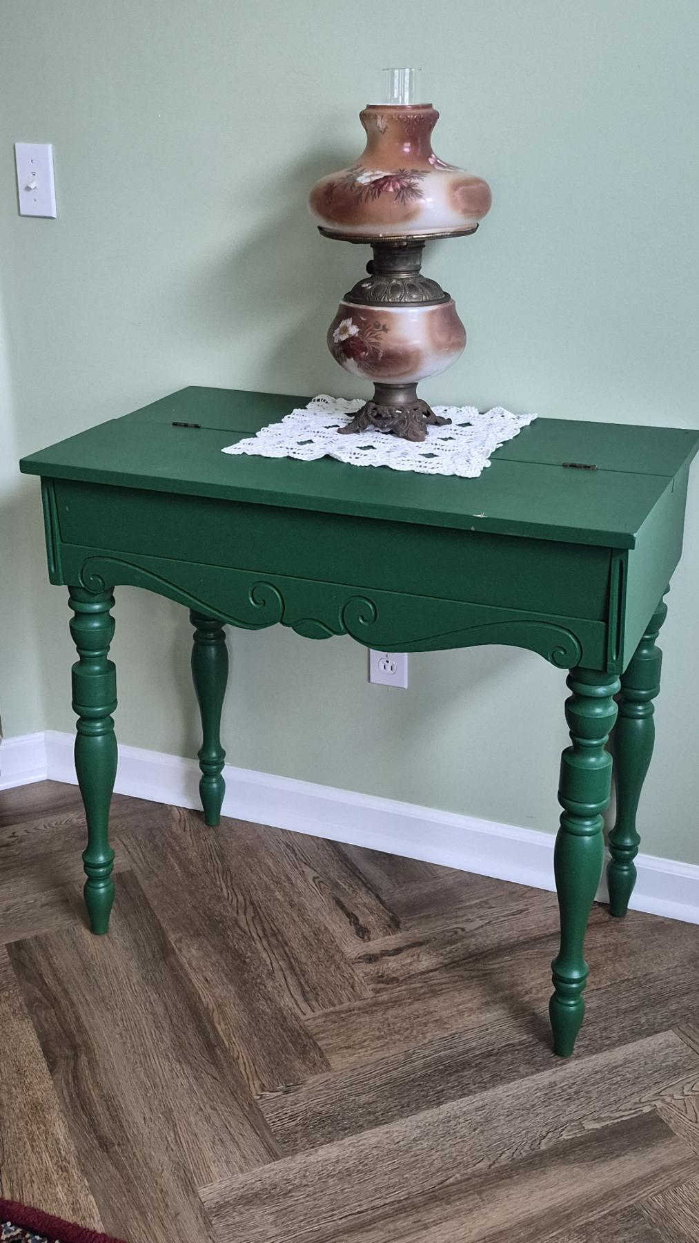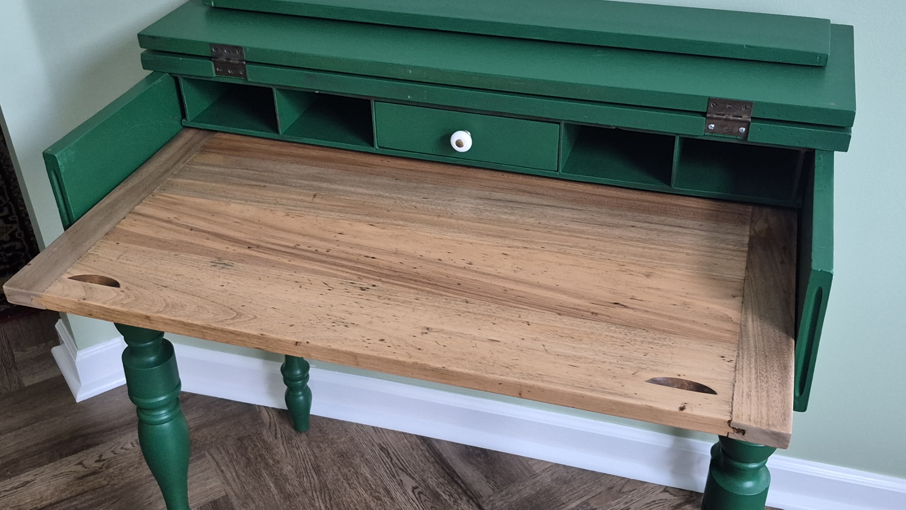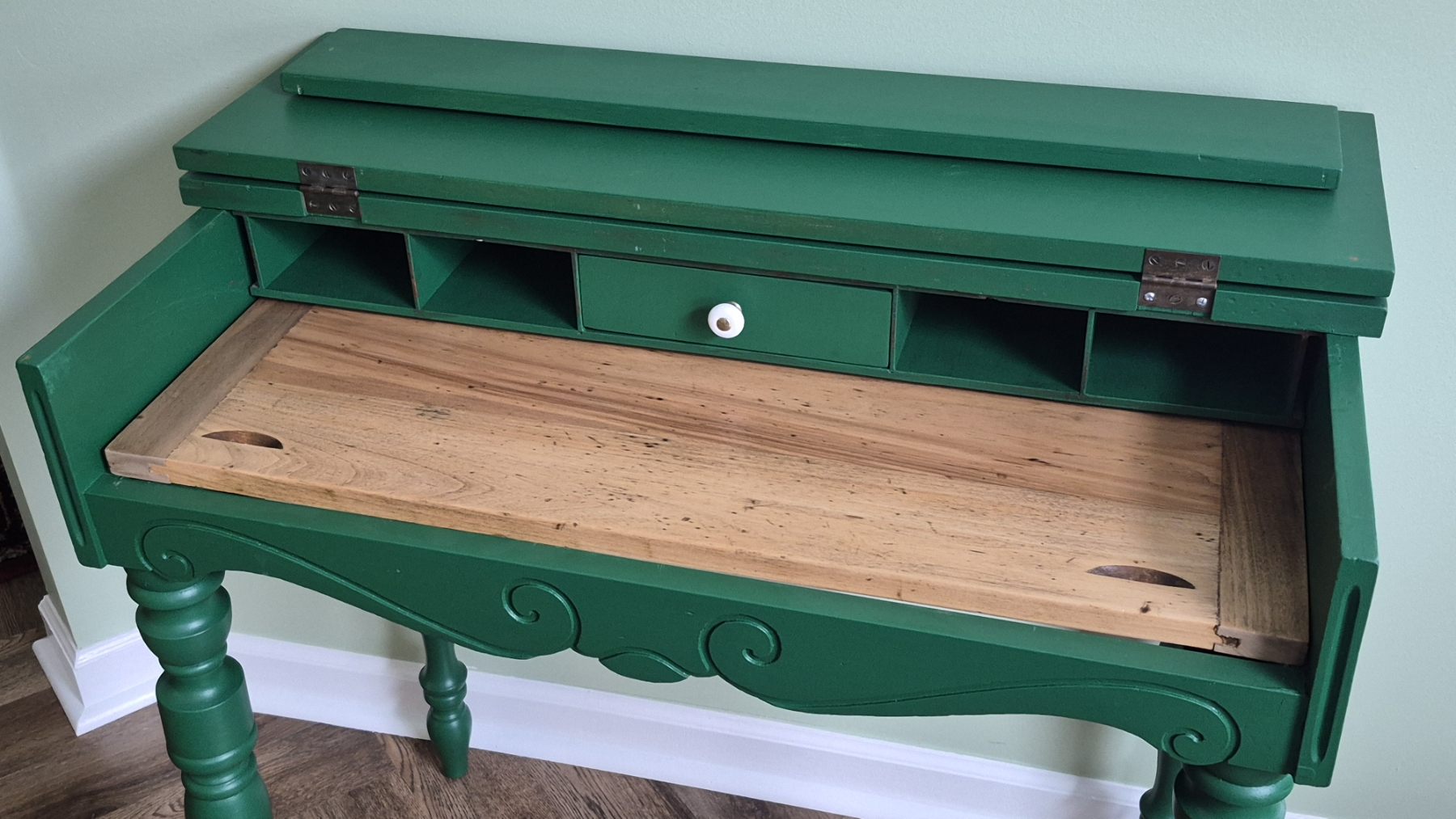 PICKUP IN NORTHFIELD - Antique Restored Fold Top Desk - Natural Finish Was Painted In Forest Green, and a new slide out hardwood insert - See Pics - (All Items noting "Pickup In Northfield" will be available the following Saturday after this auction ends. Other items in this auction will be available at our Louisville Office. Winners of Northfield items will be notified with the address and times, after the auction closes.)
