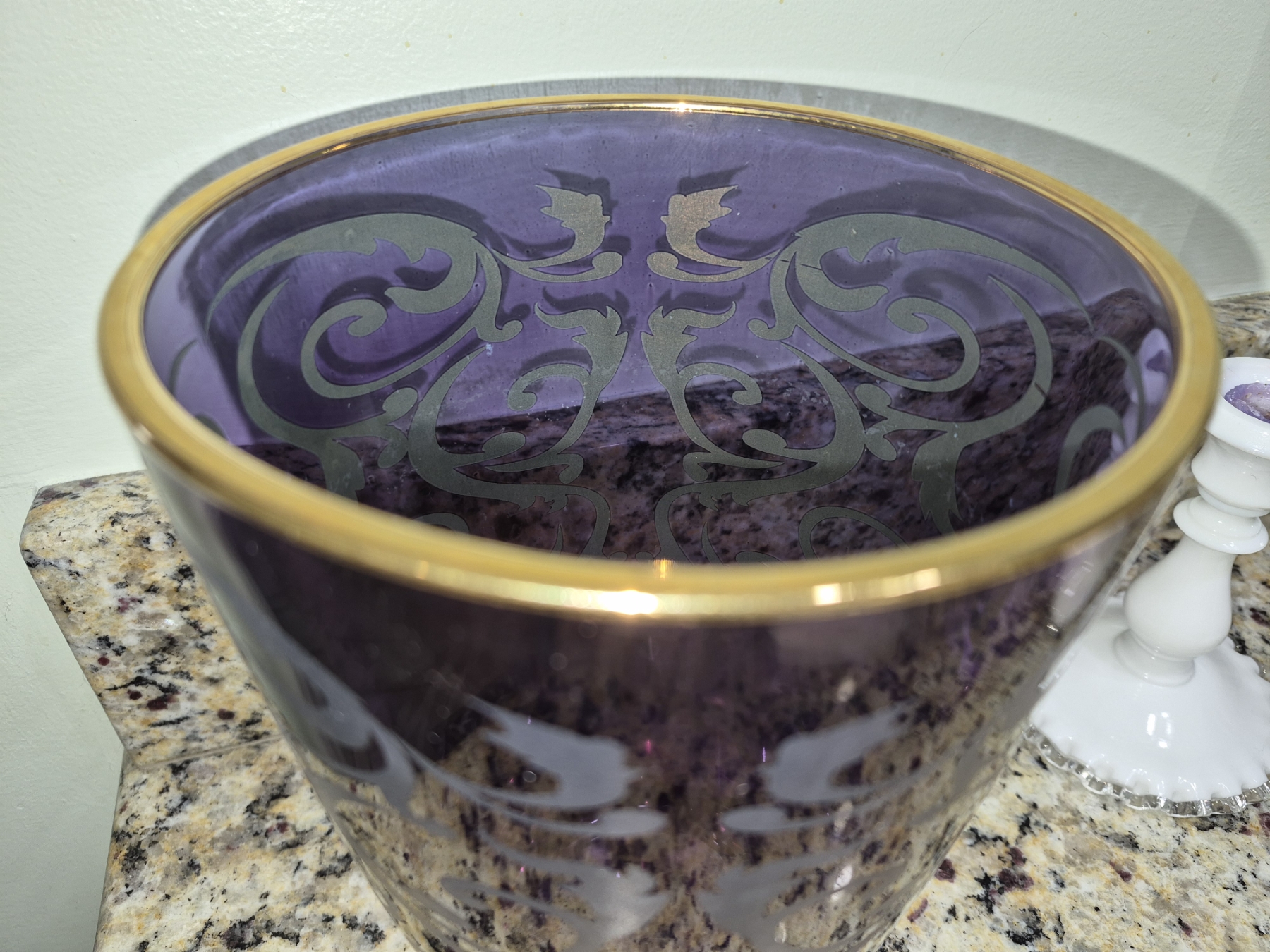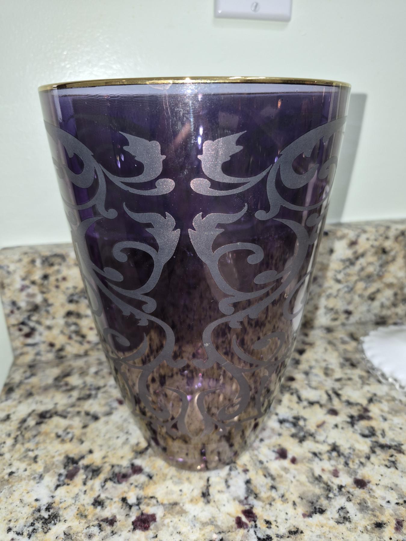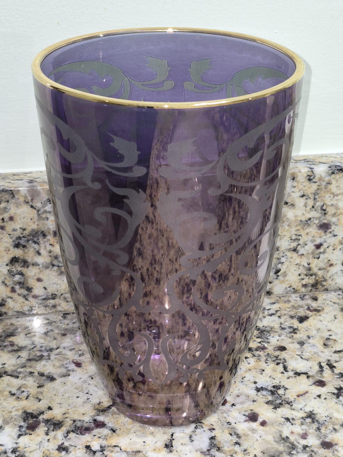 PICKUP IN NORTHFIELD - Art Glass Decorated Vase With Gold Rim 9.5" x 6.5" Excellent Cond - See Pics - (All Items noting "Pickup In Northfield" will be available the following Saturday after this auction ends. Other items in this auction will be available at our Louisville Office. Winners of Northfield items will be notified with the address and times, after the auction closes.)