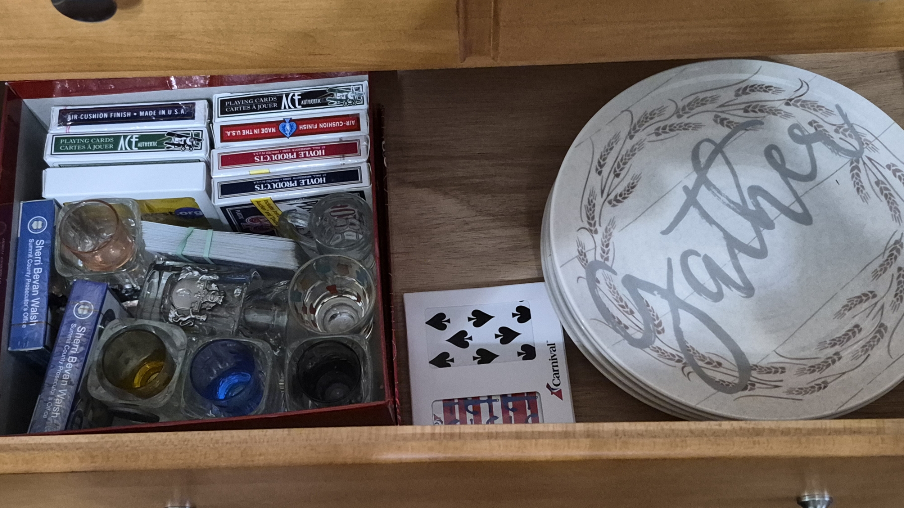 PICKUP IN NORTHFIELD - Contents Of Drawers As Shown Includes Candle Holders Playing Cards & More - See Pics - (All Items noting "Pickup In Northfield" will be available the following Saturday after this auction ends. Other items in this auction will be available at our Louisville Office. Winners of Northfield items will be notified with the address and times, after the auction closes.)