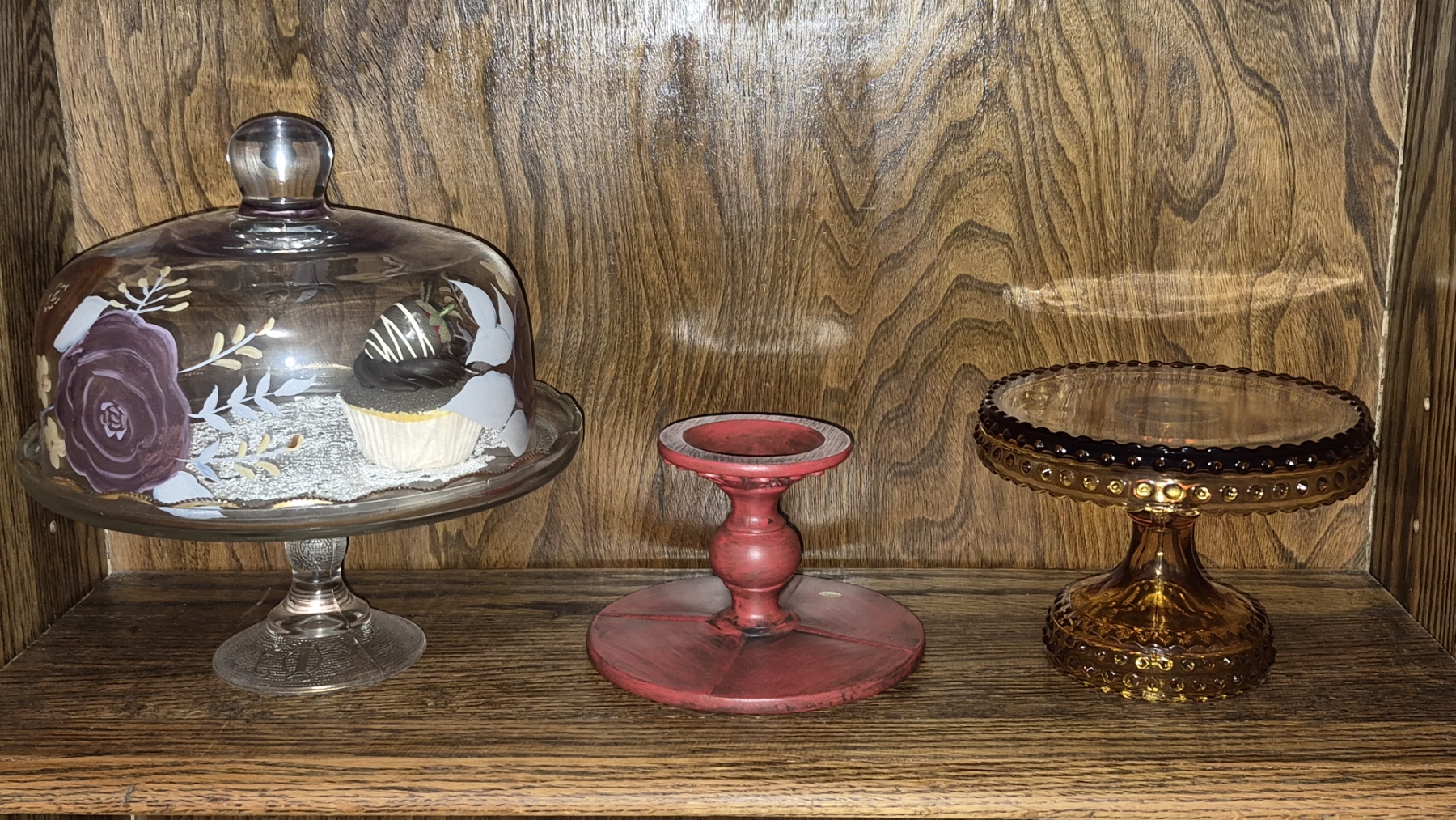 PICKUP IN NORTHFIELD - Contents On Shelf As Shown, Cake Stand Candle Stick & Raised Cake Stand- See Pics - (All Items noting "Pickup In Northfield" will be available the following Saturday after this auction ends. Other items in this auction will be available at our Louisville Office. Winners of Northfield items will be notified with the address and times, after the auction closes.)