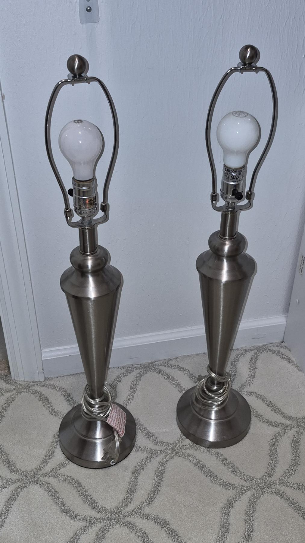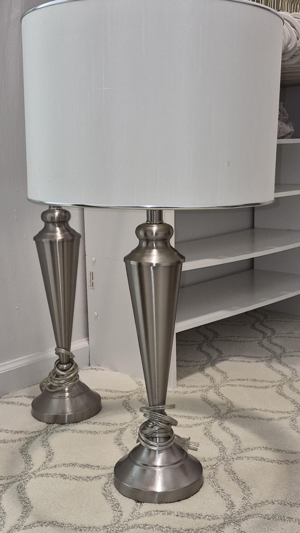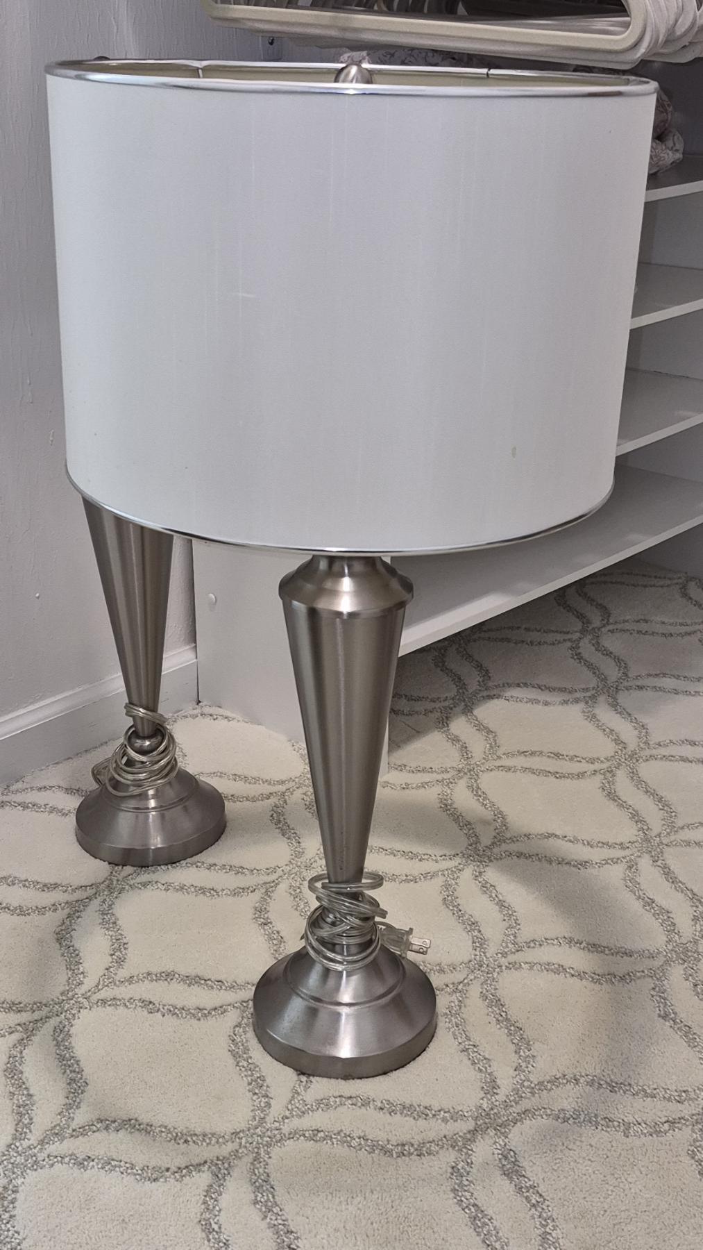 PICKUP IN NORTHFIELD - Excellent 2 Pcs Lamp Set With Shades Brushed Nickel 28" Tall shades Are 10 x 15 - See Pics - (All Items noting "Pickup In Northfield" will be available the following Saturday after this auction ends. Other items in this auction will be available at our Louisville Office. Winners of Northfield items will be notified with the address and times, after the auction closes.)