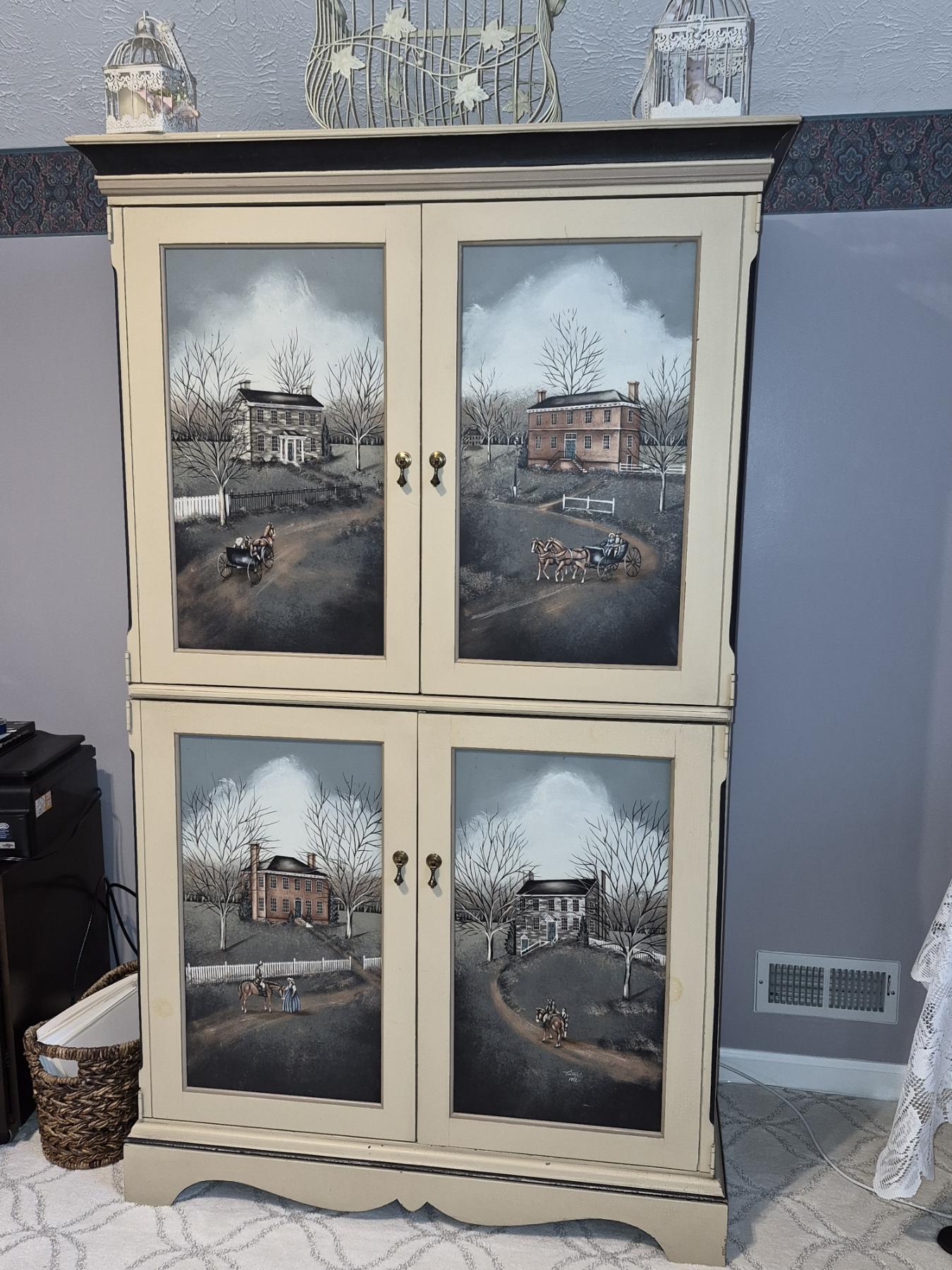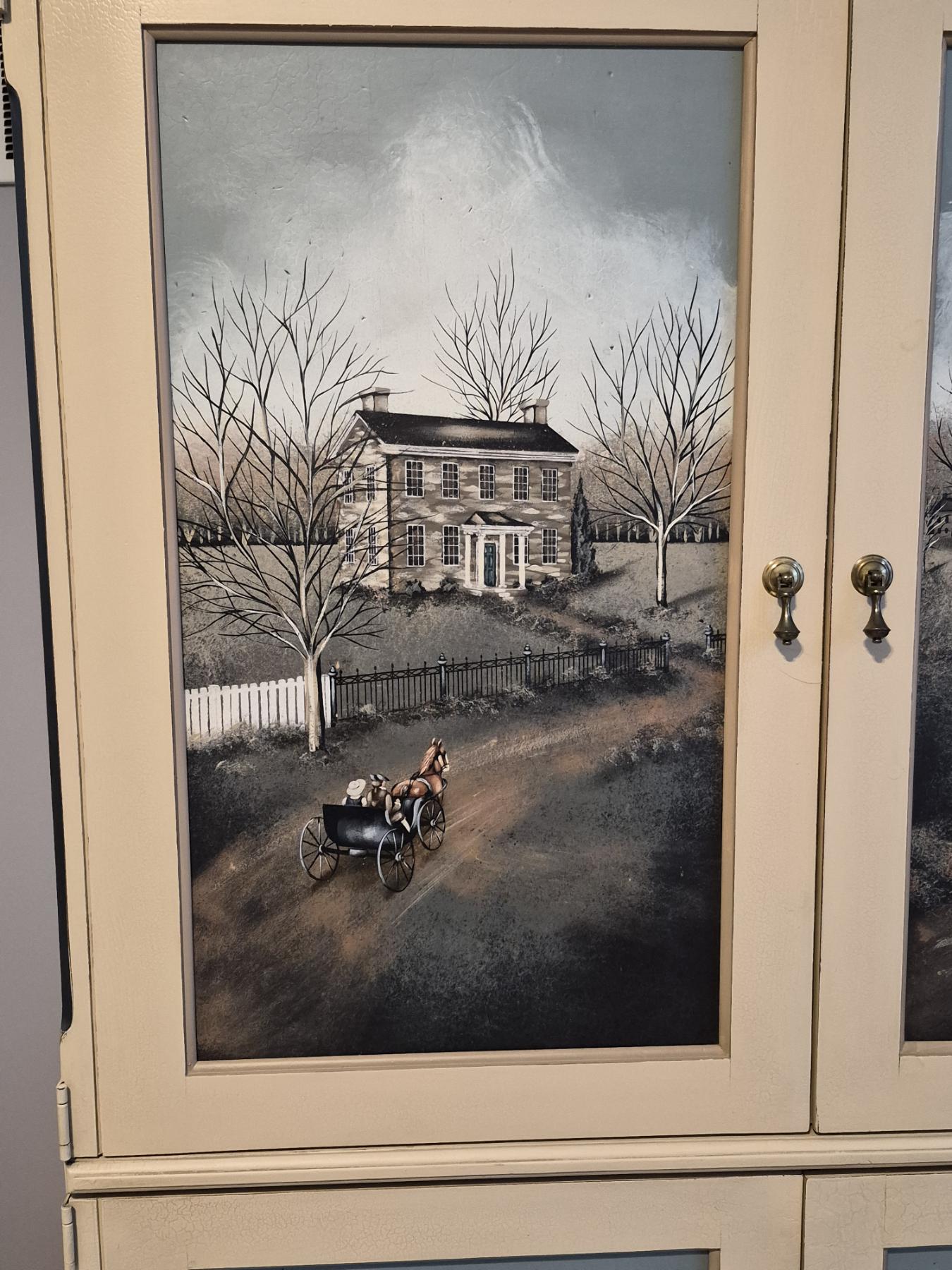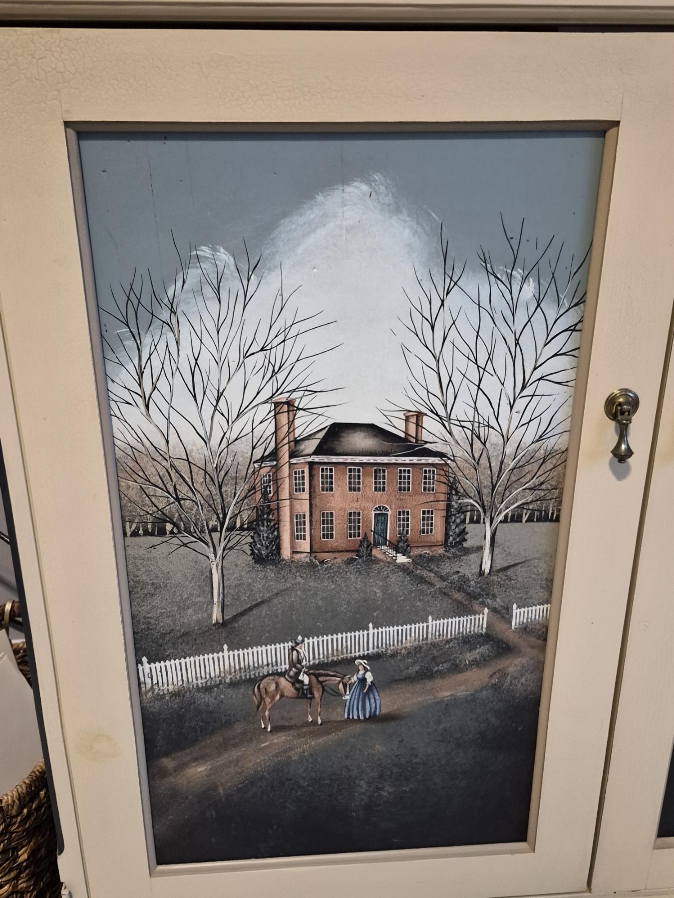 PICKUP IN NORTHFIELD - Exceptional Country Themed Folk Art Painted Cabinet Measures 72" x 40" x 20" Pristine condition - See Pics - (All Items noting "Pickup In Northfield" will be available the following Saturday after this auction ends. Other items in this auction will be available at our Louisville Office. Winners of Northfield items will be notified with the address and times, after the auction closes.)