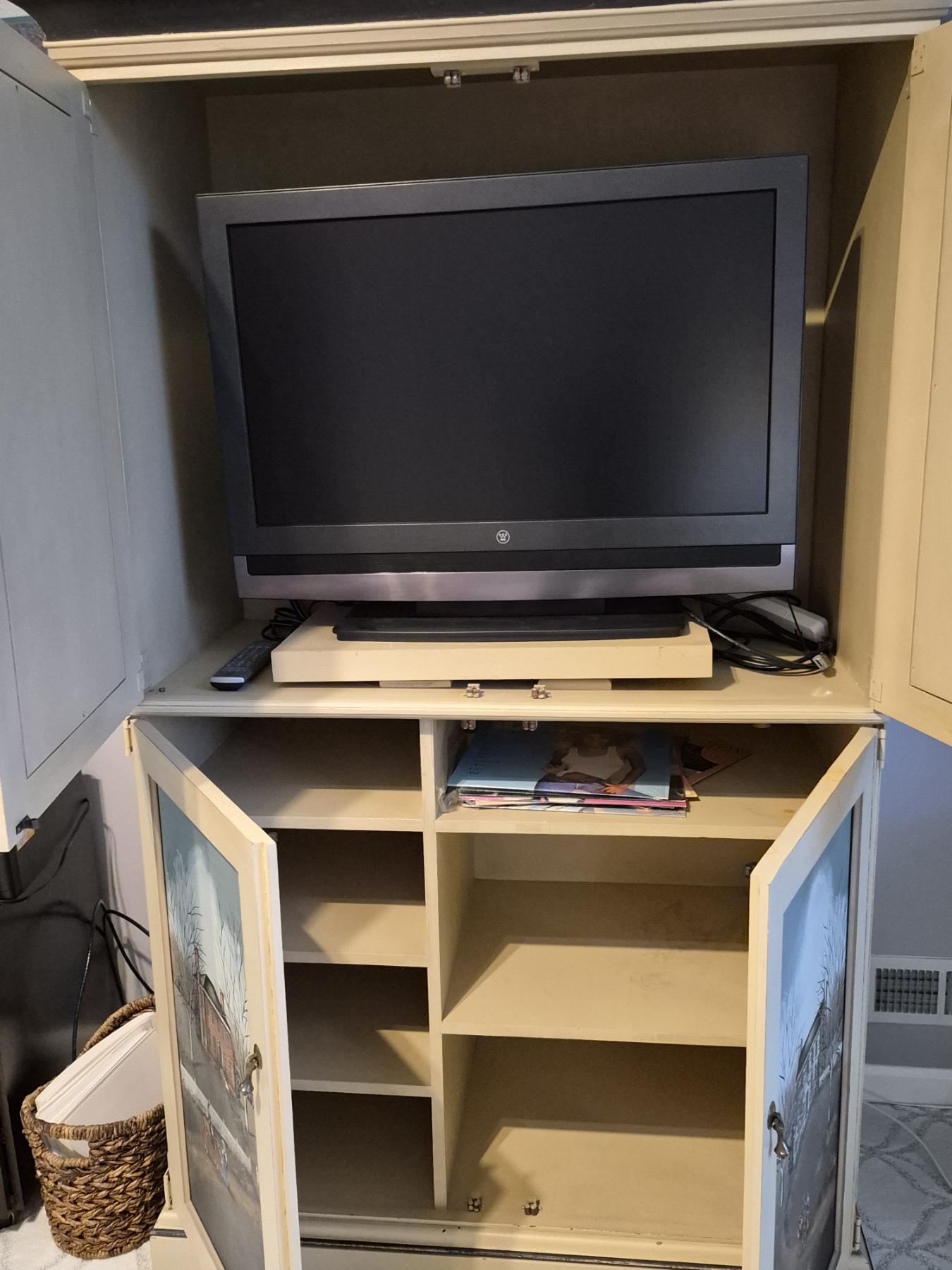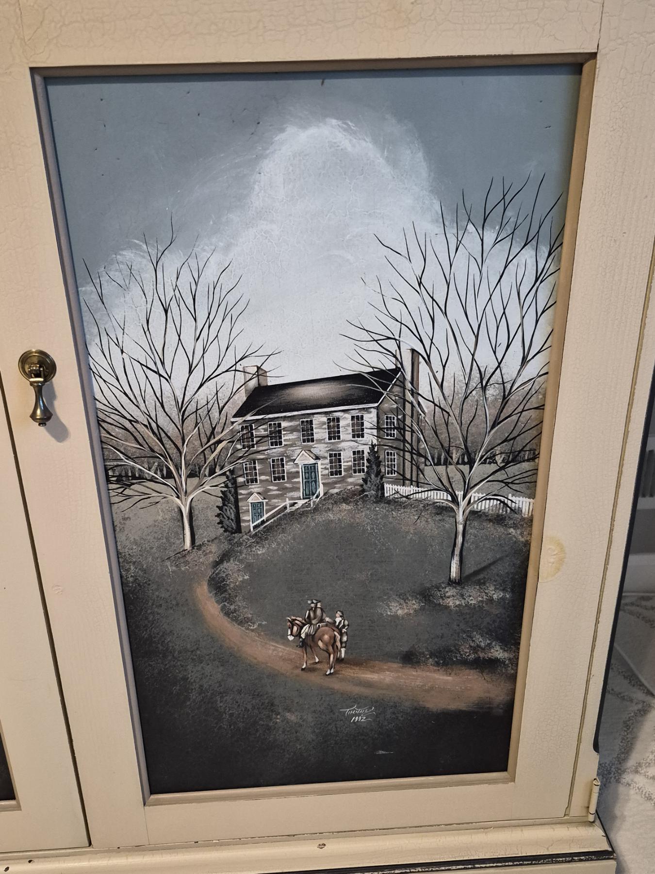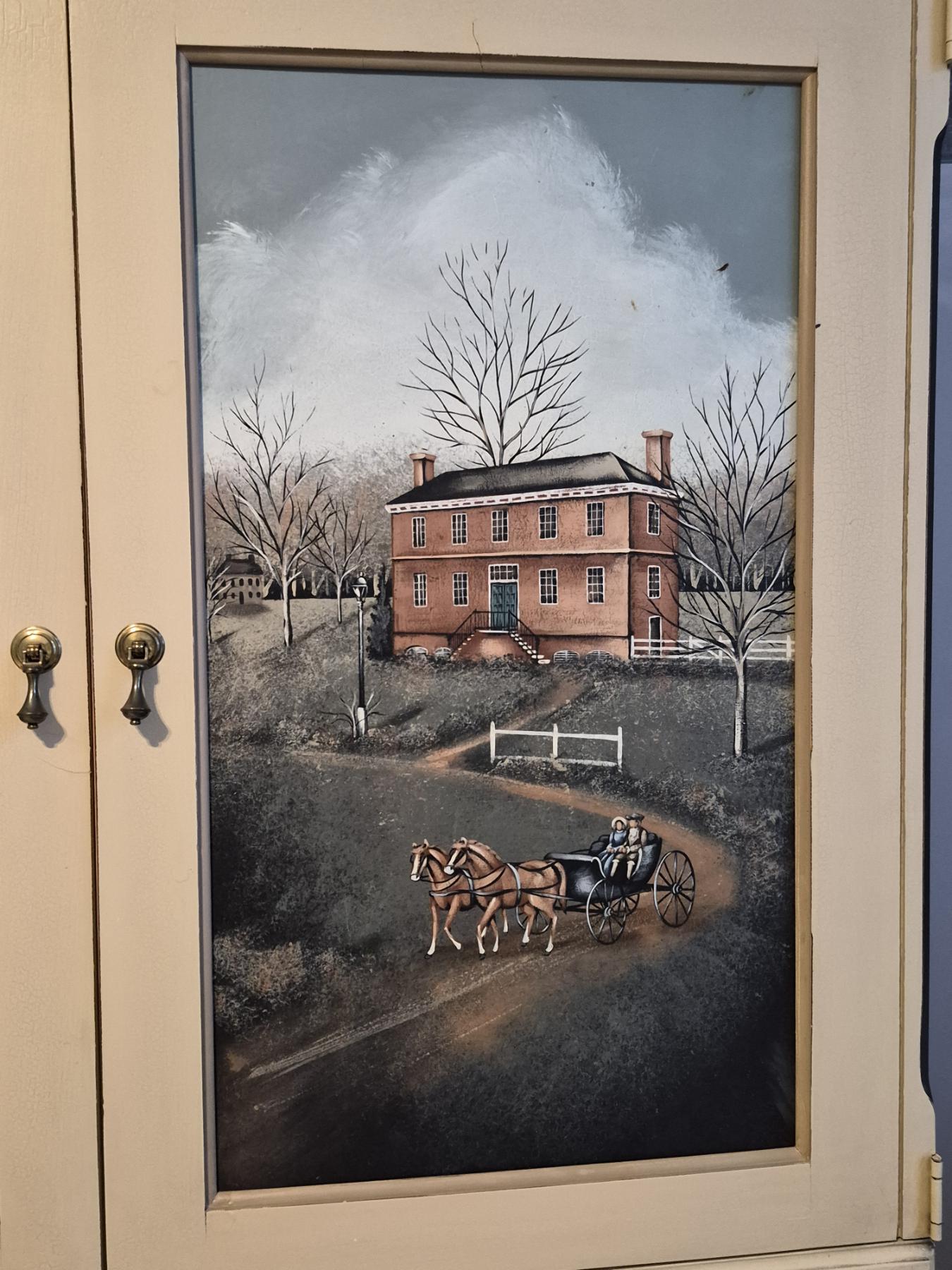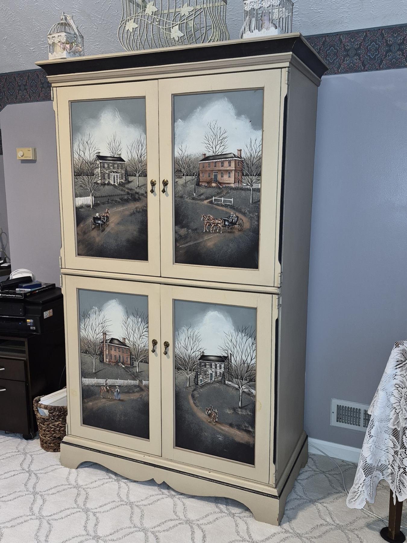 PICKUP IN NORTHFIELD - Exceptional Country Themed Folk Art Painted Cabinet Measures 72" x 40" x 20" Pristine condition - See Pics - (All Items noting "Pickup In Northfield" will be available the following Saturday after this auction ends. Other items in this auction will be available at our Louisville Office. Winners of Northfield items will be notified with the address and times, after the auction closes.)