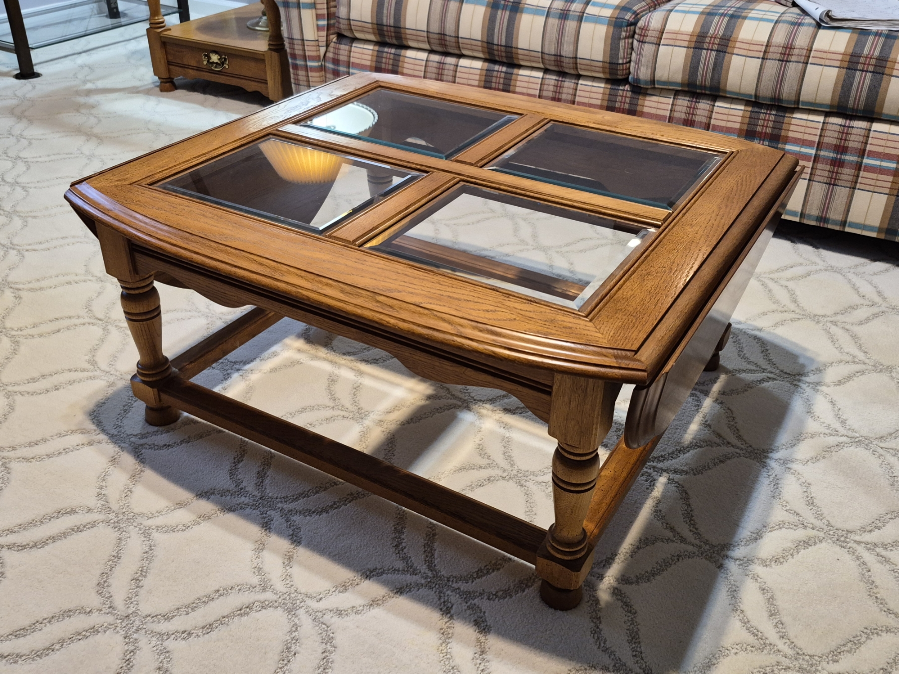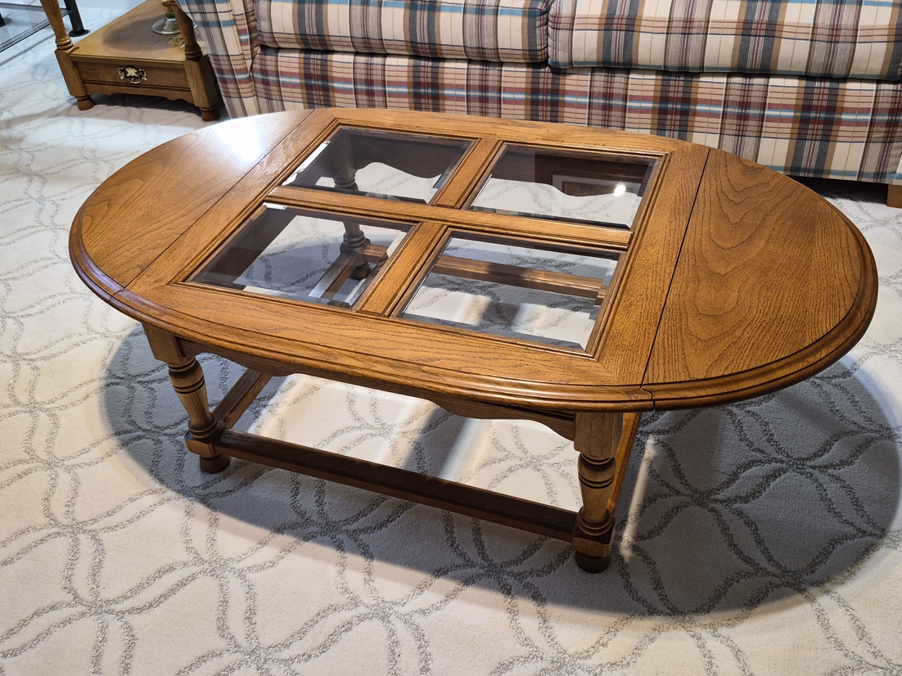 PICKUP IN NORTHFIELD - Hardwood Oak Flip Down Ends Coffee Table Glass Top Excellent - See Pics - (All Items noting "Pickup In Northfield" will be available the following Saturday after this auction ends. Other items in this auction will be available at our Louisville Office. Winners of Northfield items will be notified with the address and times, after the auction closes.)