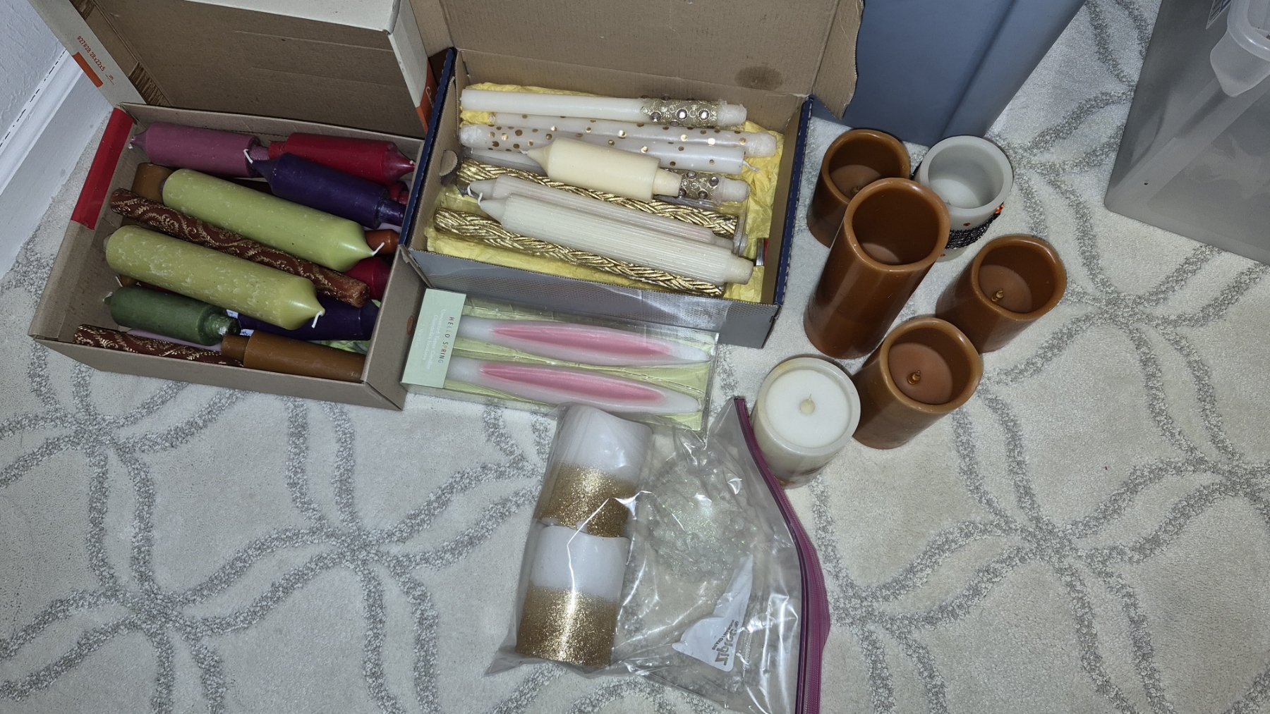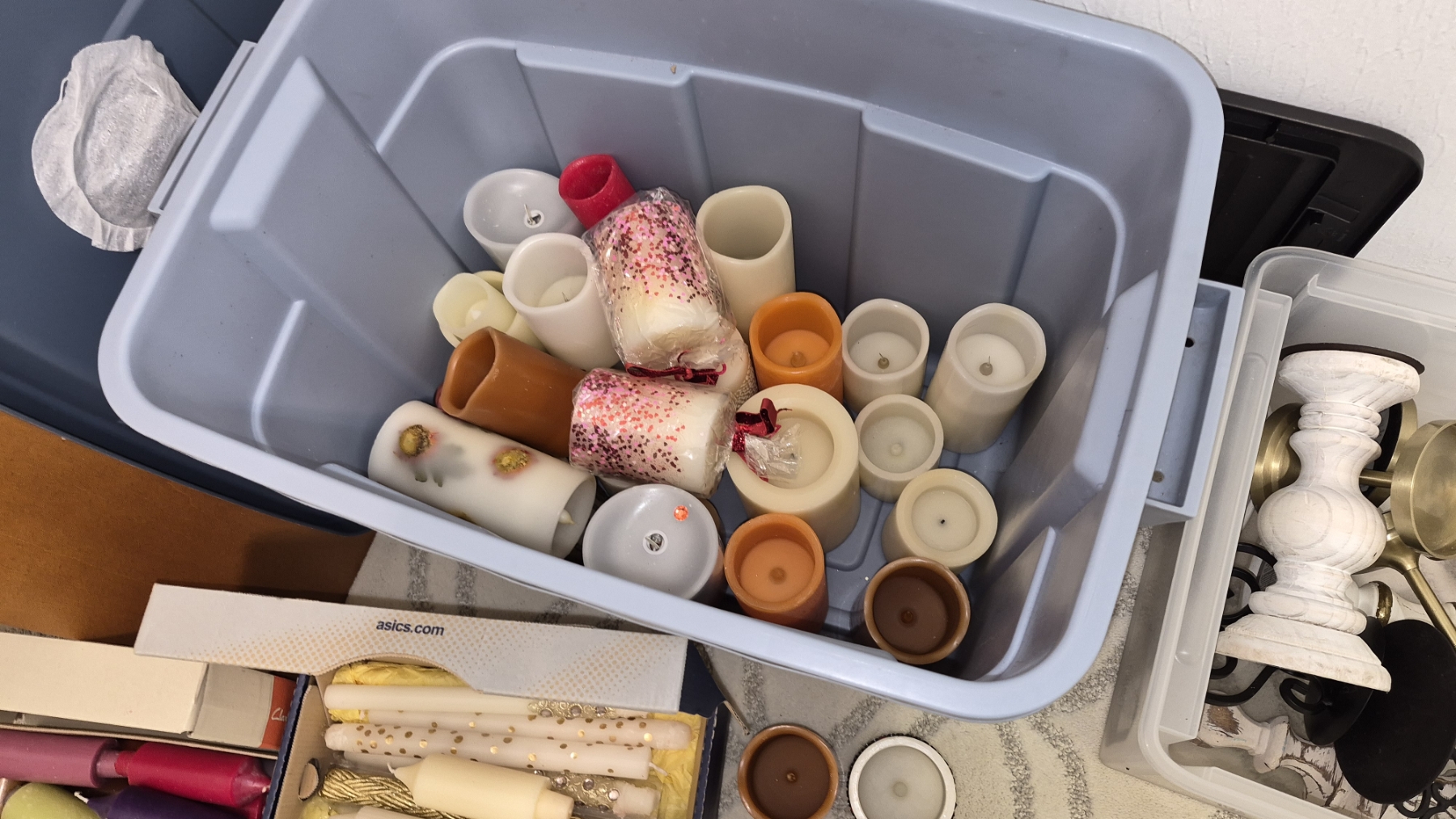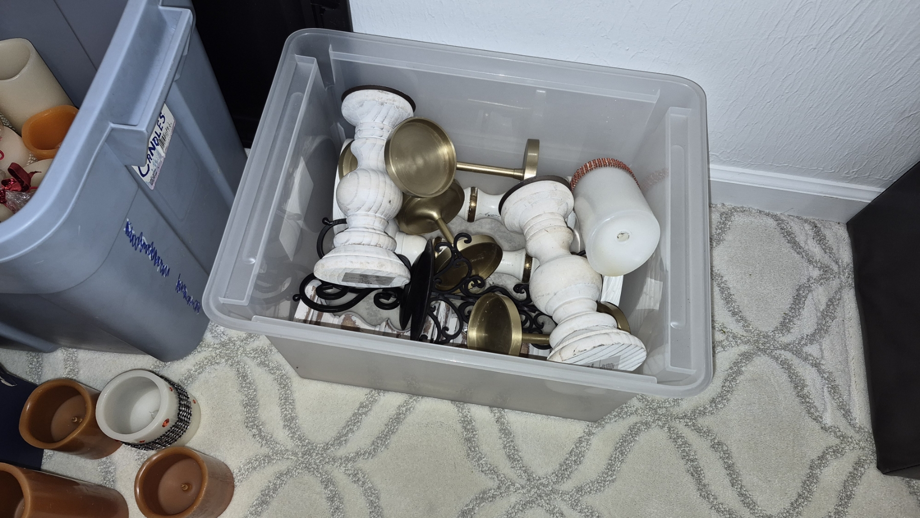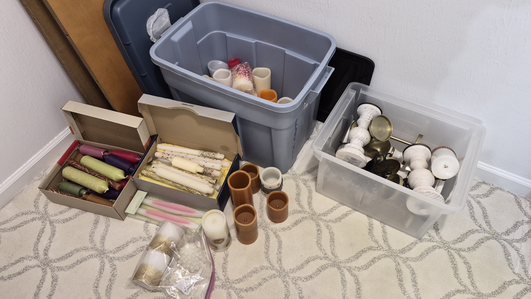 PICKUP IN NORTHFIELD - Large Grouping: Totes Of Candlesticks & Candles As Shown - See Pics - (All Items noting "Pickup In Northfield" will be available the following Saturday after this auction ends. Other items in this auction will be available at our Louisville Office. Winners of Northfield items will be notified with the address and times, after the auction closes.)