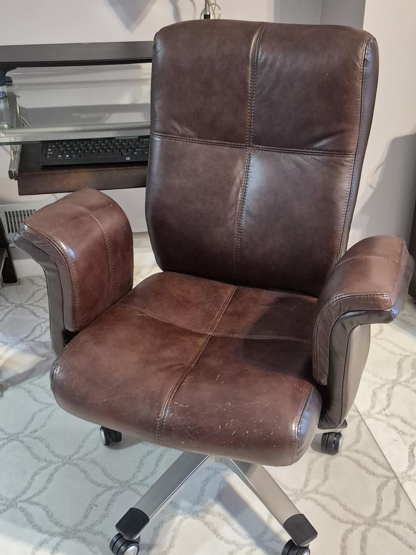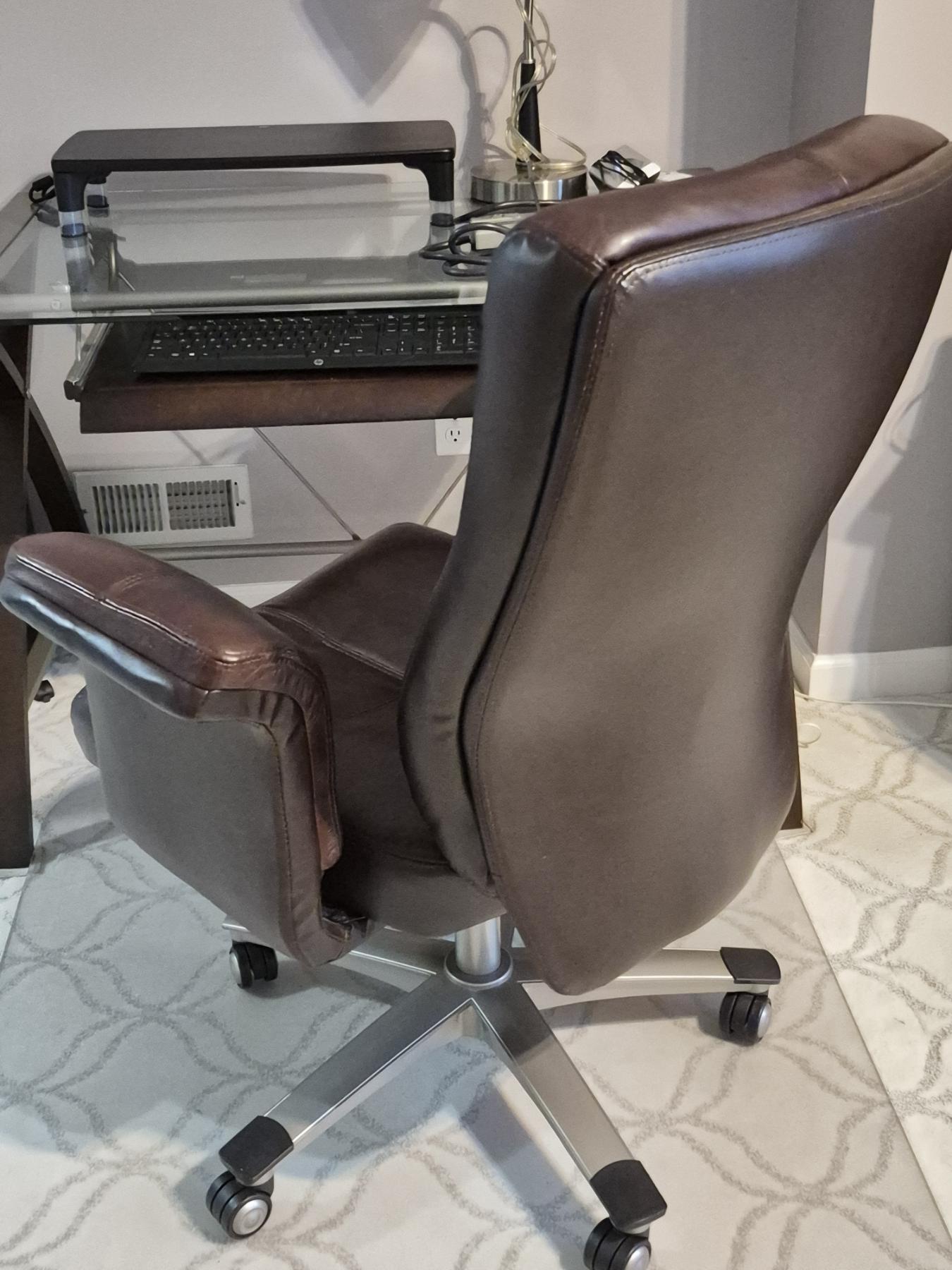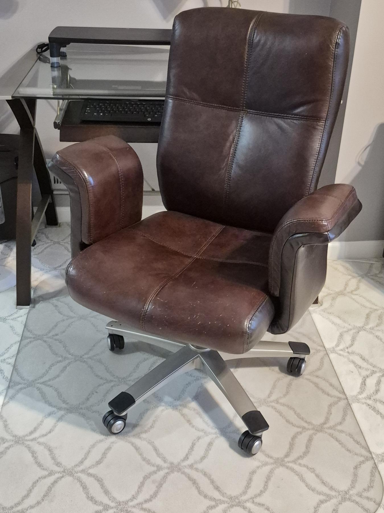 PICKUP IN NORTHFIELD - Nice Leather Office Chair As Shown With Glass Floor Protector - Excellent & Very Comfortable - See Pics - (All Items noting "Pickup In Northfield" will be available the following Saturday after this auction ends. Other items in this auction will be available at our Louisville Office. Winners of Northfield items will be notified with the address and times, after the auction closes.)