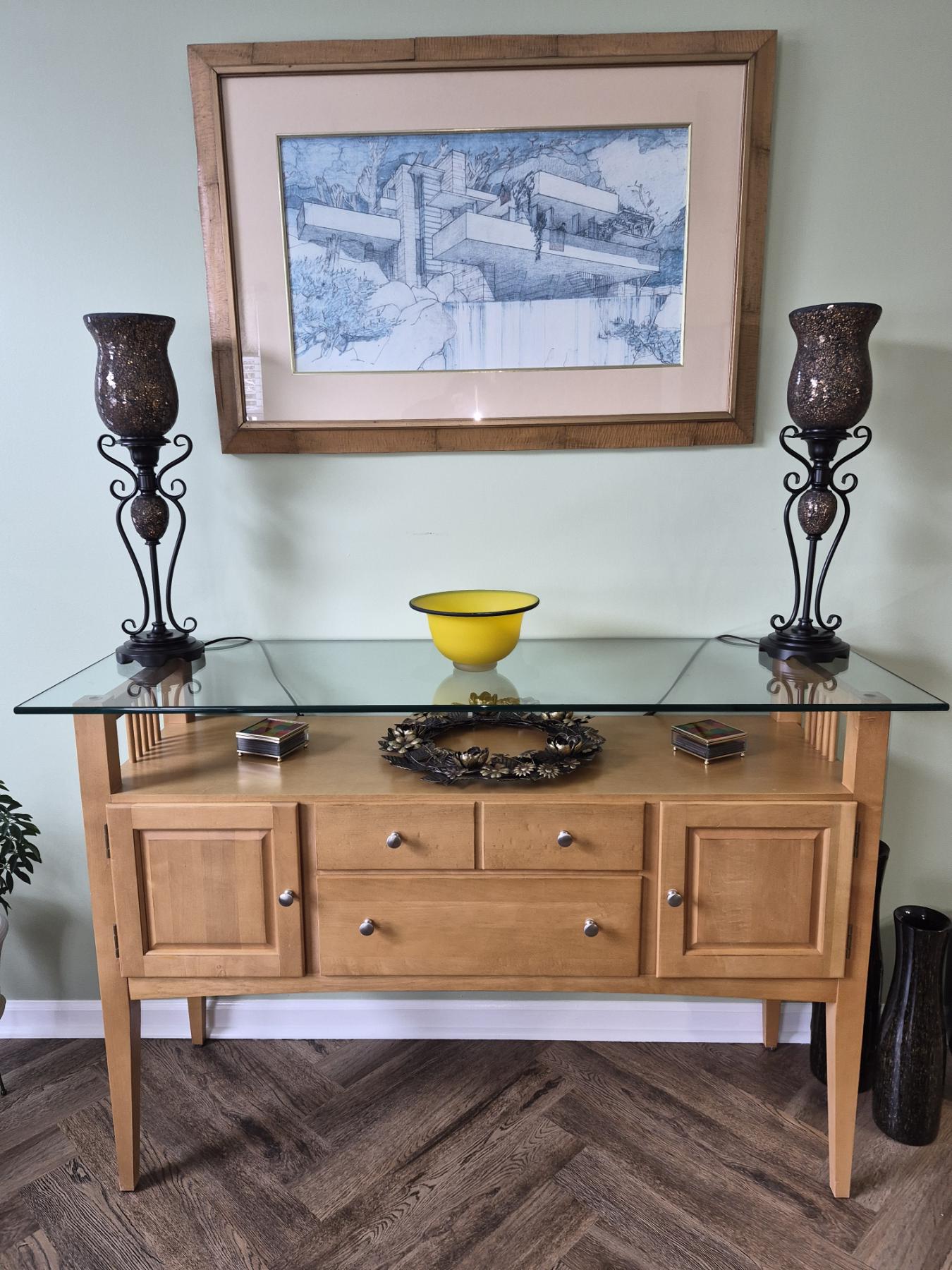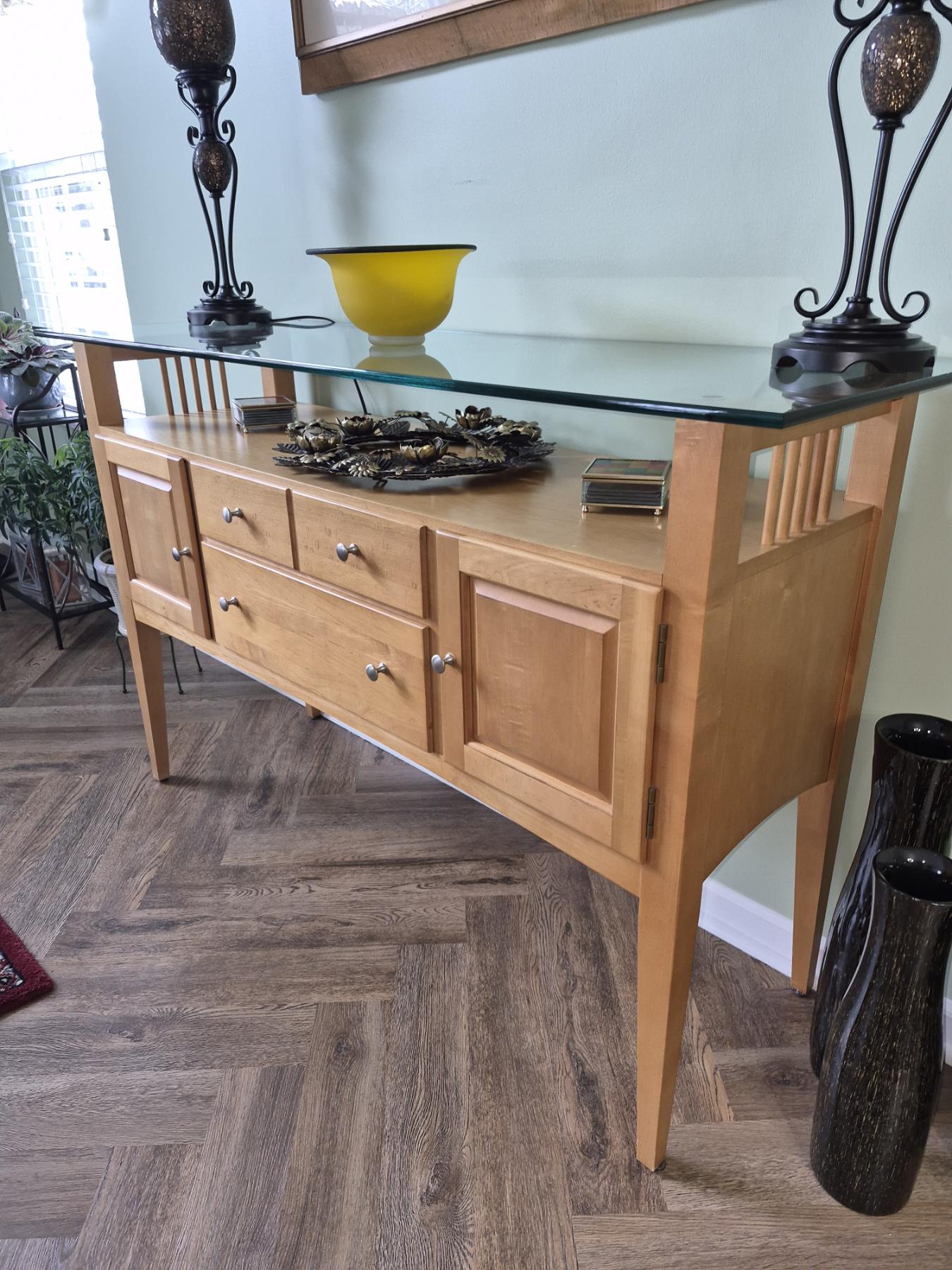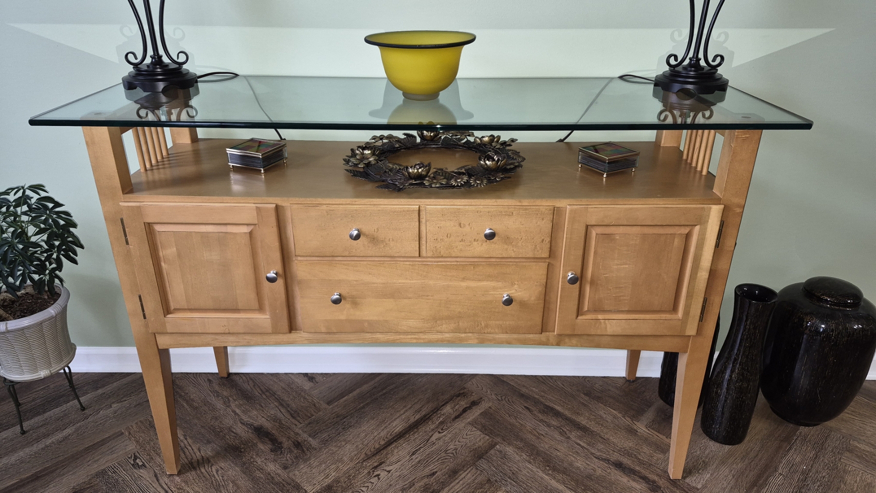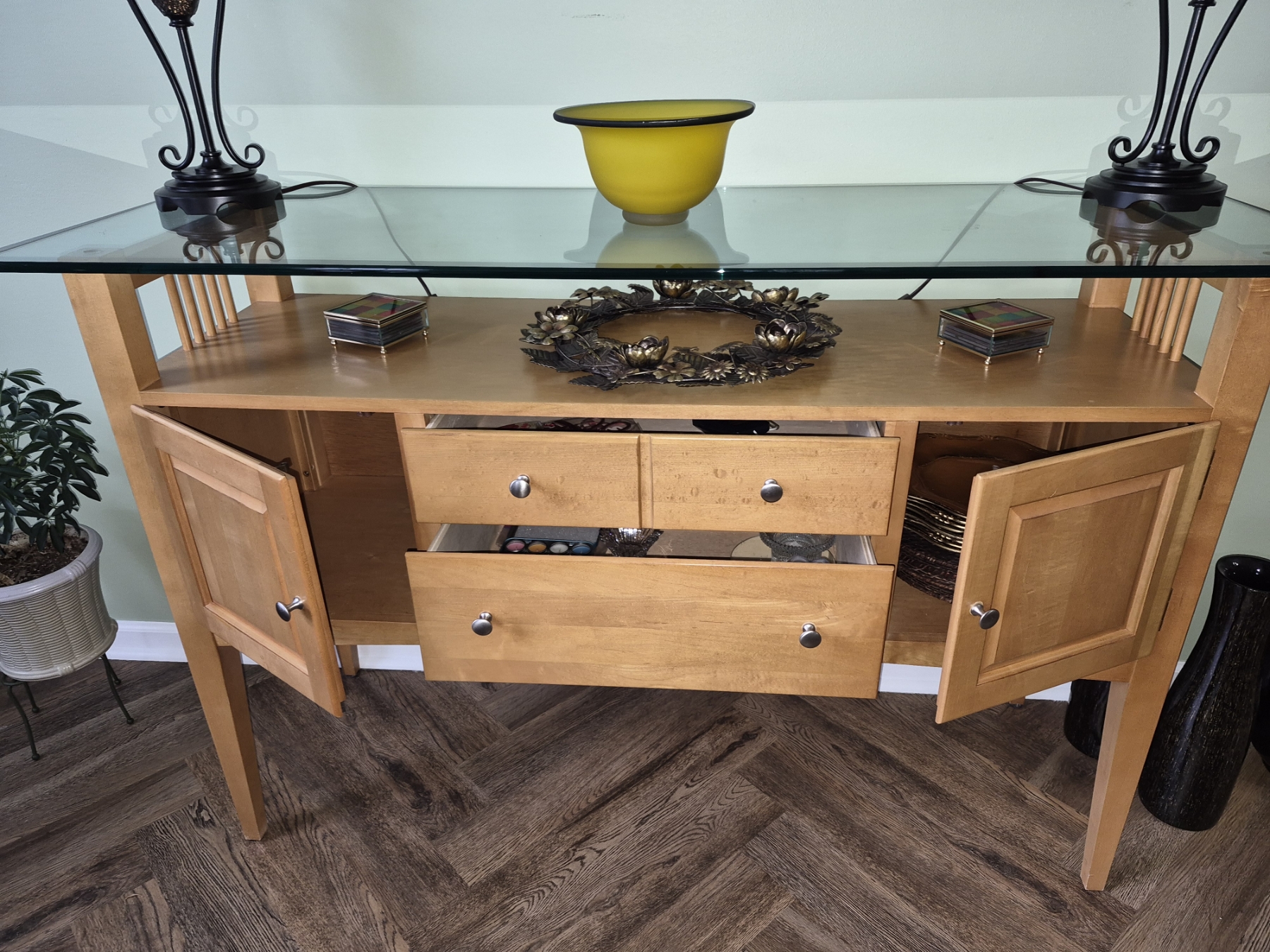 PICKUP IN NORTHFIELD - Perfect Console / Side Table / Cabinet. Cabinet is 54" x 38" with a glass top at 5ft x 20" - See Pics - (All Items noting "Pickup In Northfield" will be available the following Saturday after this auction ends. Other items in this auction will be available at our Louisville Office. Winners of Northfield items will be notified with the address and times, after the auction closes.)