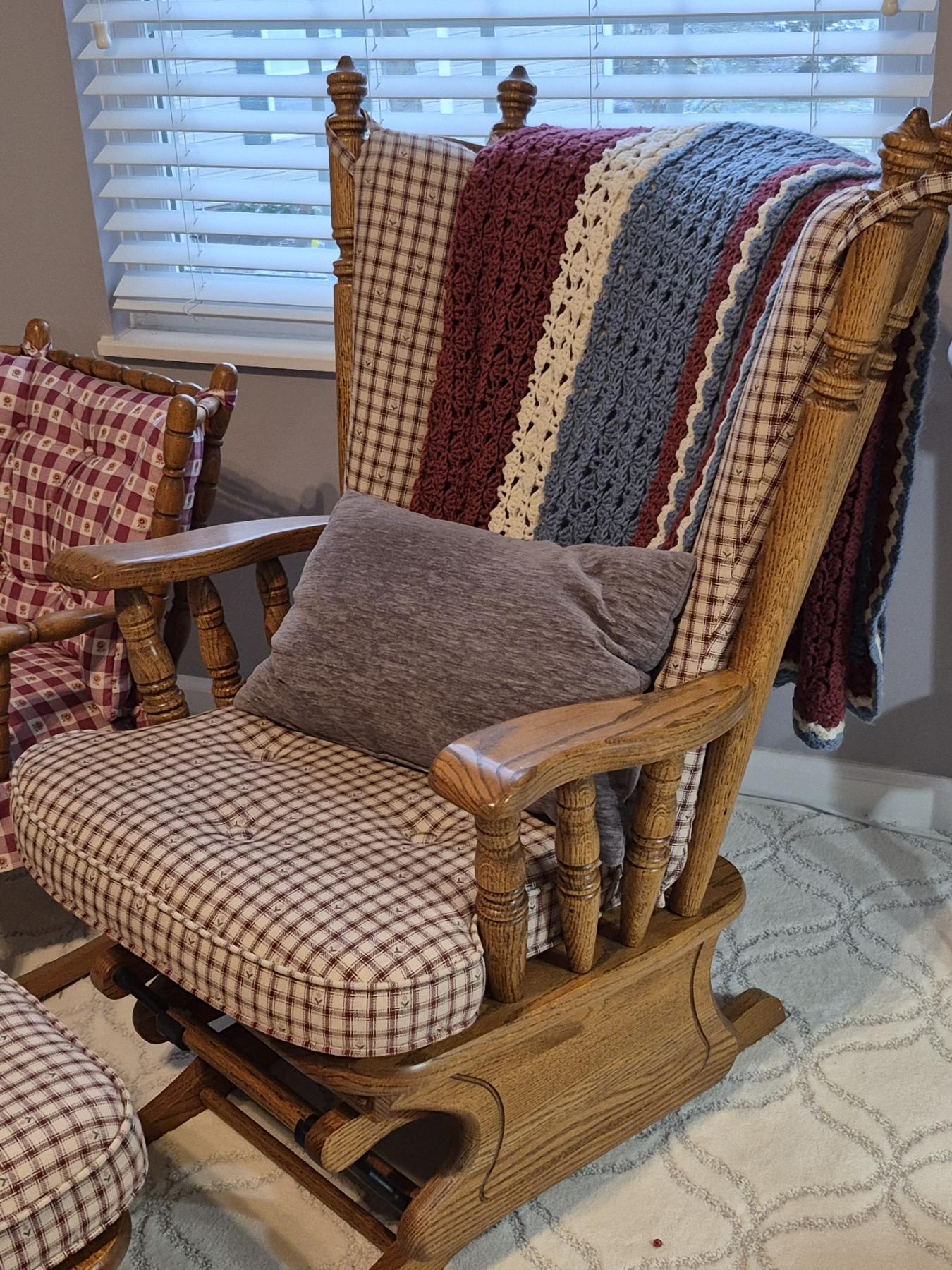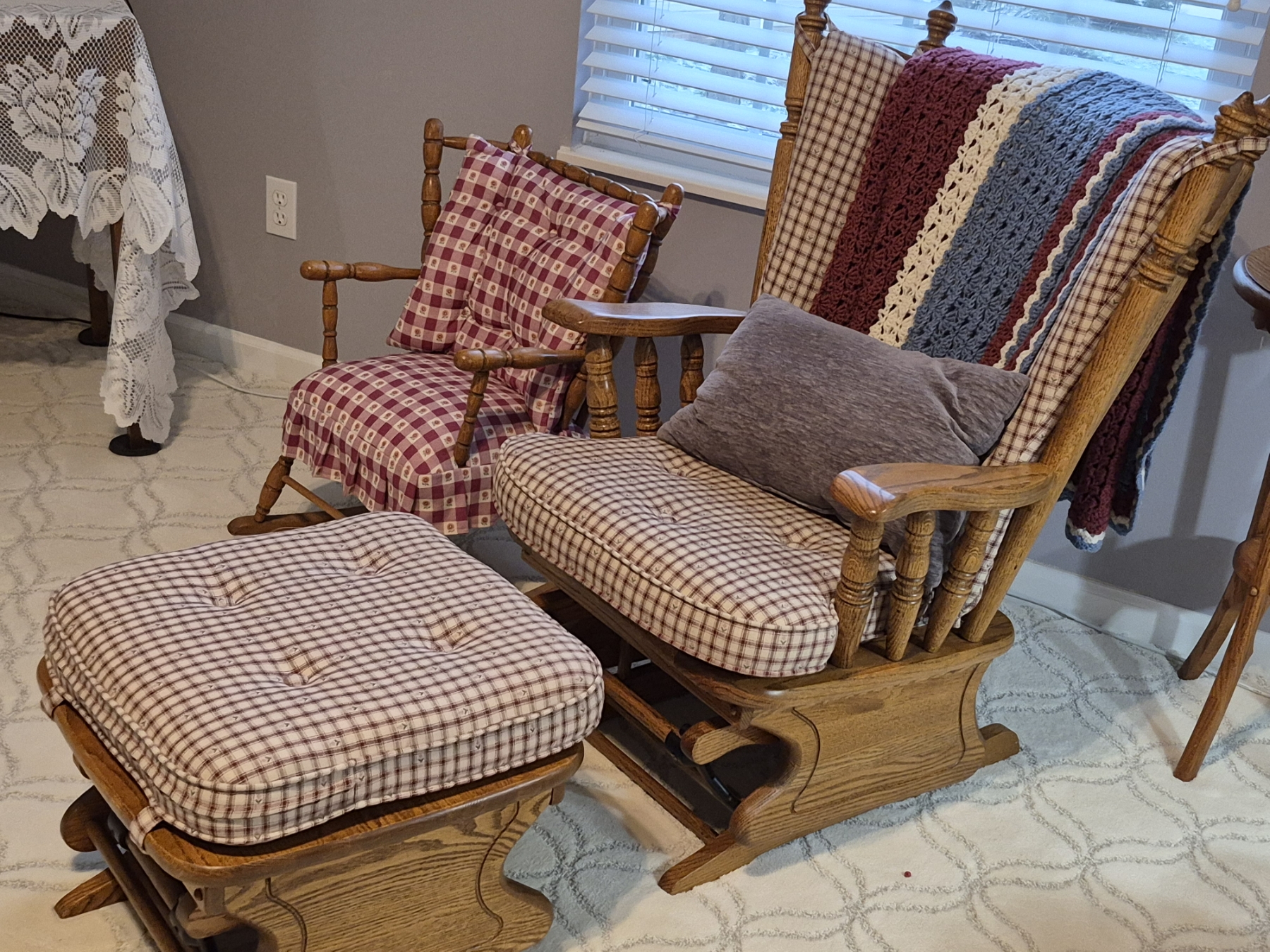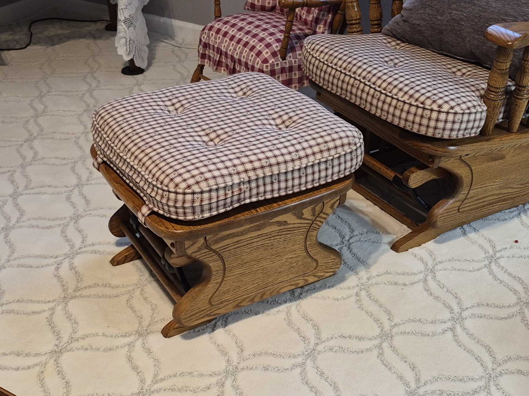 PICKUP IN NORTHFIELD - Quaint Style Solid Oak & Upholstery Rocking Chaie With Sliding Foot Rest Excellent Condition - See Pics - (All Items noting "Pickup In Northfield" will be available the following Saturday after this auction ends. Other items in this auction will be available at our Louisville Office. Winners of Northfield items will be notified with the address and times, after the auction closes.)