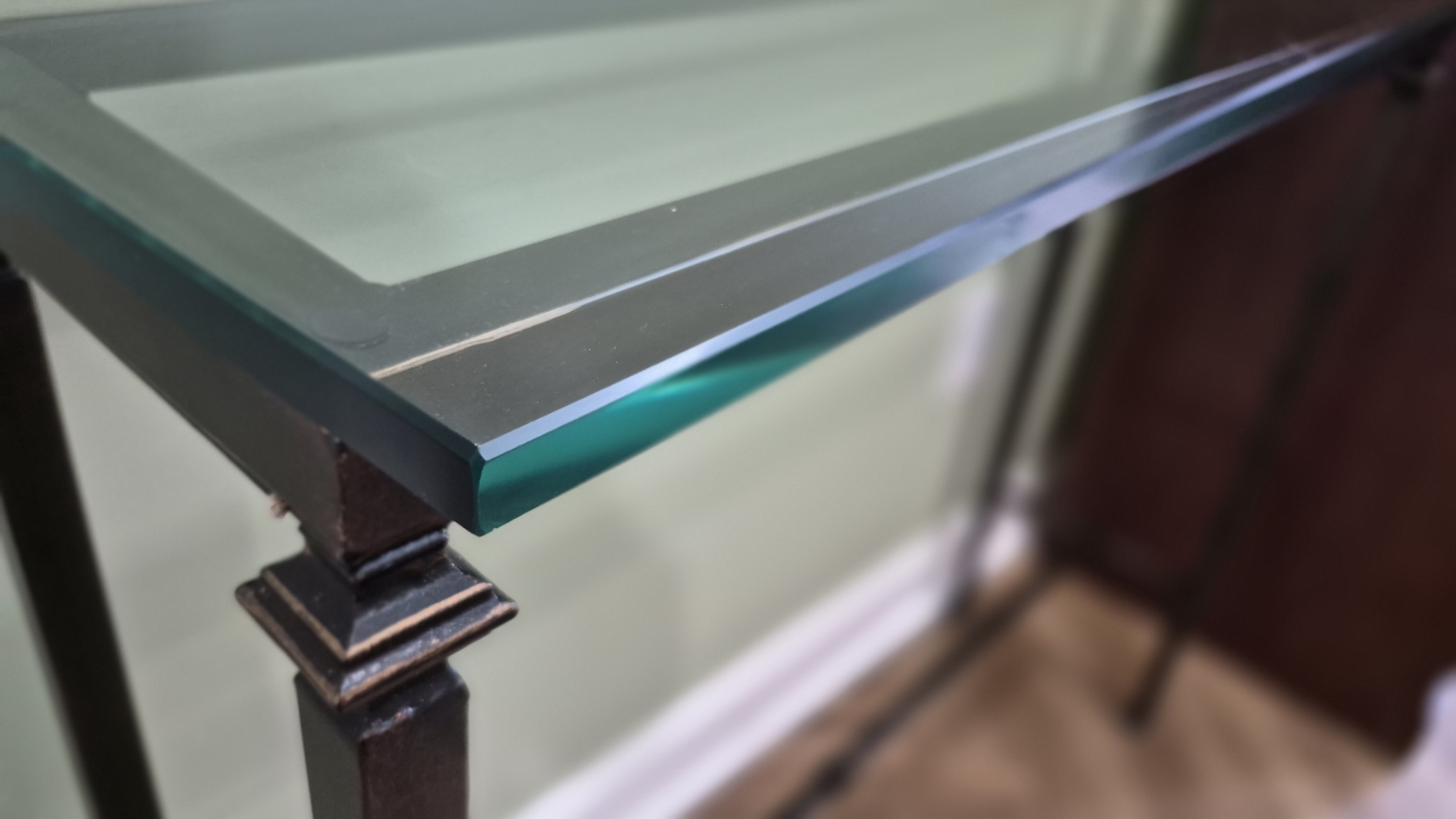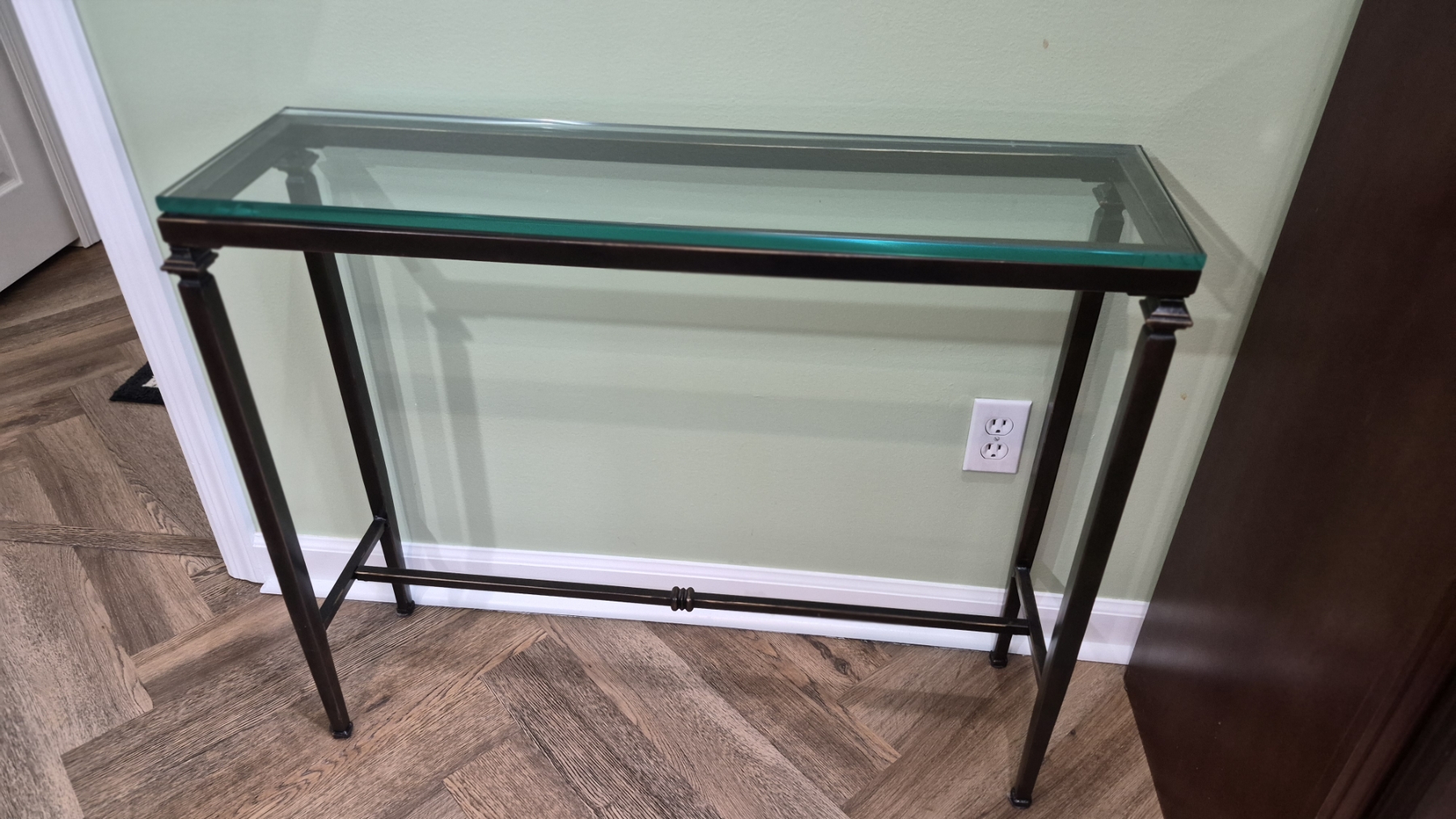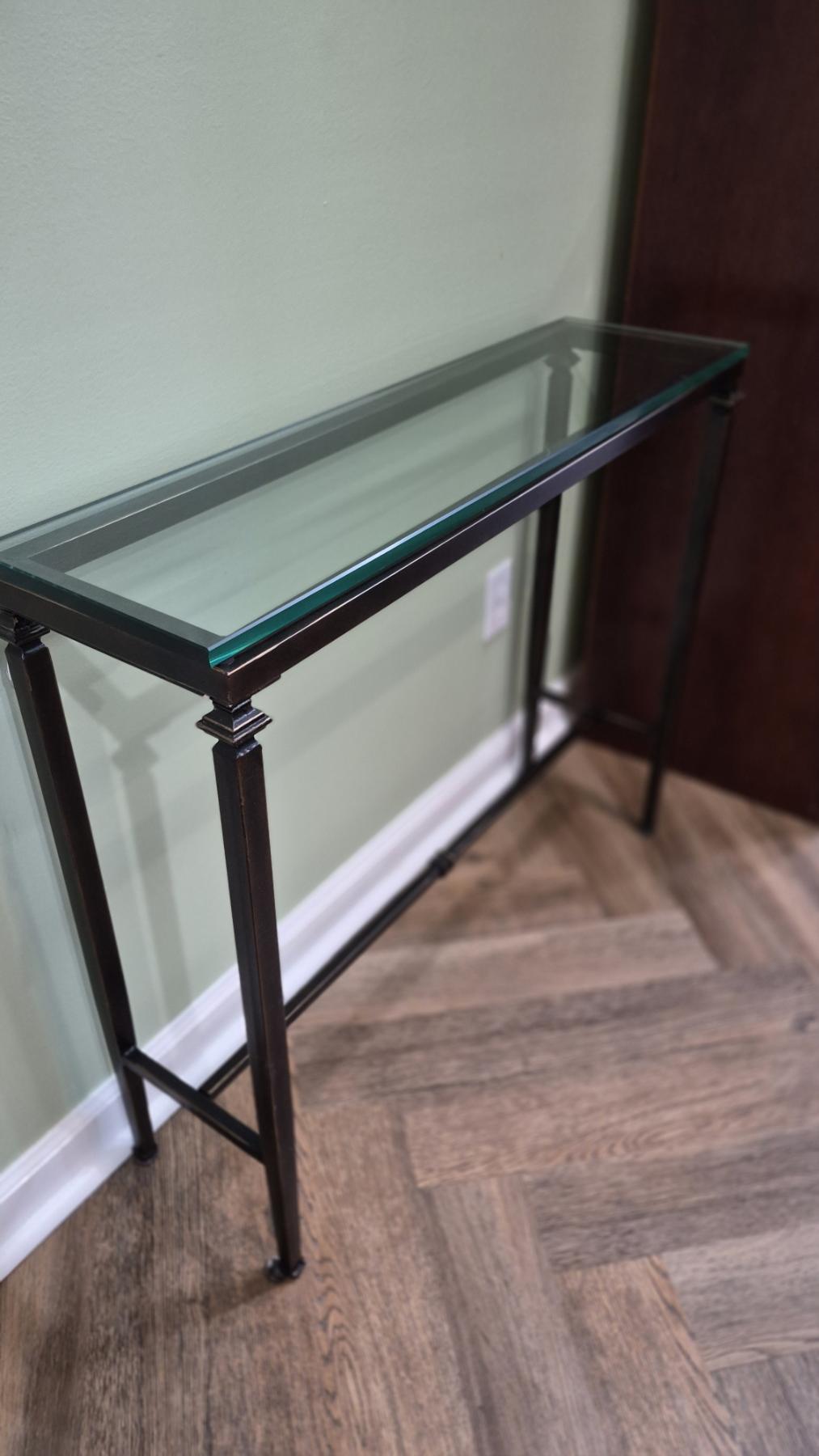 PICKUP IN NORTHFIELD - Small Metal & Glass Top Console Table 36 x 10 x 30 Tall (Thick Glass Top) - See Pics - (All Items noting "Pickup In Northfield" will be available the following Saturday after this auction ends. Other items in this auction will be available at our Louisville Office. Winners of Northfield items will be notified with the address and times, after the auction closes.)