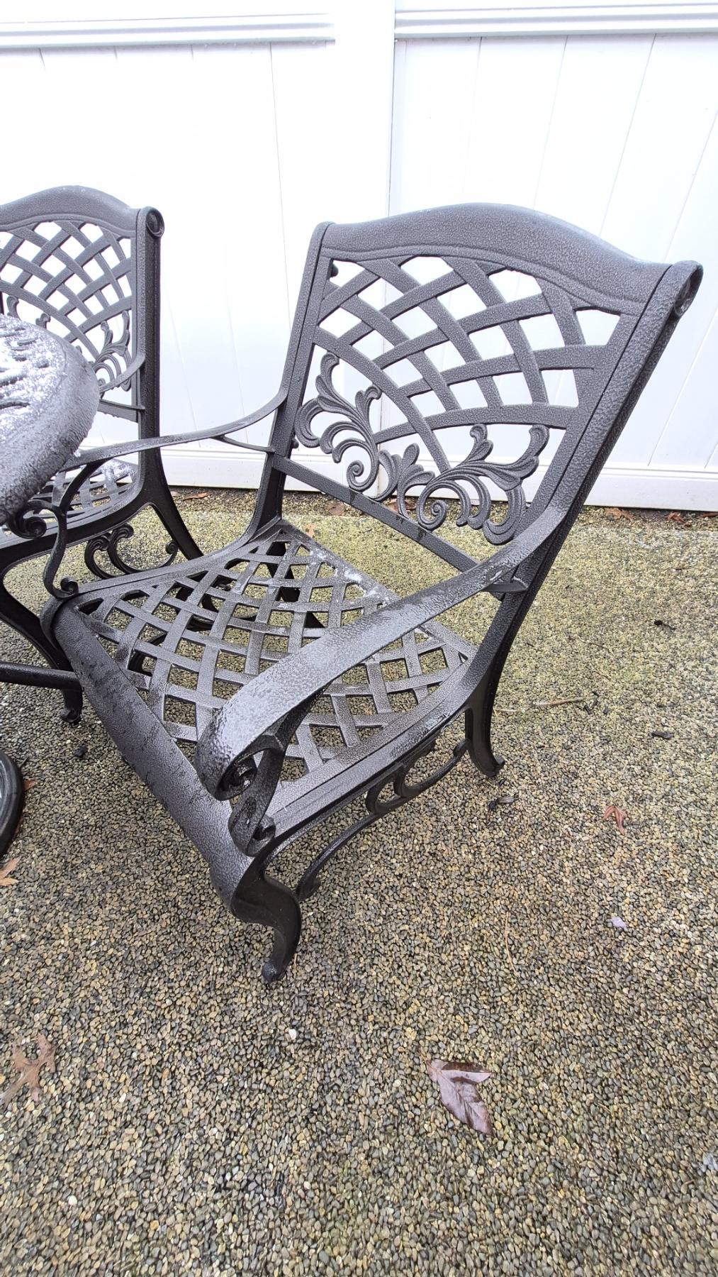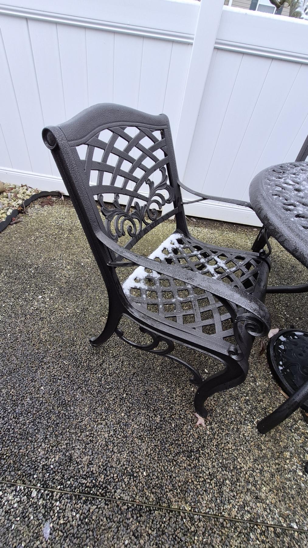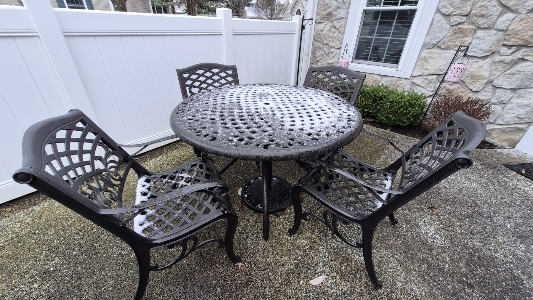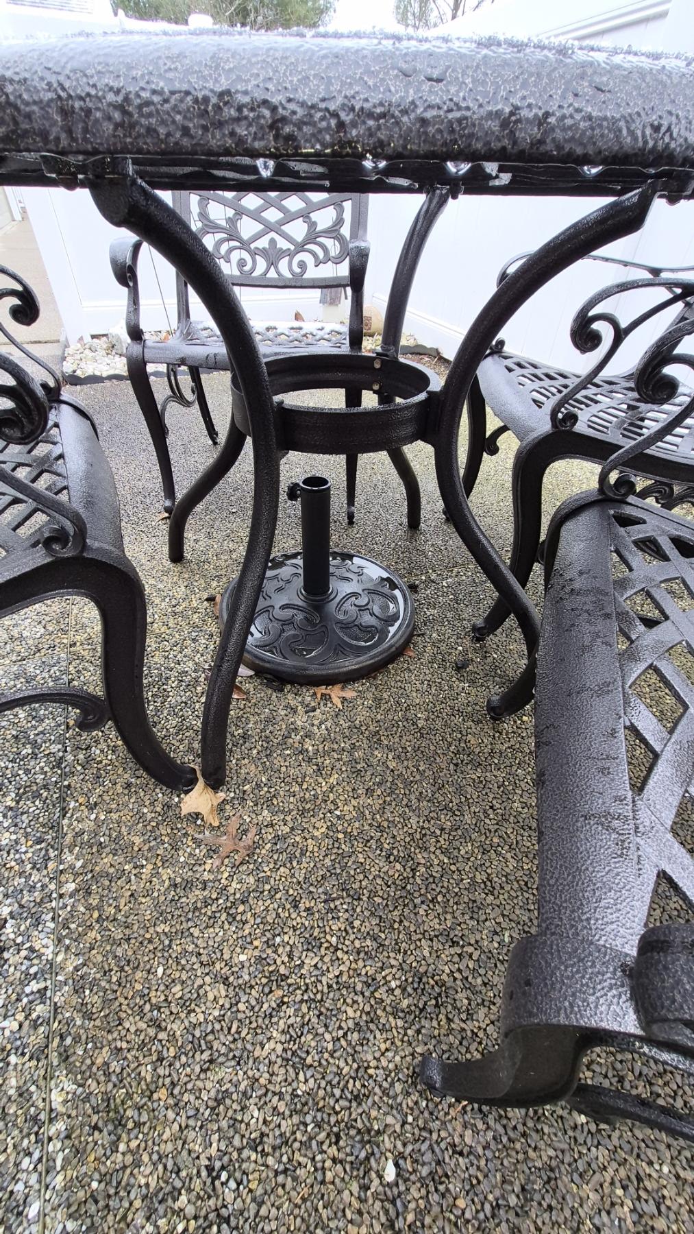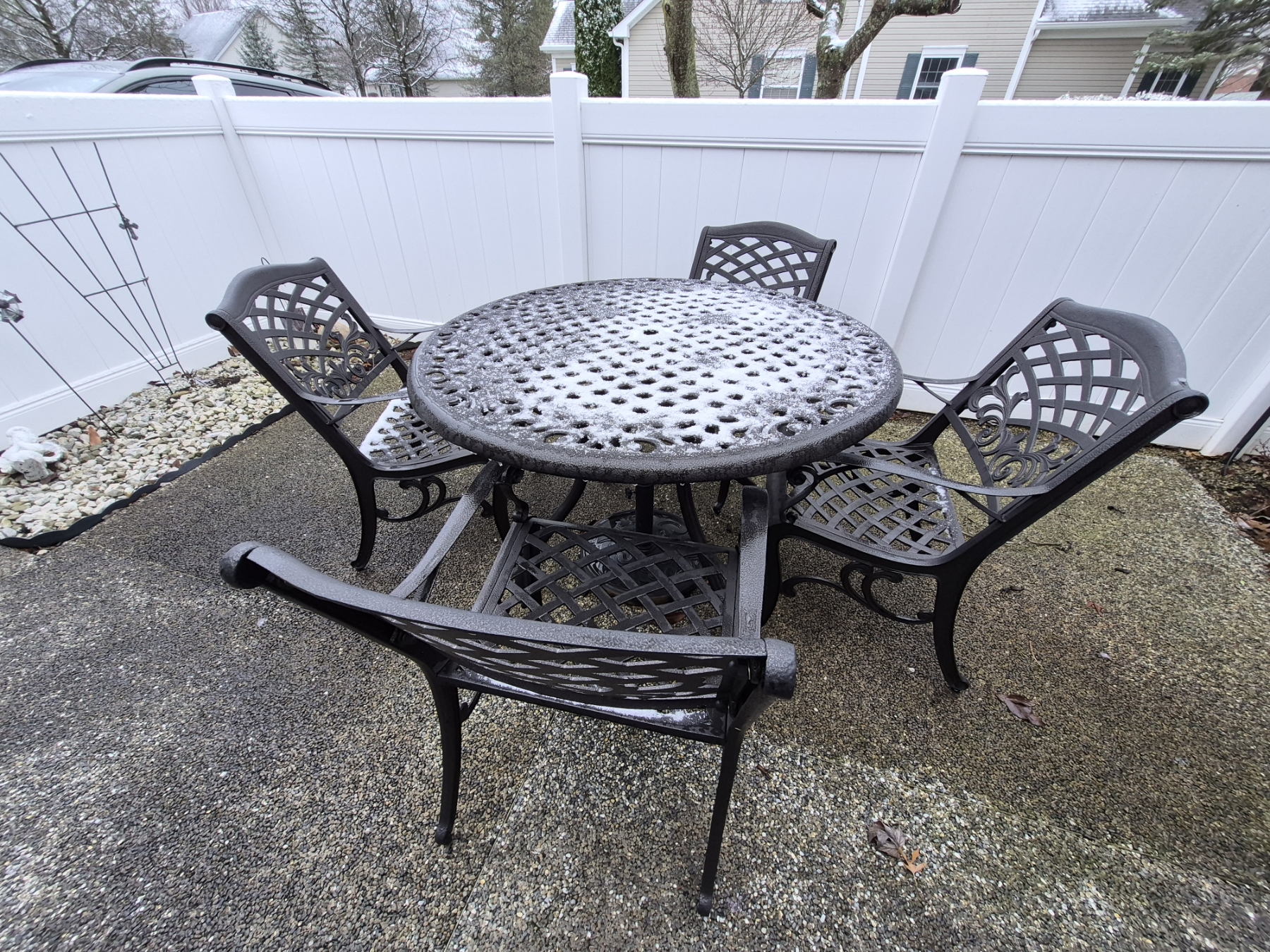 PICKUP IN NORTHFIELD - Superb Metal Outdoor Patio Table & 4 Chairs - 48" Includes Base For Umbrella - See Pics - (All Items noting "Pickup In Northfield" will be available the following Saturday after this auction ends. Other items in this auction will be available at our Louisville Office. Winners of Northfield items will be notified with the address and times, after the auction closes.)