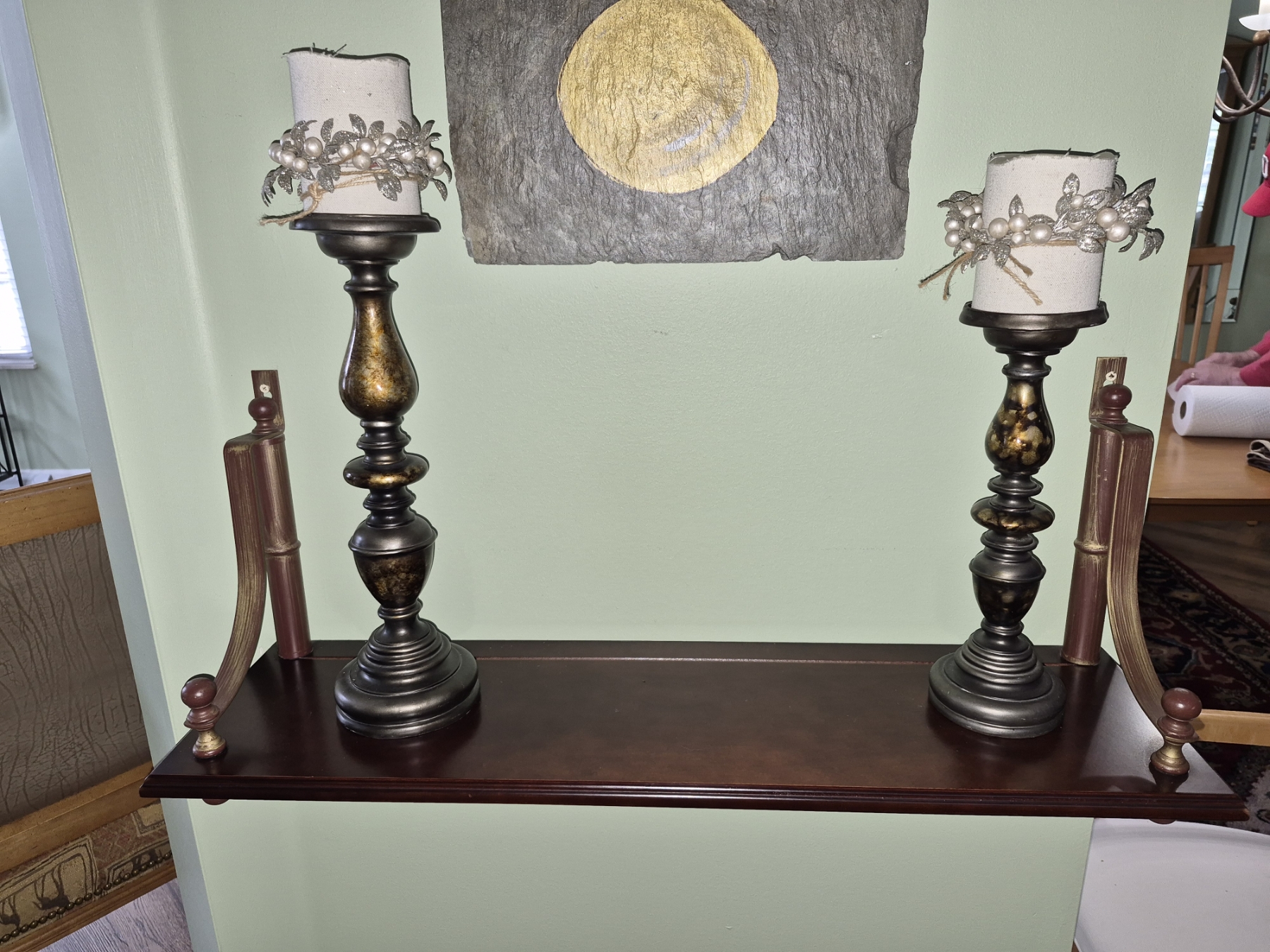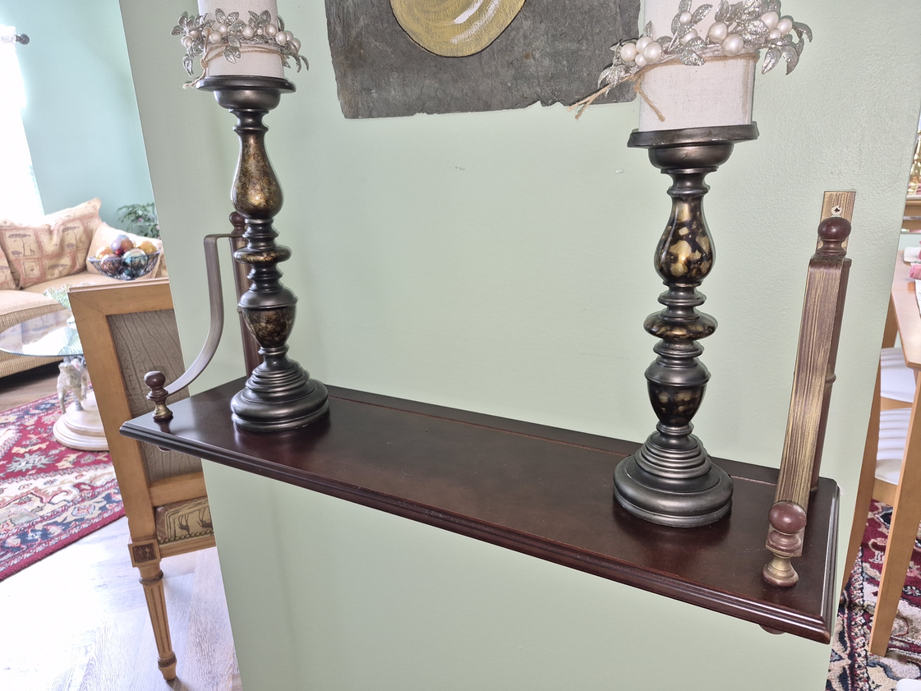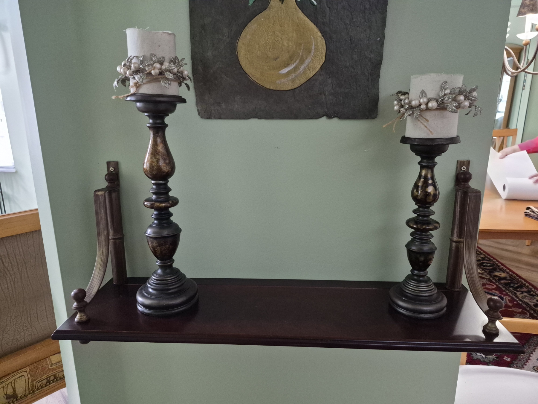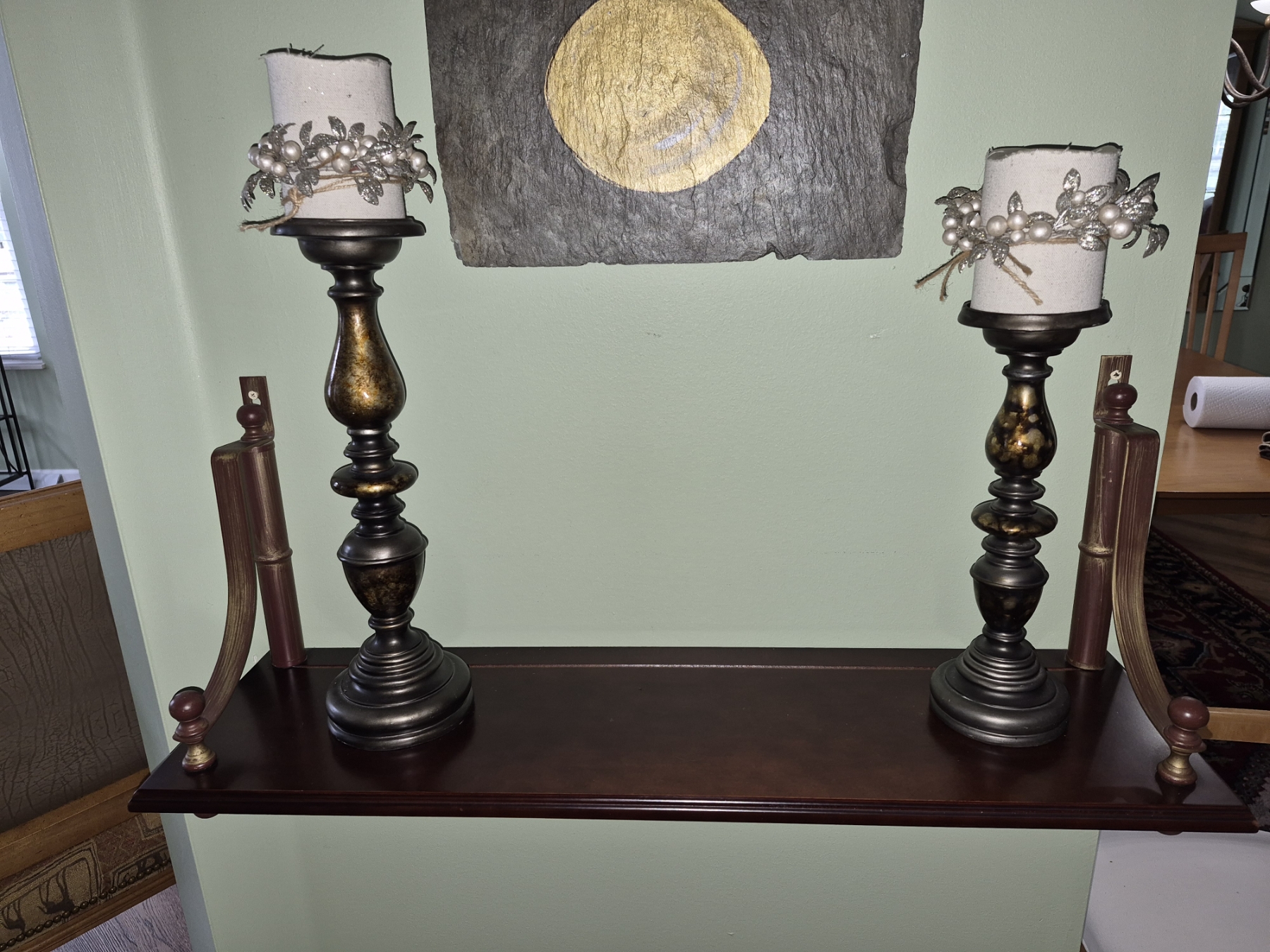 PICKUP IN NORTHFIELD - Wood Wall Rack With Pair Of Candlesticks Rack Is 30 x 19 - Candlesticks Are 15" & 12" Tall - See Pics - (All Items noting "Pickup In Northfield" will be available the following Saturday after this auction ends. Other items in this auction will be available at our Louisville Office. Winners of Northfield items will be notified with the address and times, after the auction closes.)