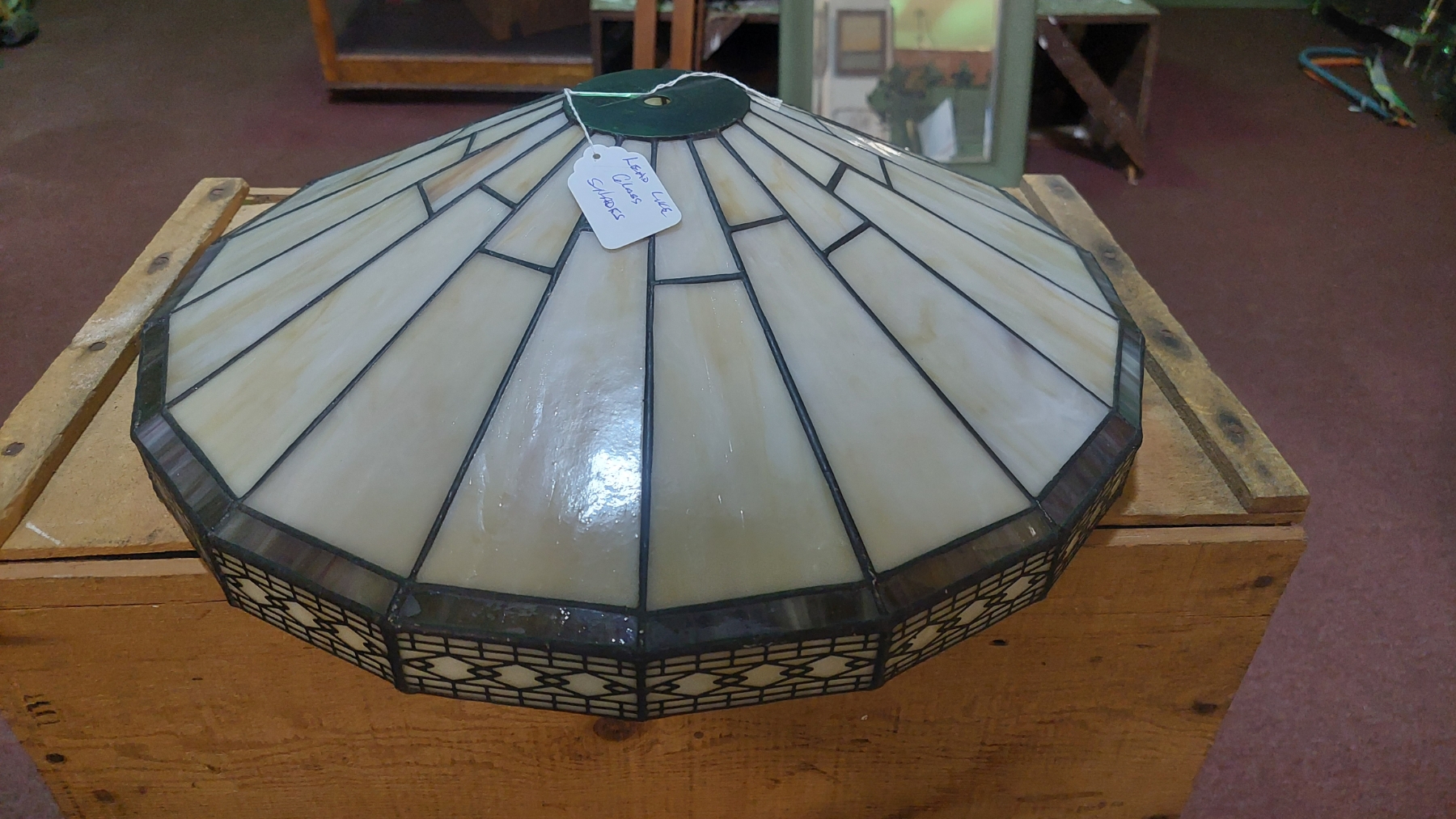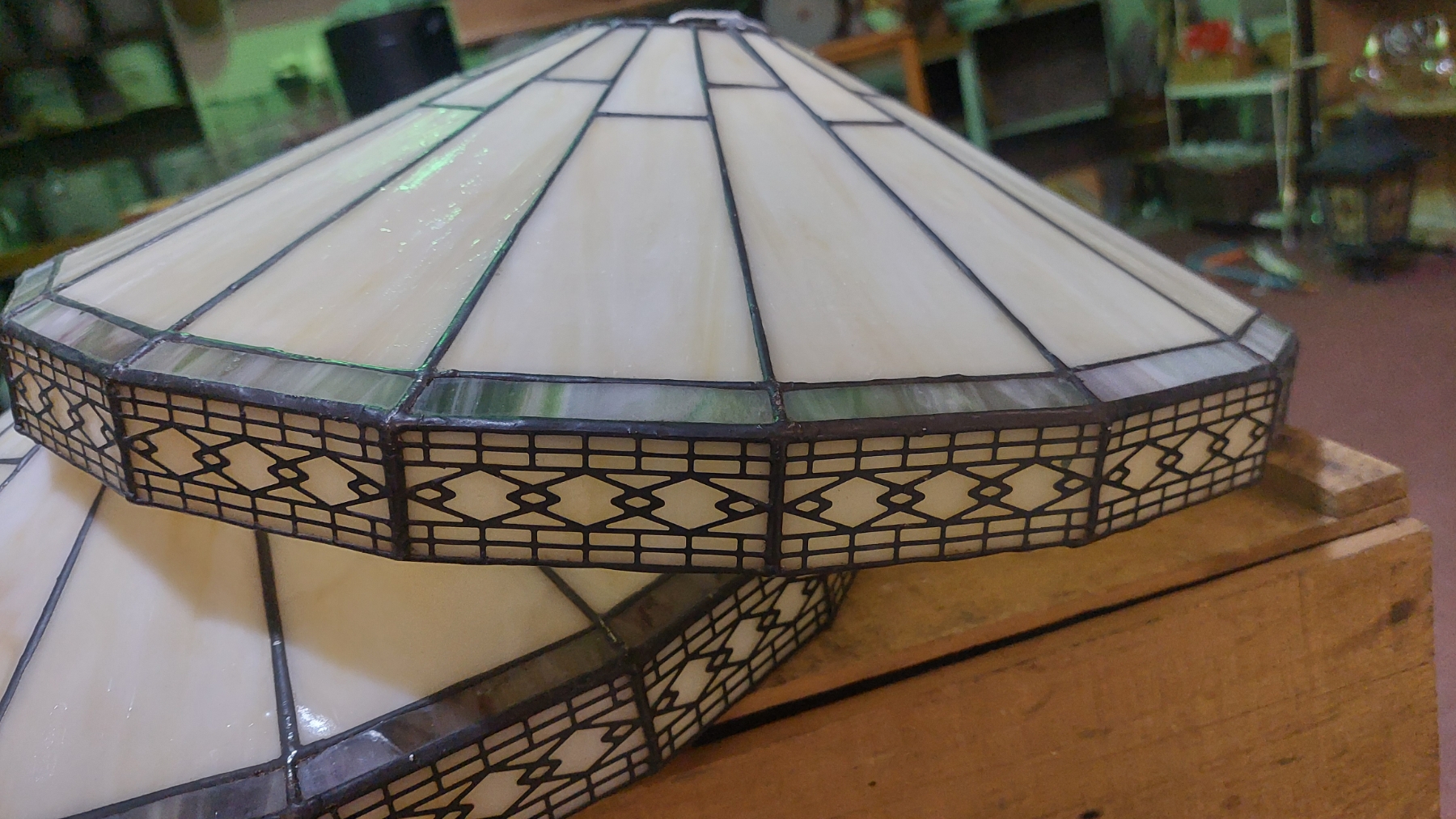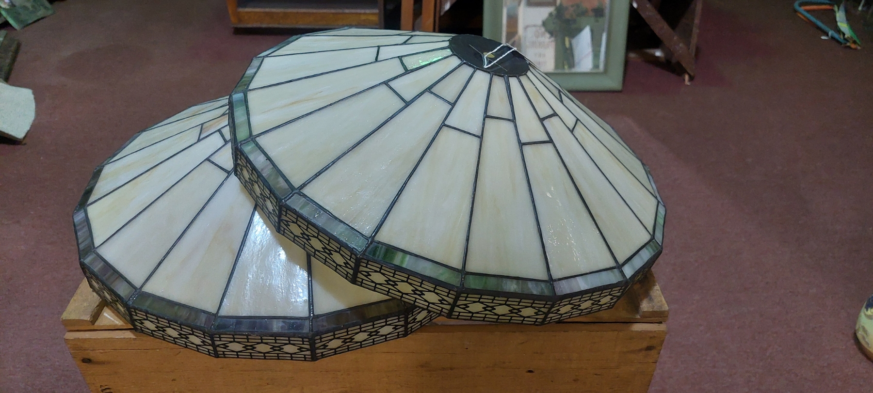 Pair Of Matching Vintage Stined Glass Leaded Shades With Filigree Lower Rim 16" Diameter Good Conditon