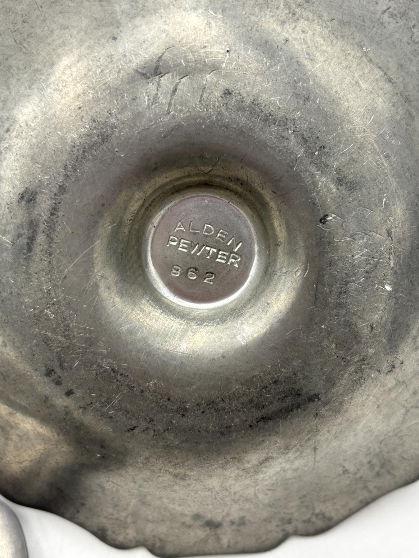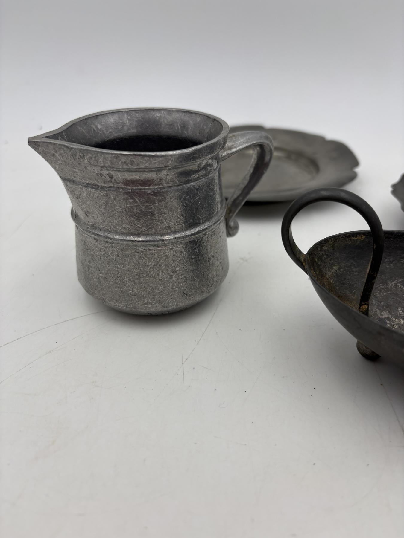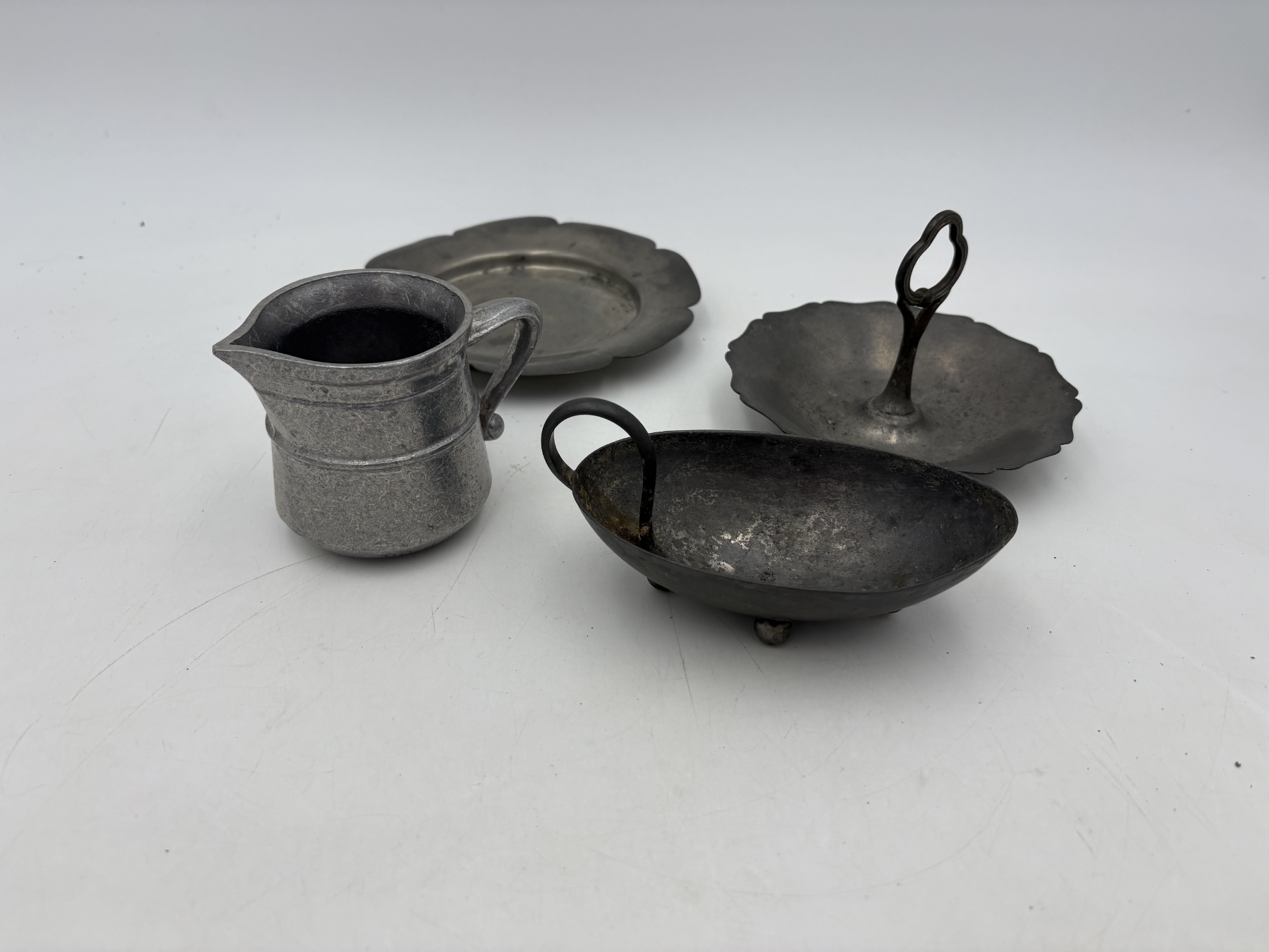 Pewter Tableware - 4 Total Pieces - Scalloped Edge Plate - Pitcher - Trinket Dish - Tidbit Dish with Center Handle - Alden Pewter