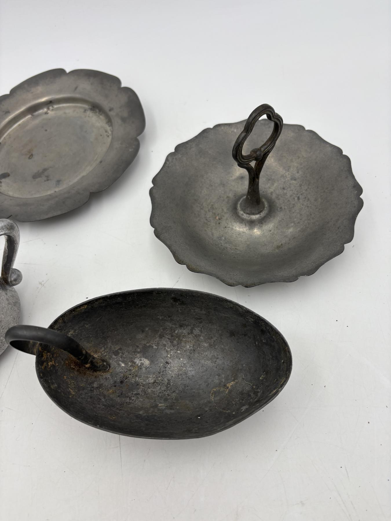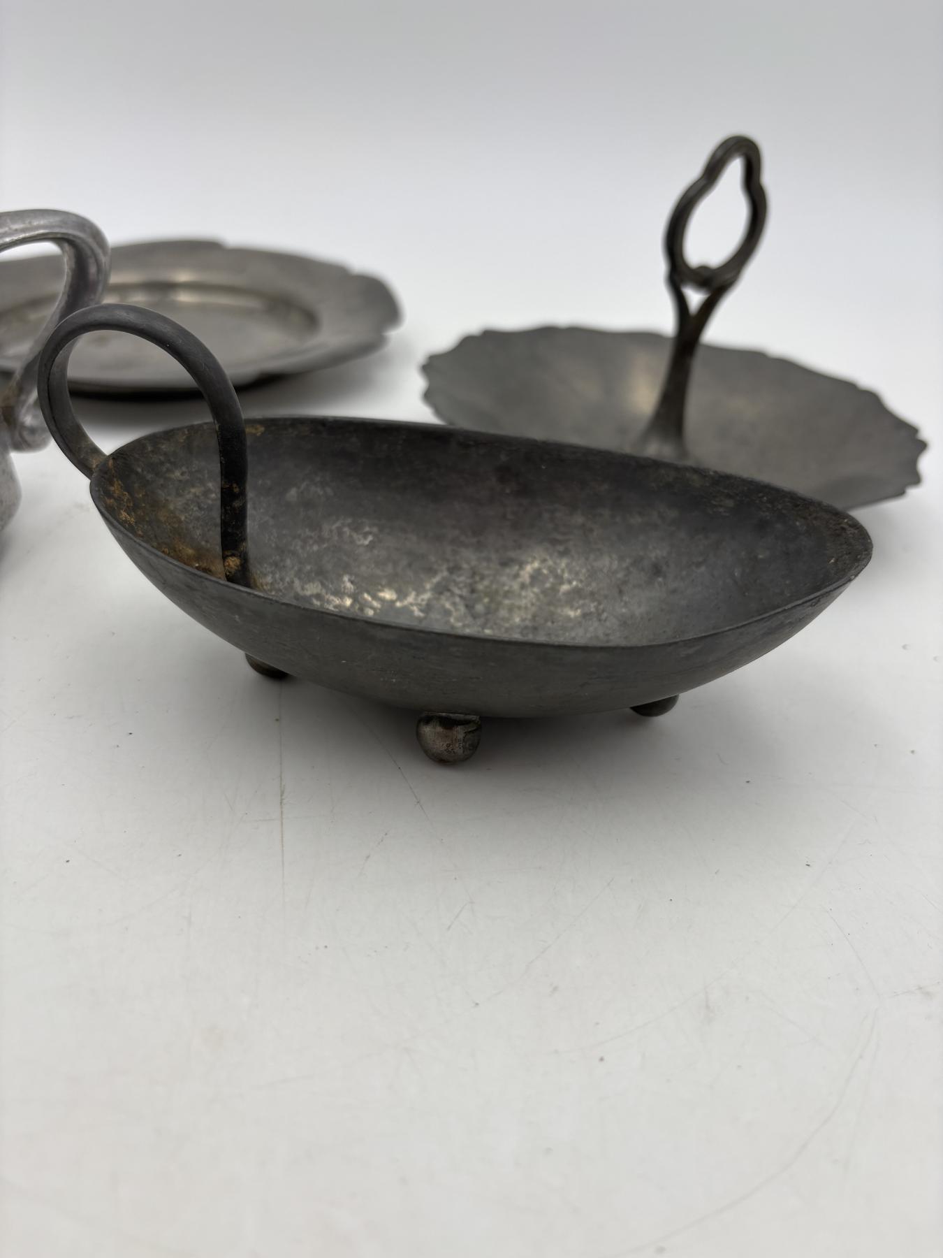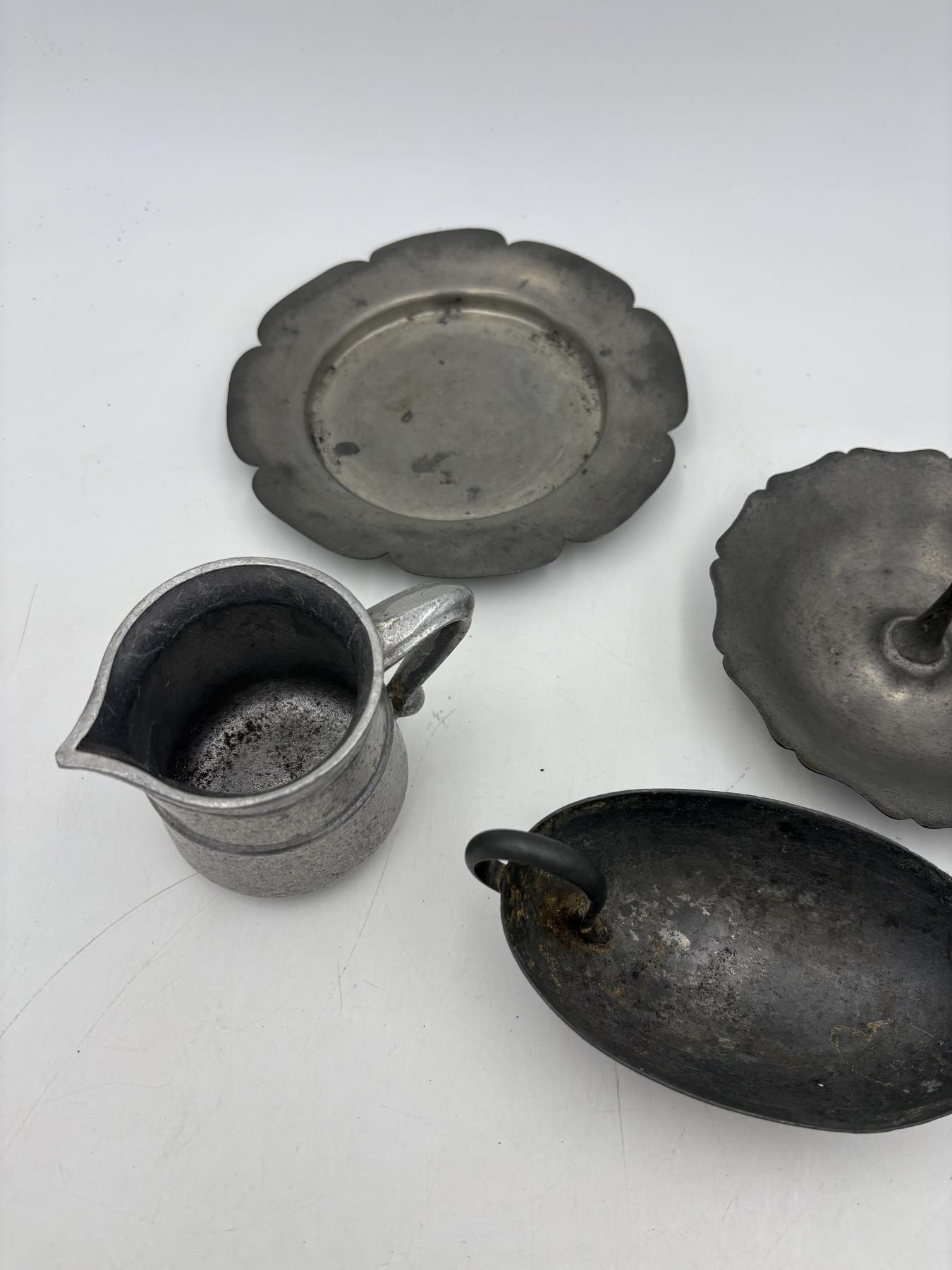 Pewter Tableware - 4 Total Pieces - Scalloped Edge Plate - Pitcher - Trinket Dish - Tidbit Dish with Center Handle - Alden Pewter