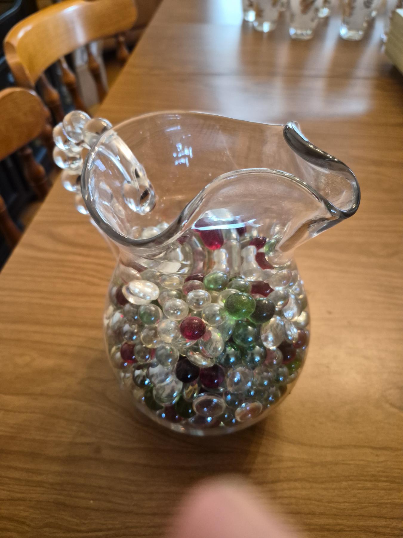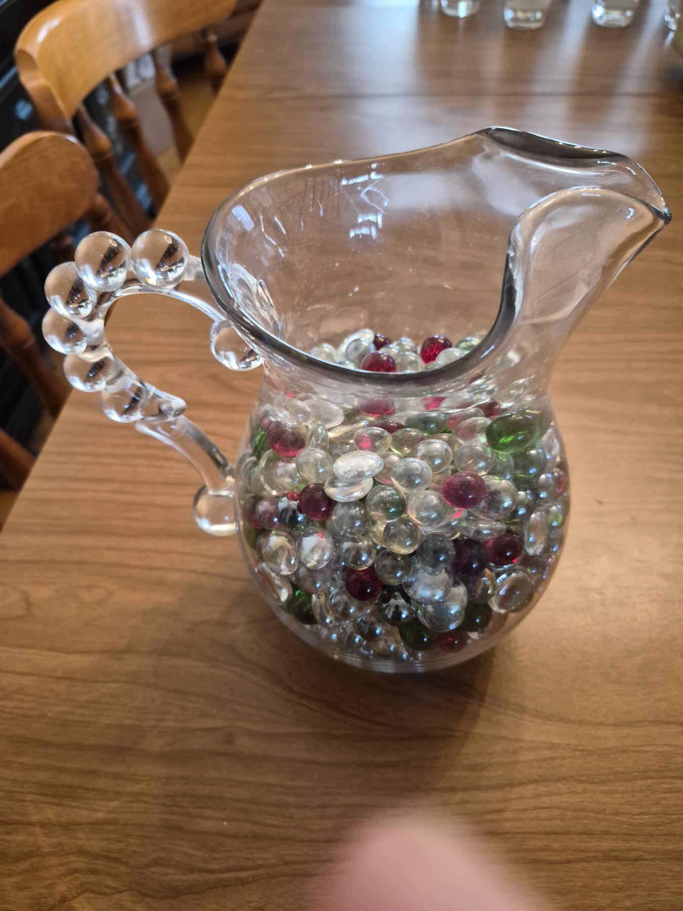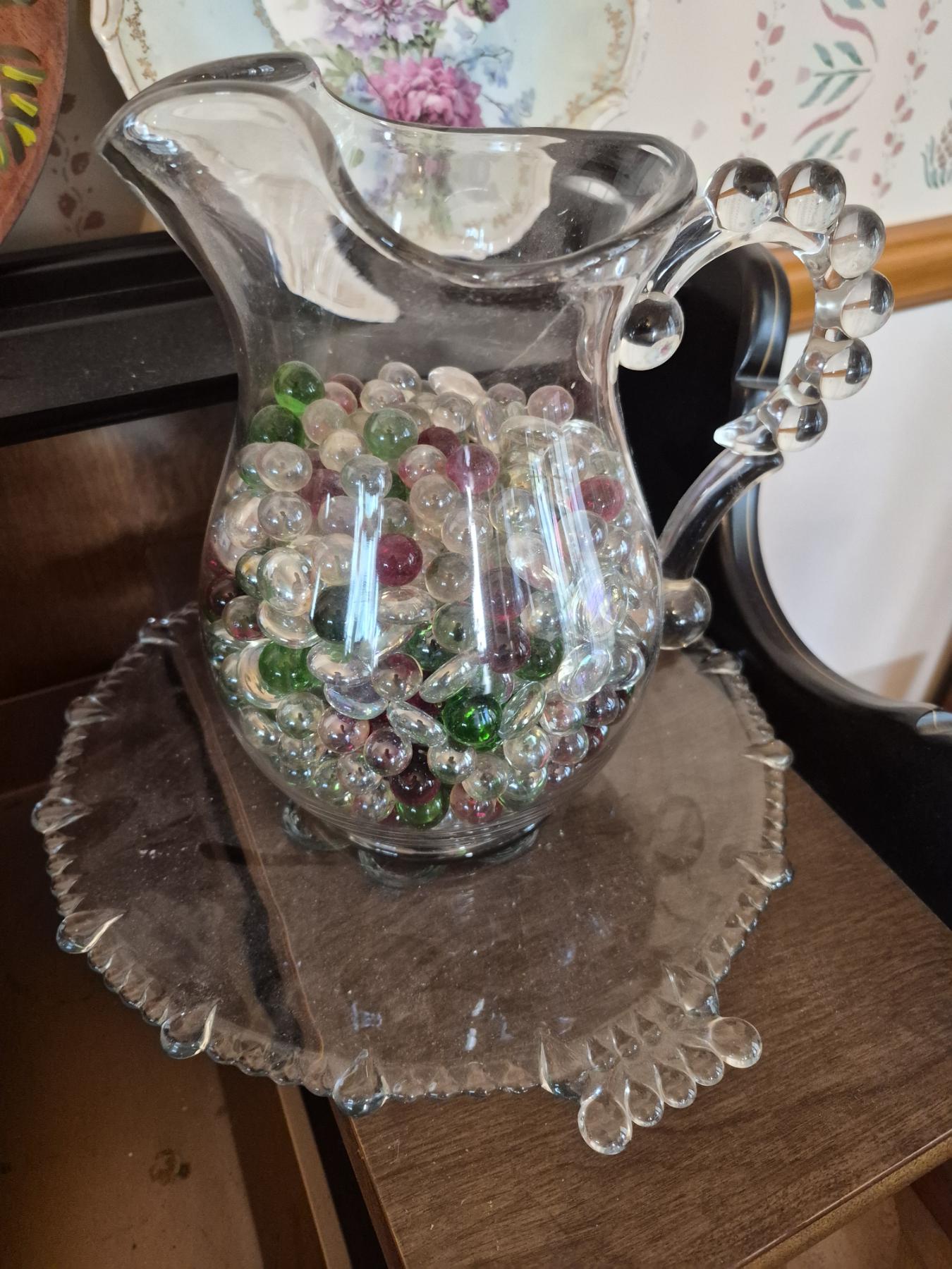PICKUP IN CANTON - Fancy Crystal Water Pitcher w Fancy Handle & Platter - Pitcher Filled With Shimmering Glass Jewels - See Pics