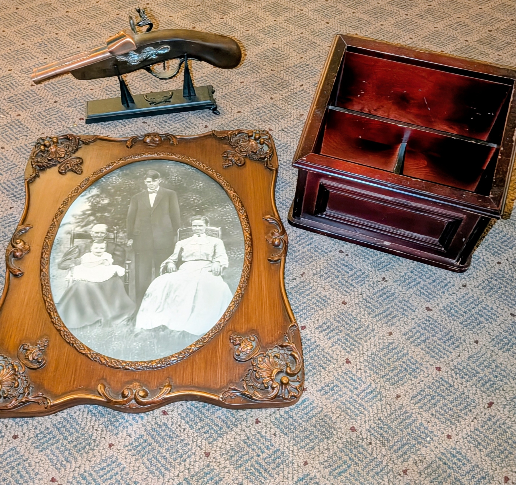 Pistol Replica Lighter, Antique Picture, And Wood Storage Box