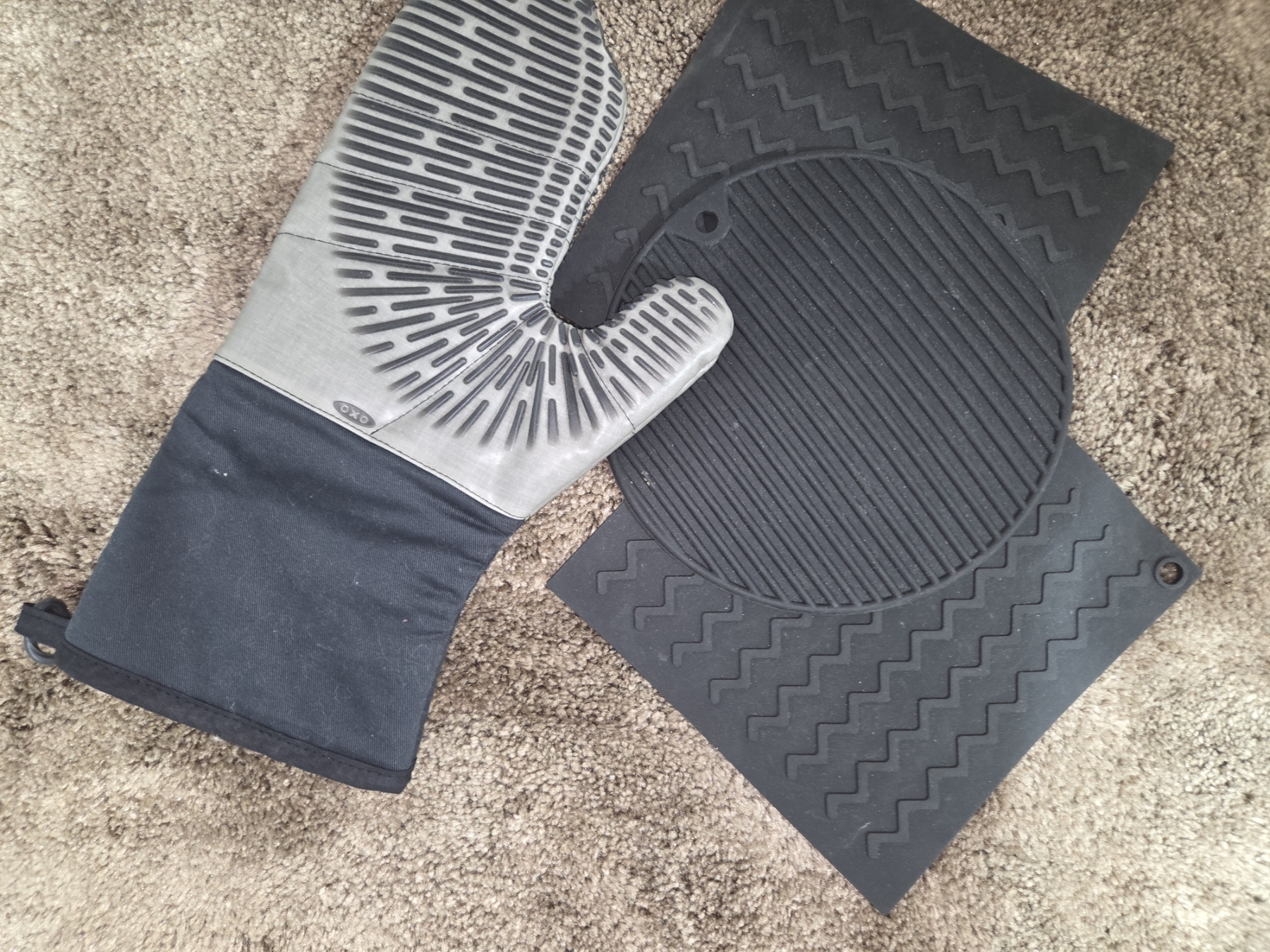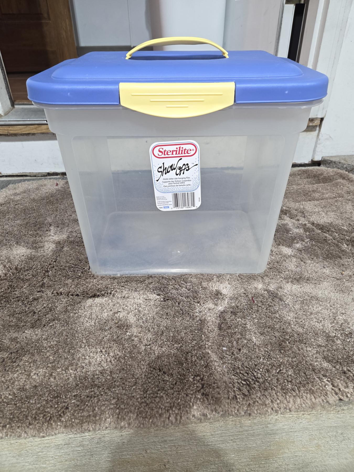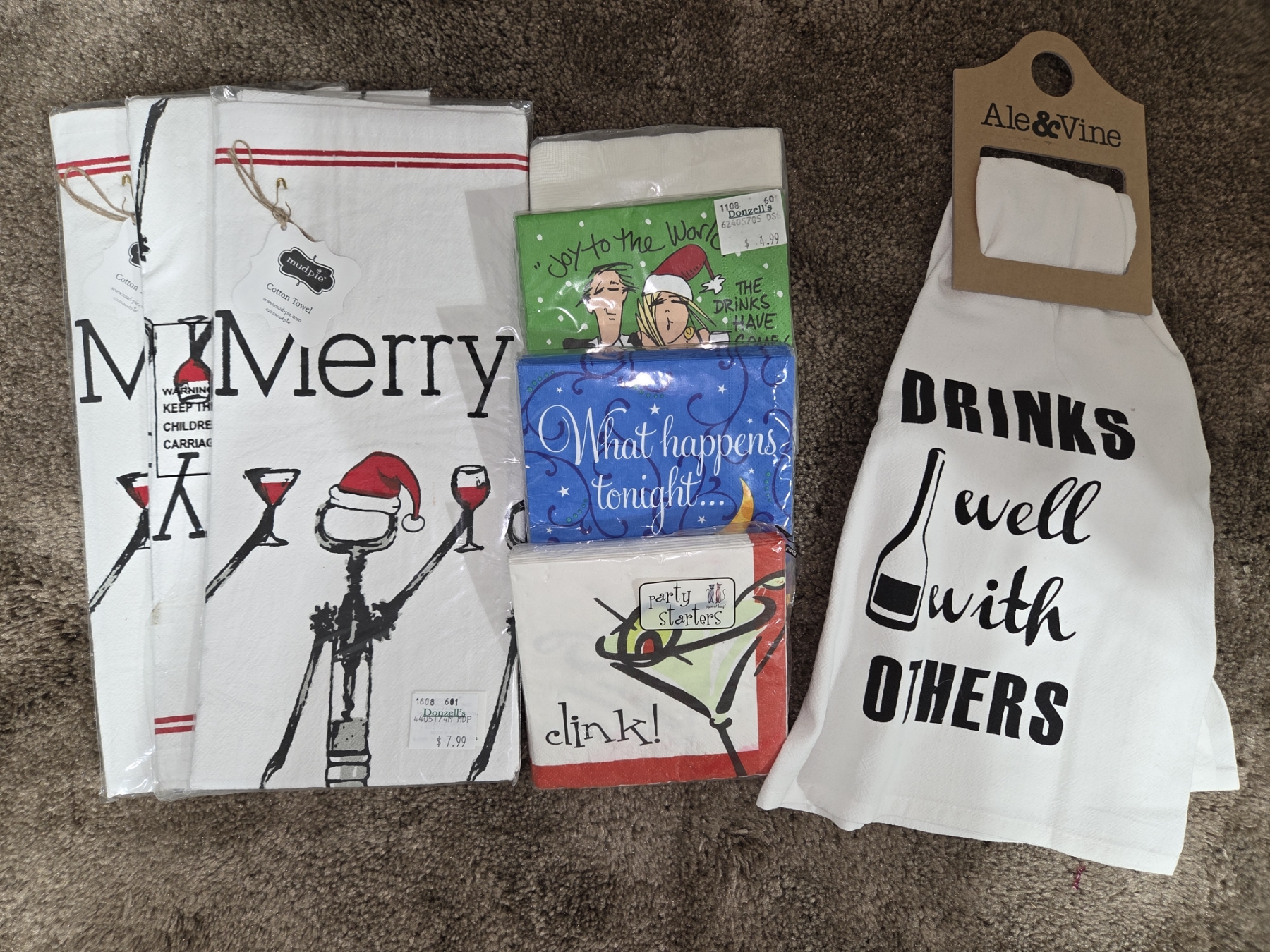 Plastic File Box With Rubber Kitchen Mats, Pot Holders, New Towels And Cocktail Napkins