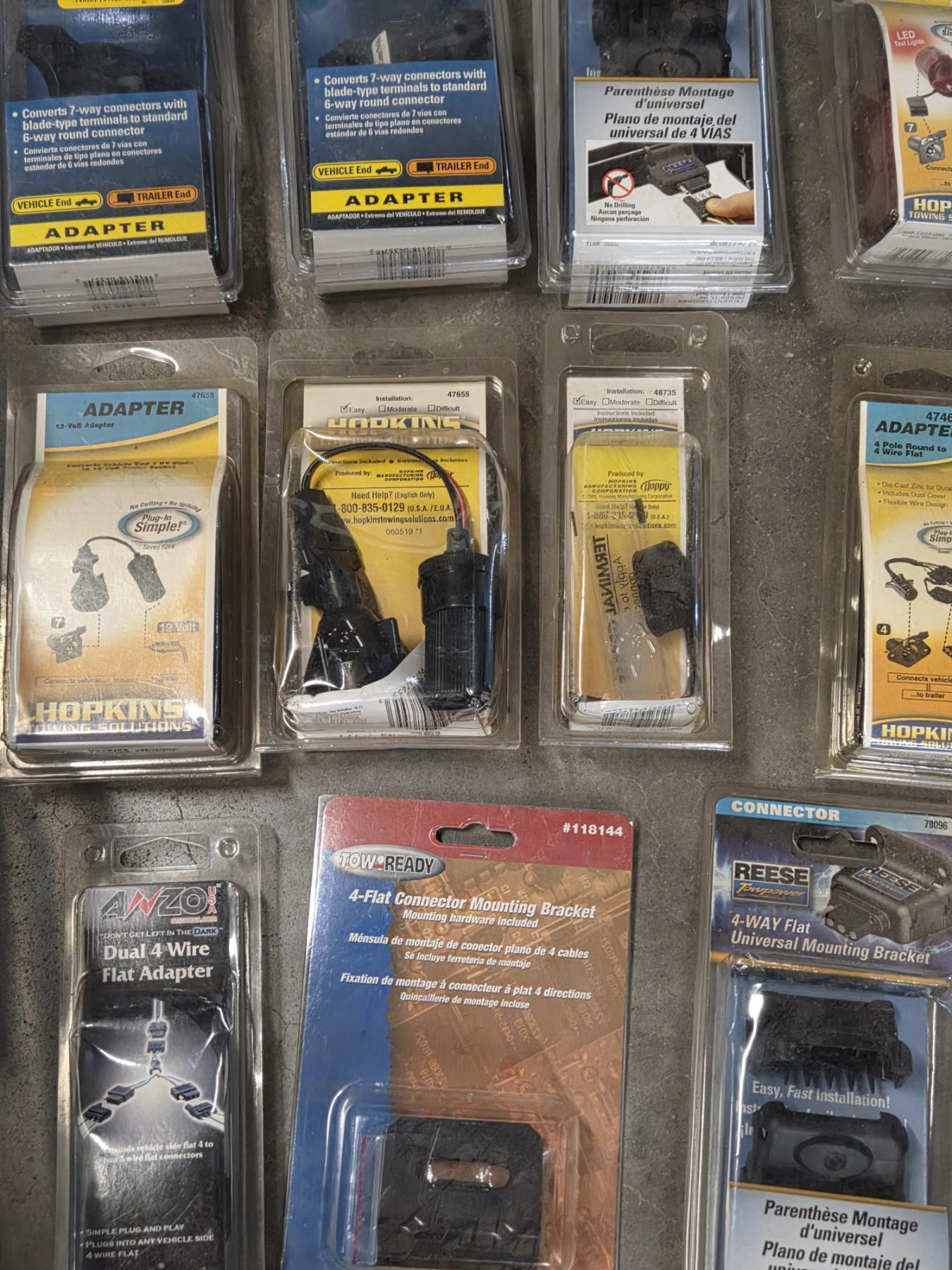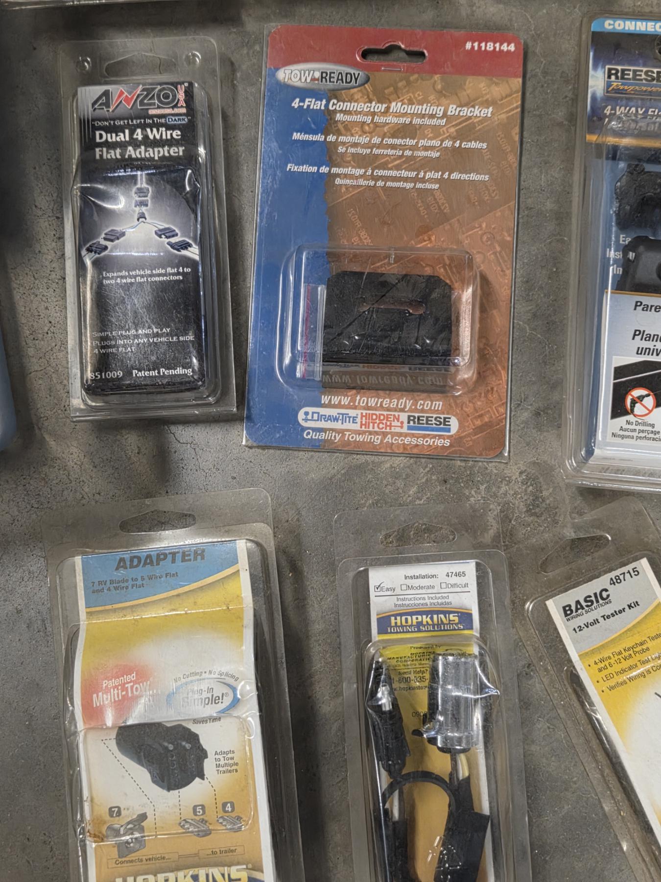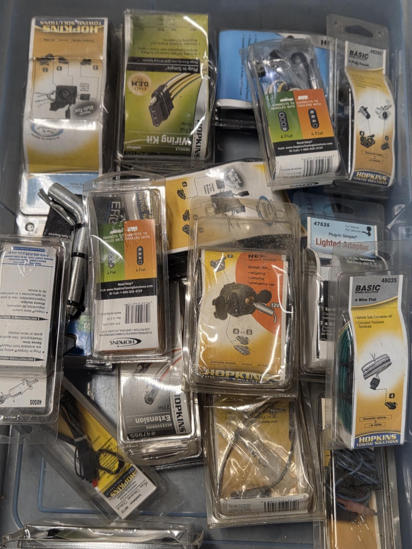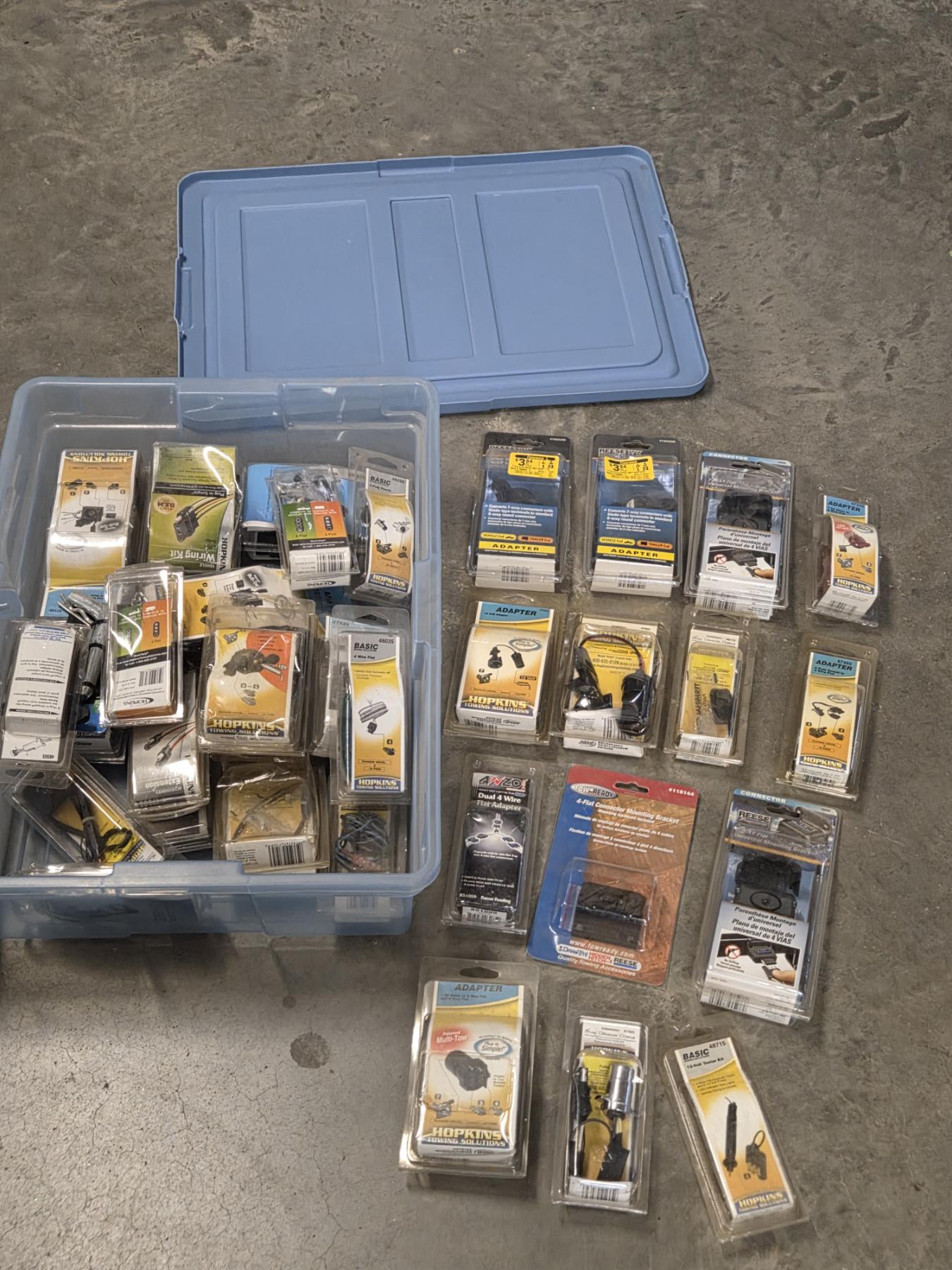 Plastic Storage Tote With Large Assortment Of New Tow Adaptors, Mounting Brackets And More