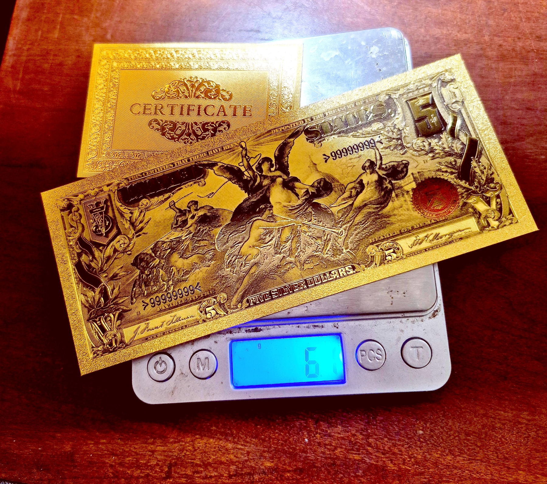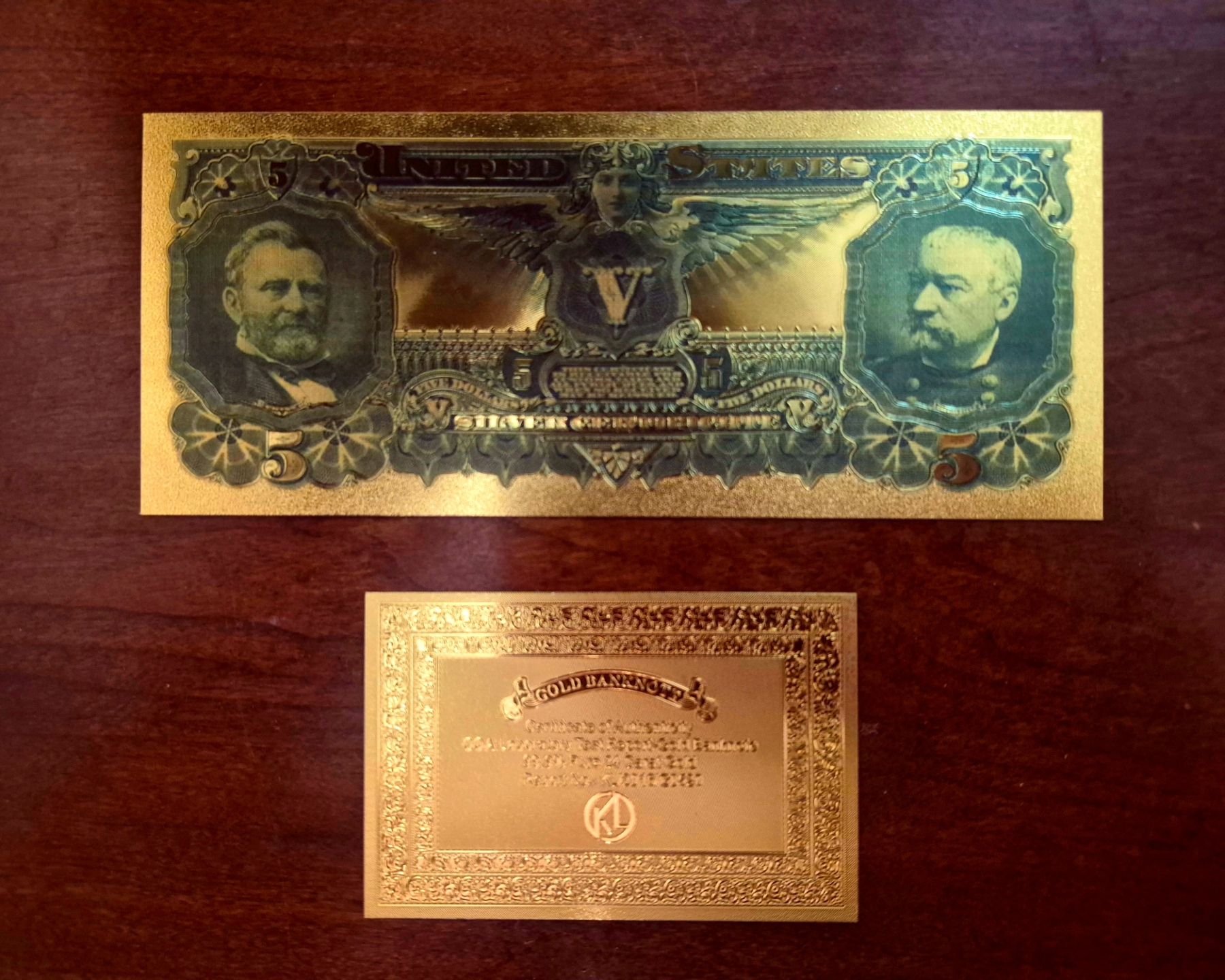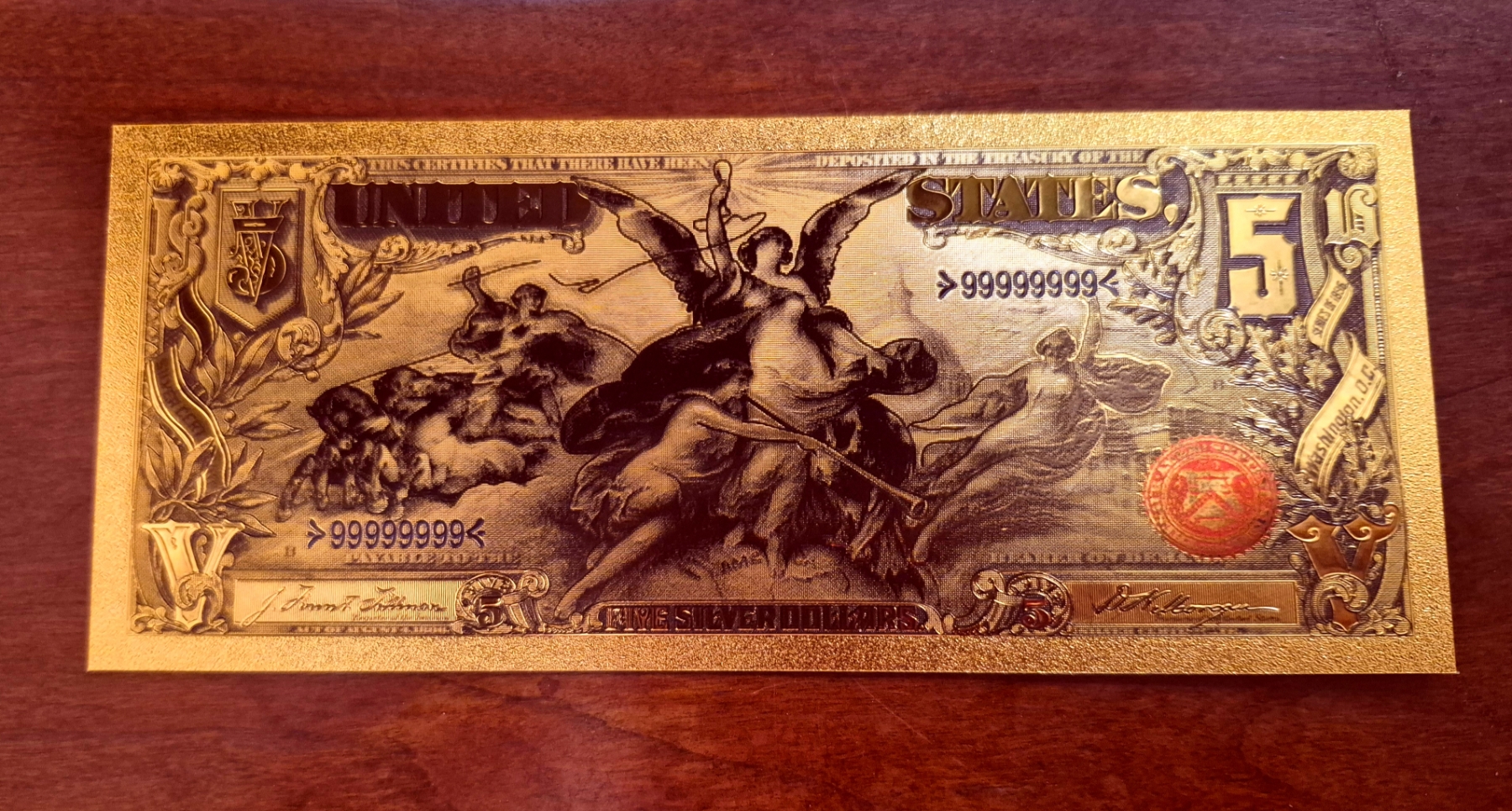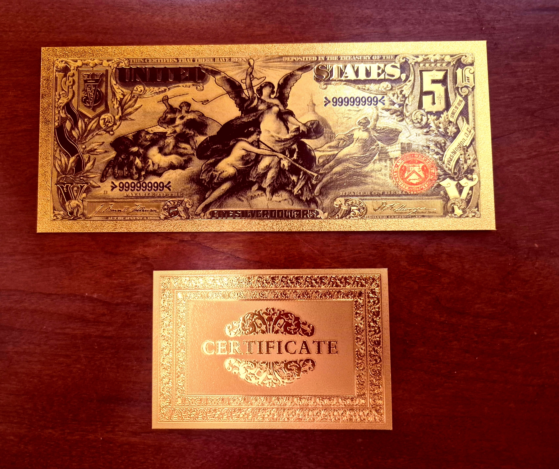 Pure 24k .999 Gold Foil United States 1896 Educational $5 Large Note - Processed in Pure GOLD With Gold COA