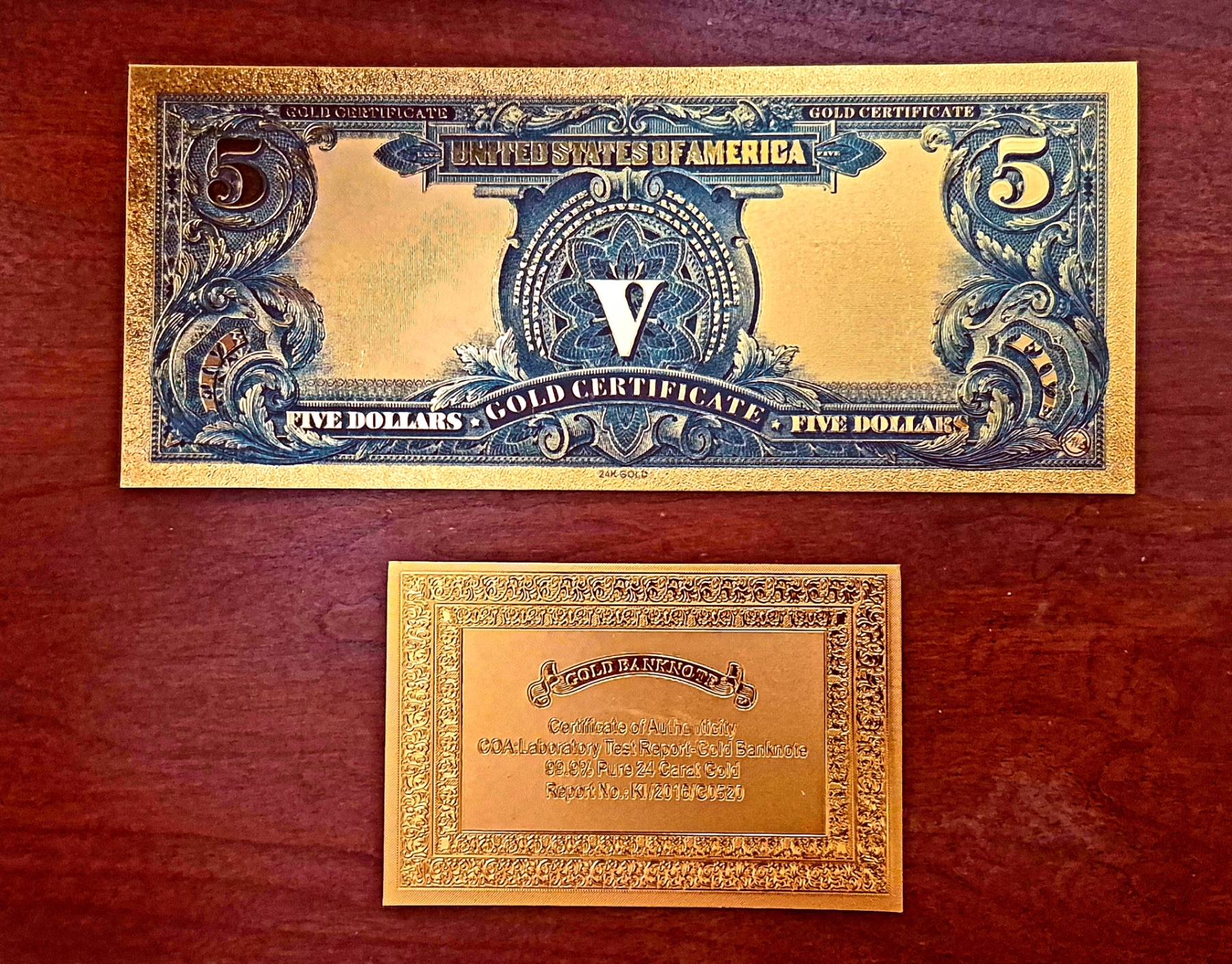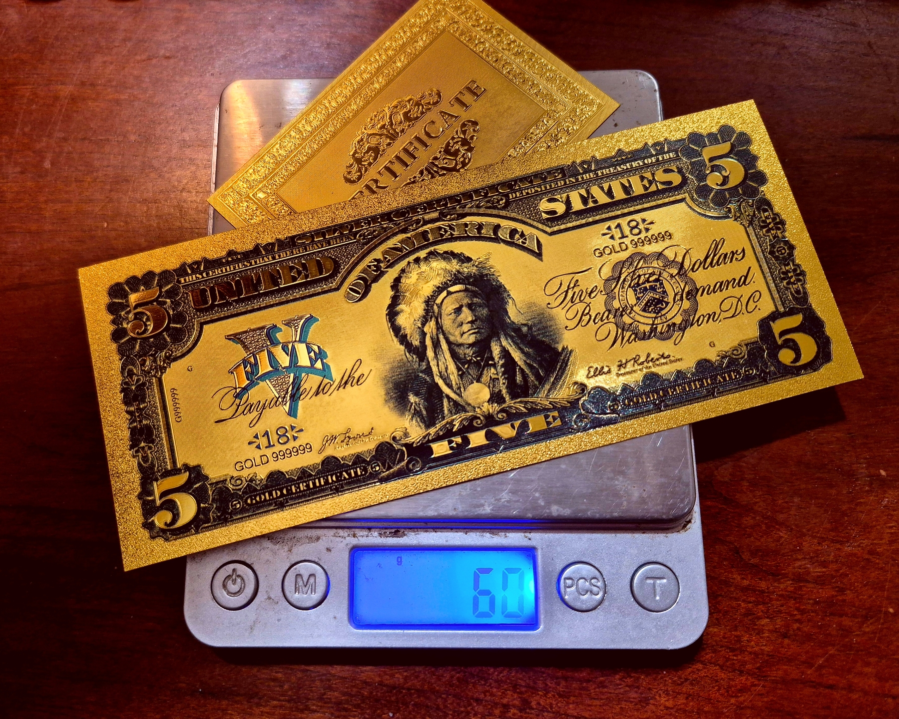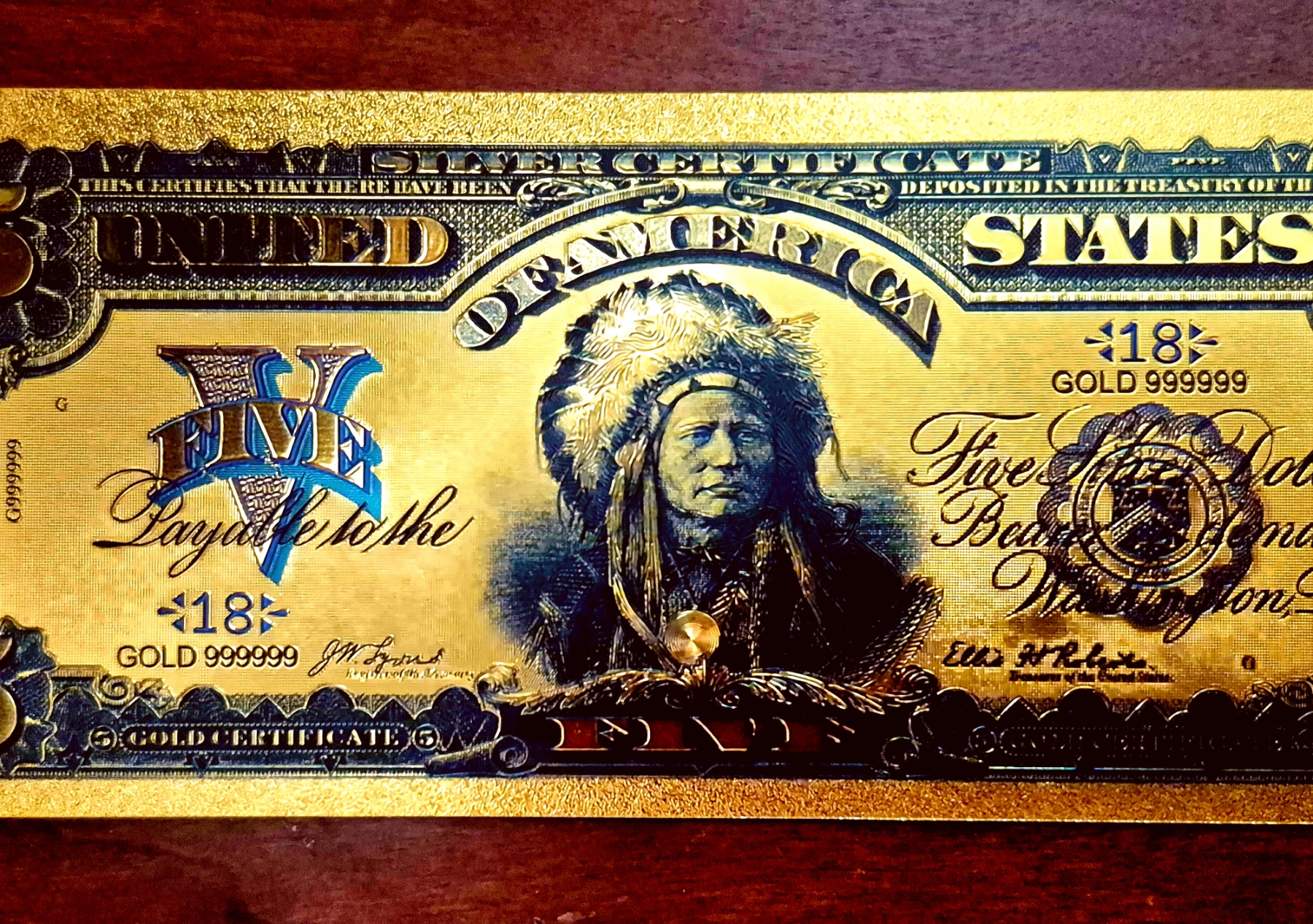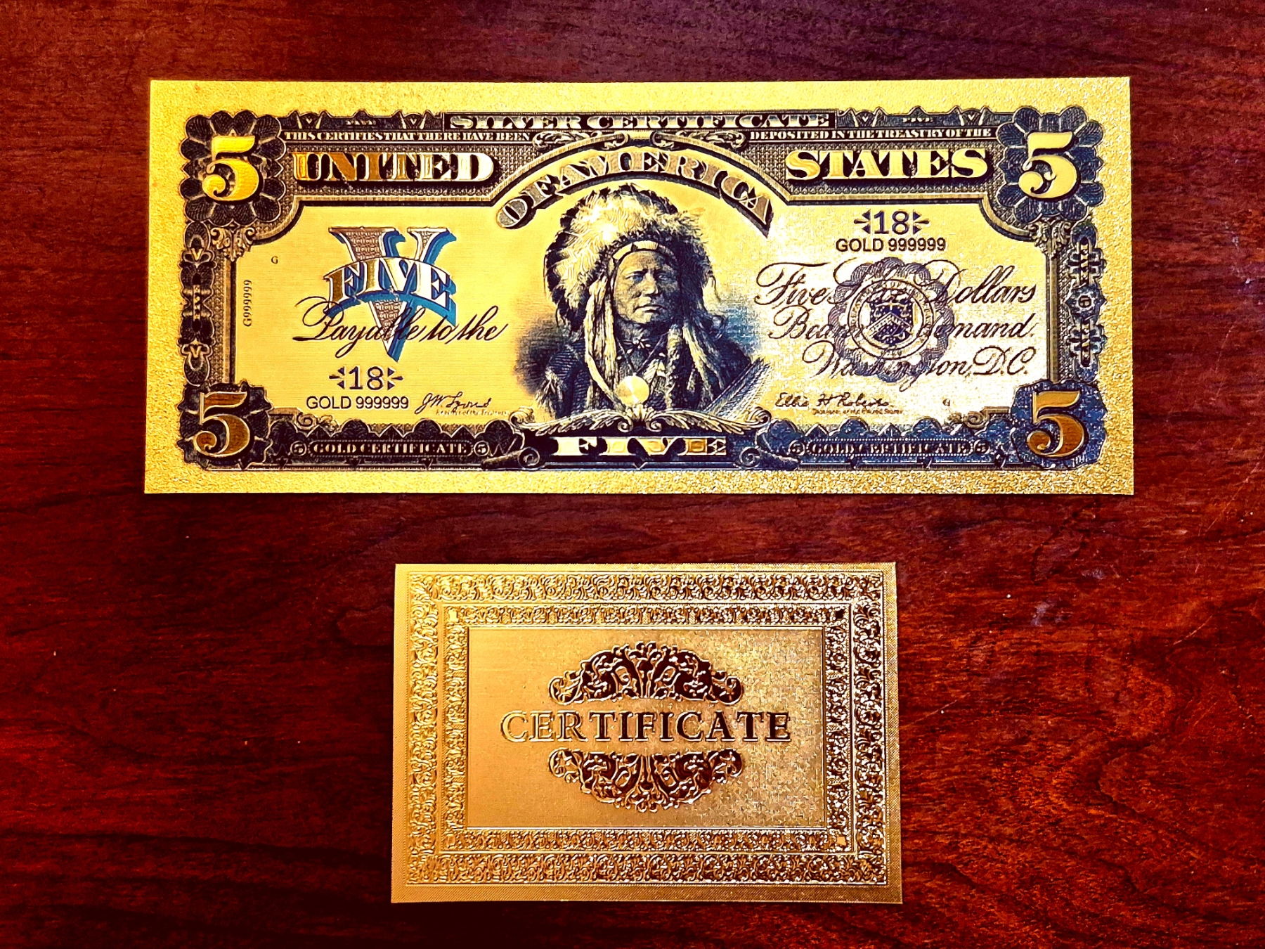 Pure 24k .999 Gold Foil " Note - Mint Condition - Note (Standard Size) of the1899 Much Sought After $5 "INDIAN CHIEF" U S Large Note. Processed in Pure Gold Foil, Colorized and Embossed, producing a shimmering golden collectible piece of this highly collectible Series of U S Currency.. The gold foil is sealed between ultra thin super clear laminate. Overall weight of each set (Note & Gold COA) is Approx 6 grams.