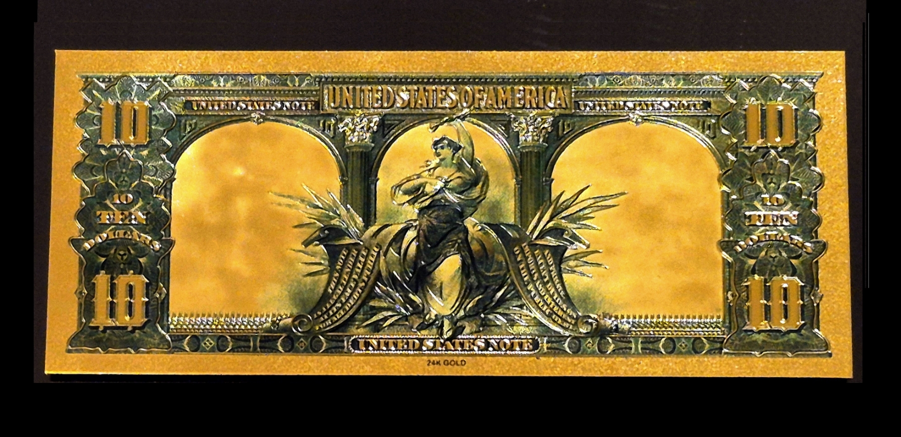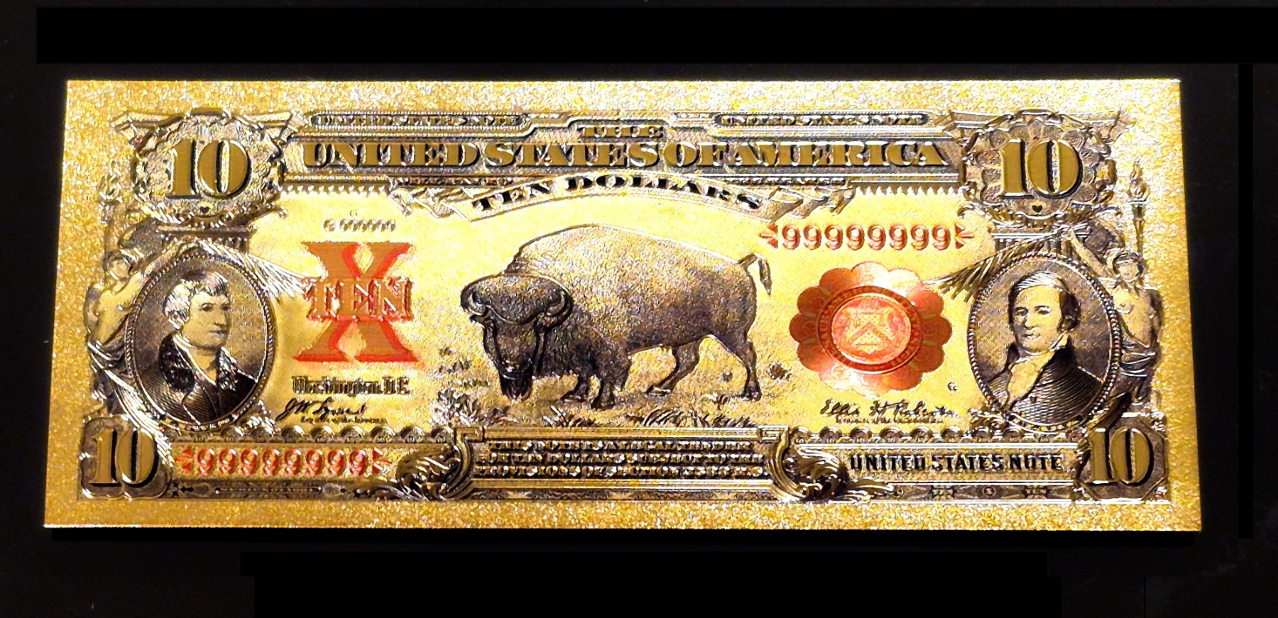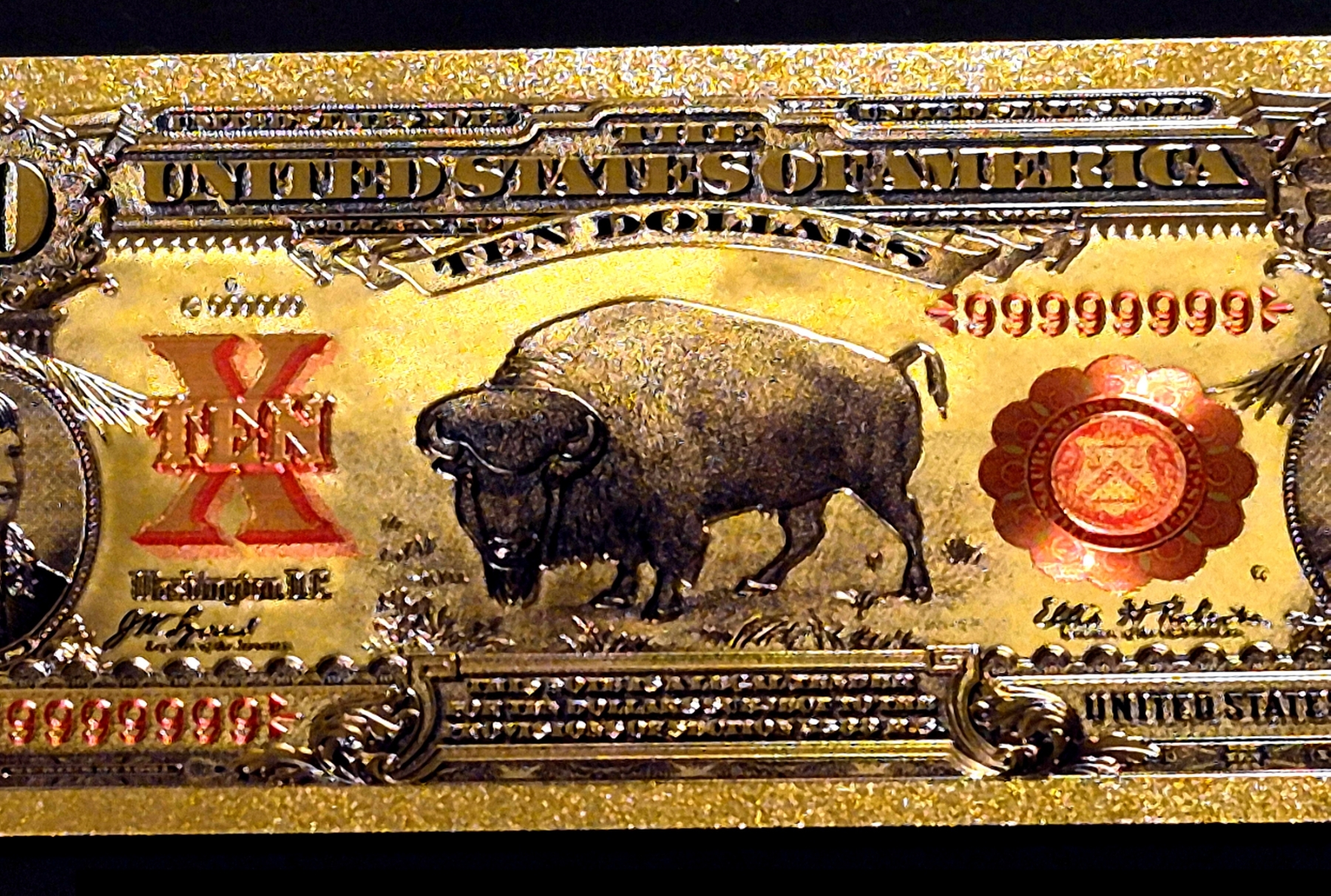 Pure 24k .999 Gold Foil " Note - Mint Condition - Note (Standard Size) of the1901 Much Sought After $10 "BISON" Or sometimes referred to as the "BUFFALO" U S Large Note. Processed in Pure Gold Foil, Colorized and Embossed, producing a shimmering golden collectible piece of this highly collectible Series of U S Currency.. The gold foil is sealed between ultra thin super clear laminate. Overall weight of Note is Approx 4 grams.