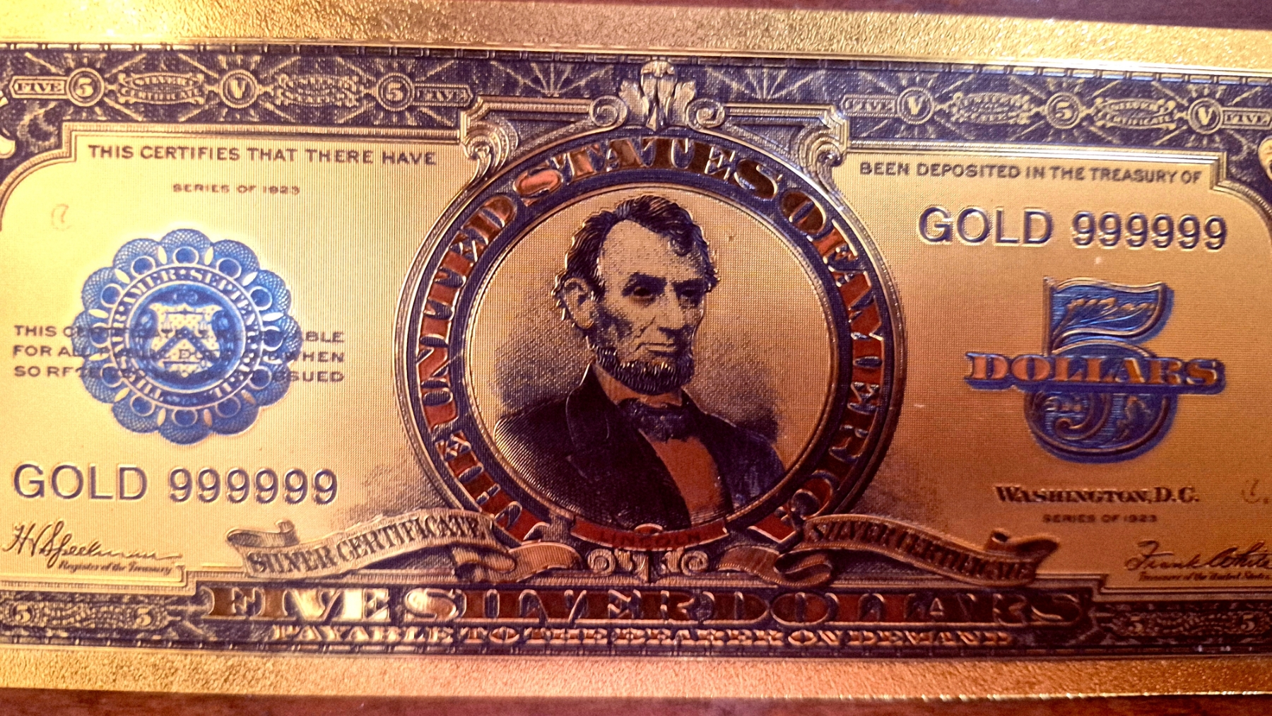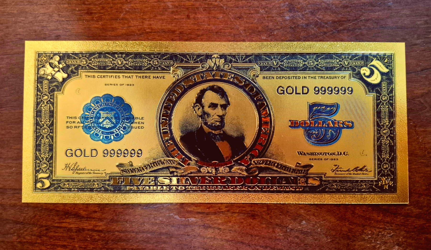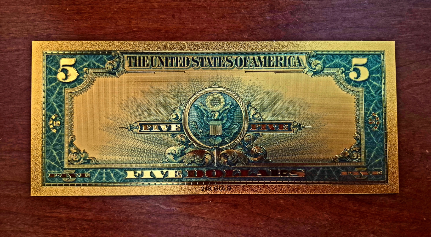 Pure 24k .999 Gold Foil " Note - Mint Condition - Note (Standard Size) of the1923 Much Sought After $5 ABRAHAM LINCOLN 'PORTHOLE" U S Large Note. Processed in Pure Gold Foil, Colorized and Embossed, producing a shimmering golden collectible piece of this highly collectible Series of U S Currency.. The gold foil is sealed between ultra thin super clear laminate. Overall weight of Note is Approx 4 grams.