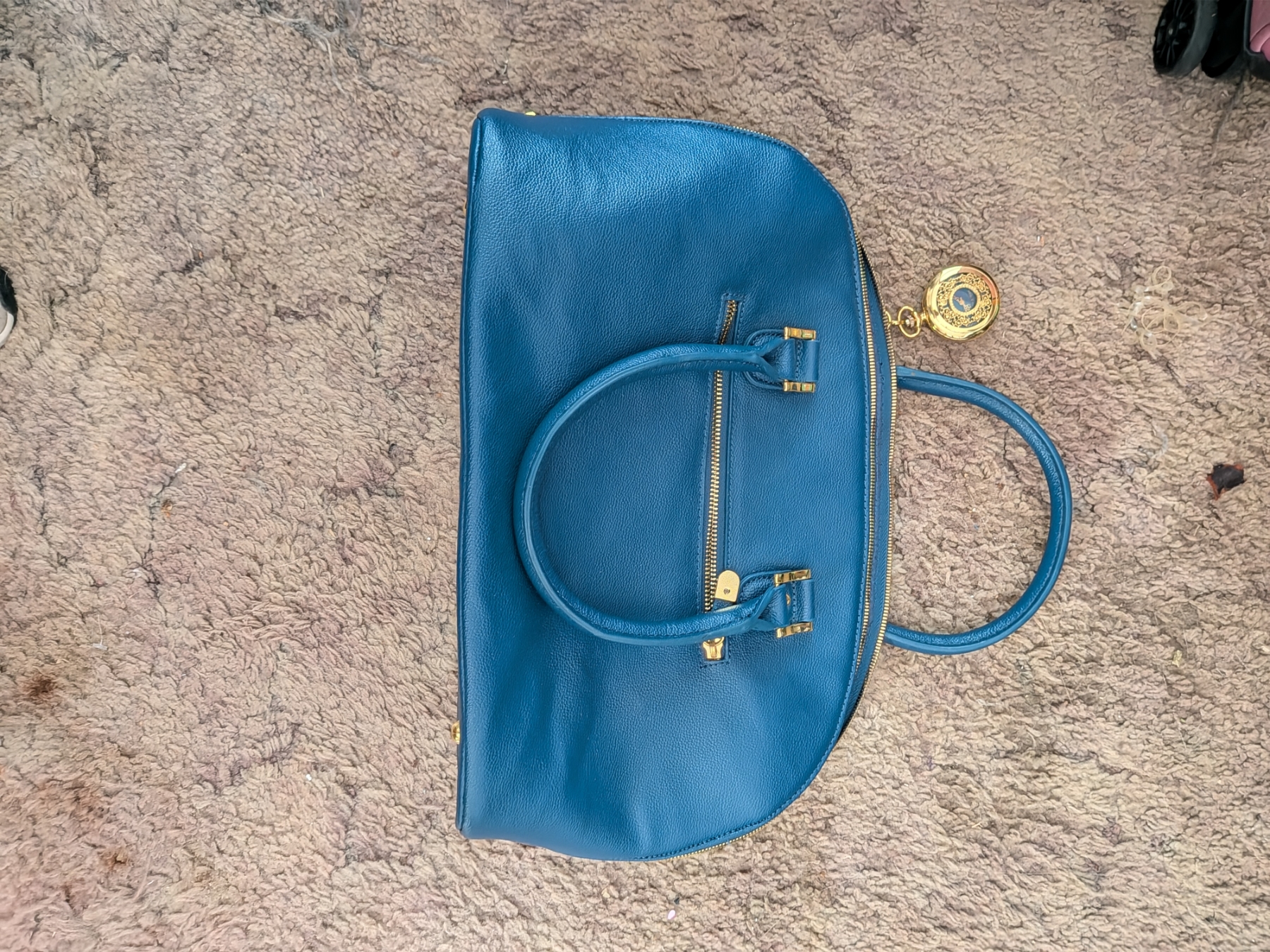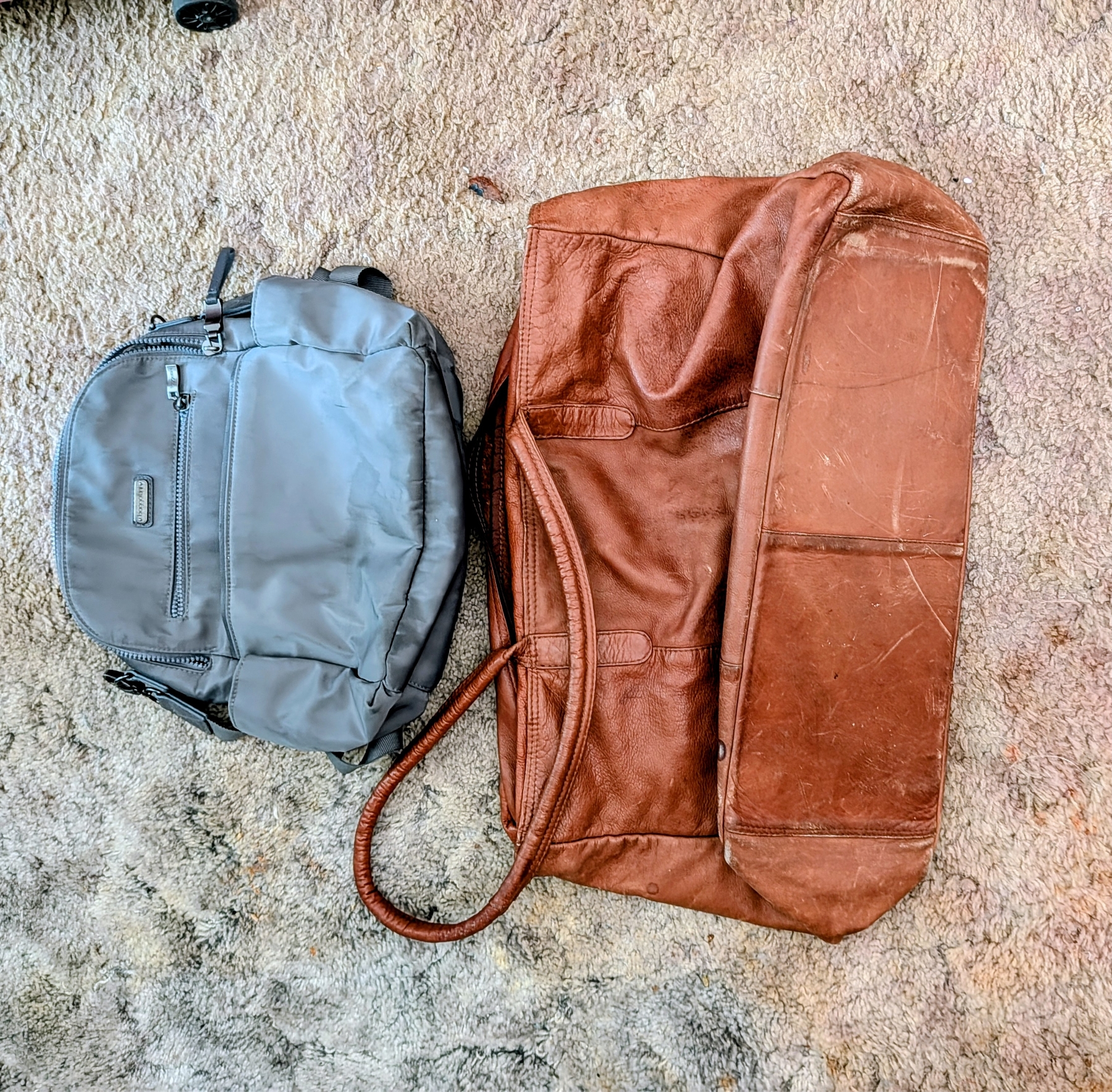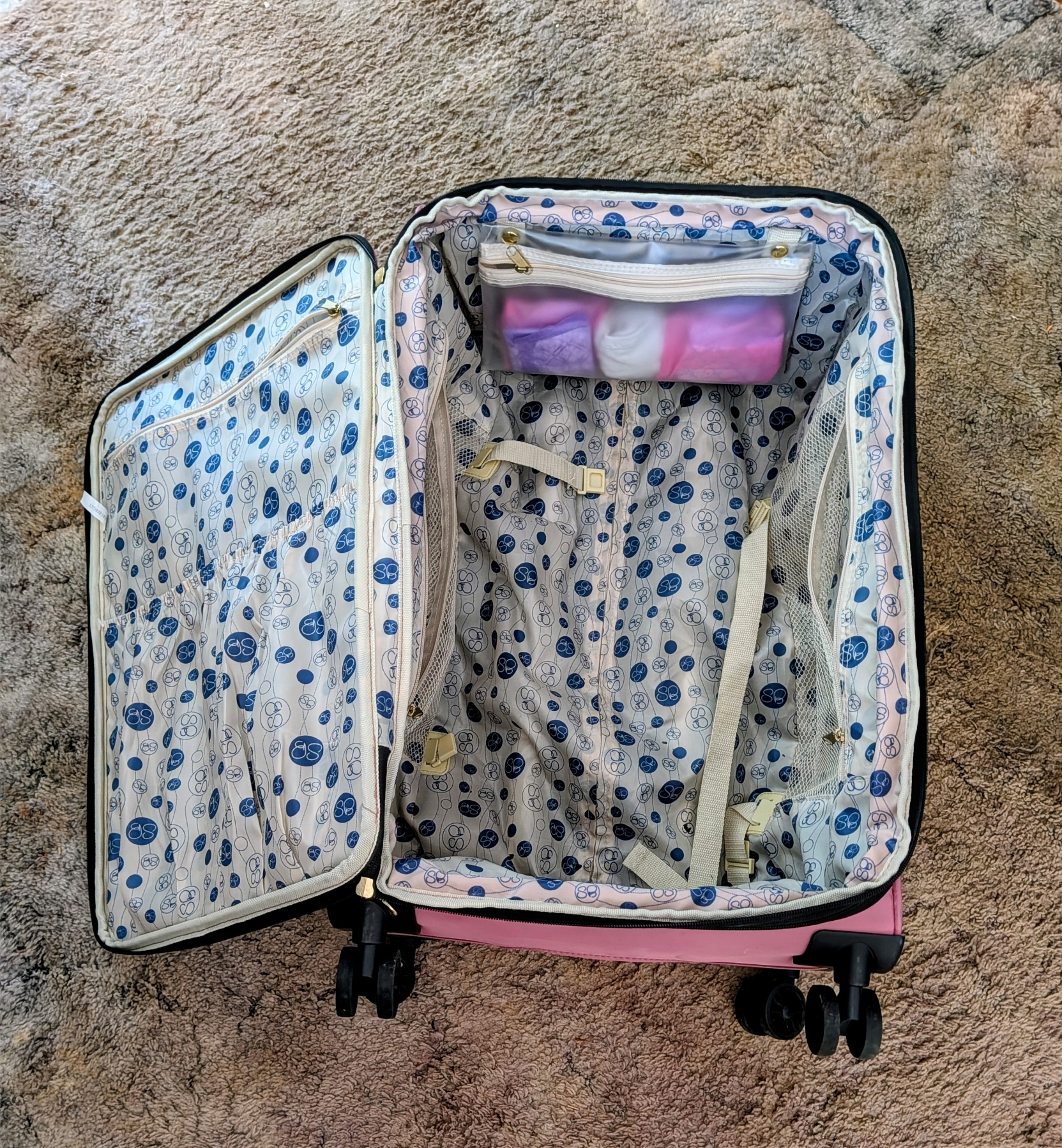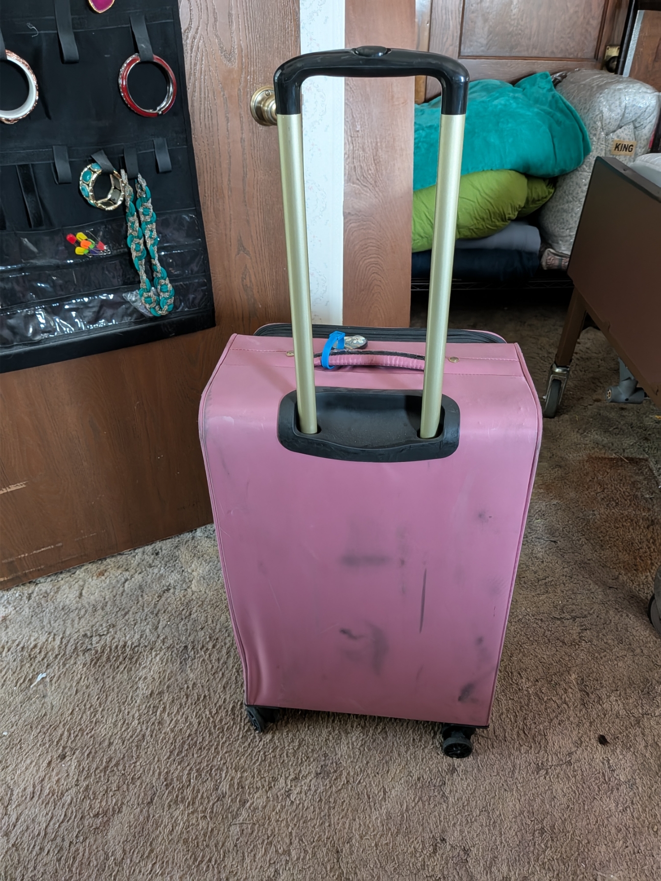 Purple Wheeled Suitcase, Small Backpack And Purses