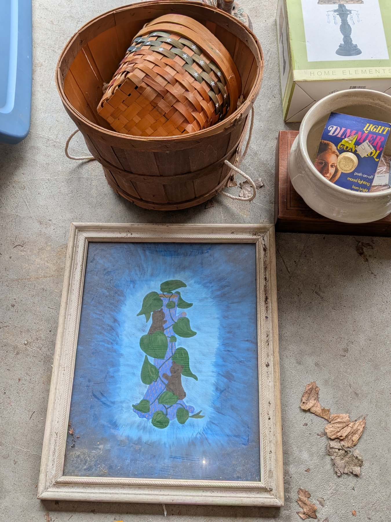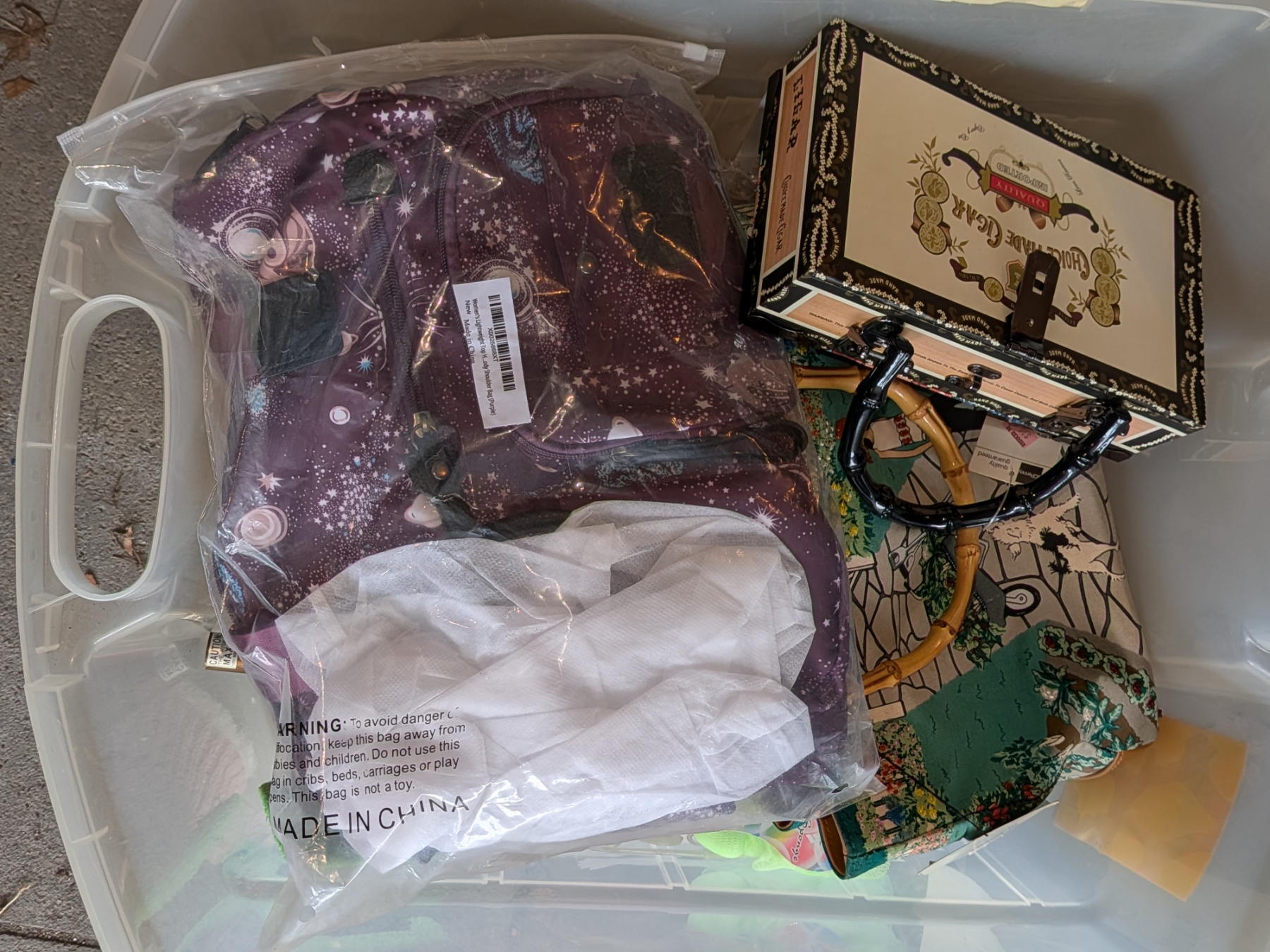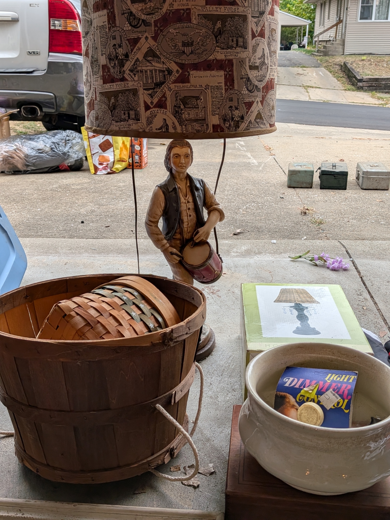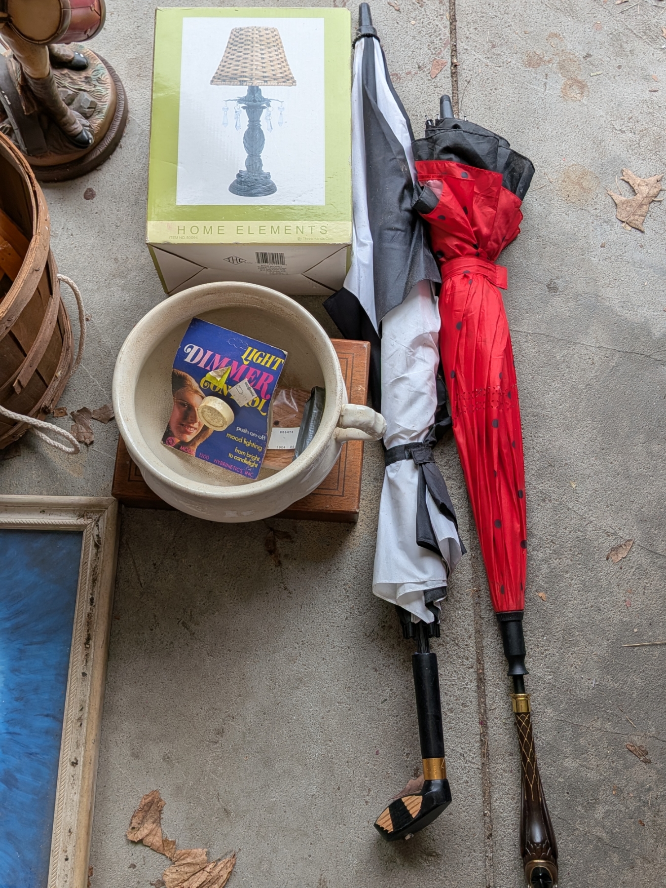 Purses, Bags, Drummer Lamp, Crock, Umbrellas, and More