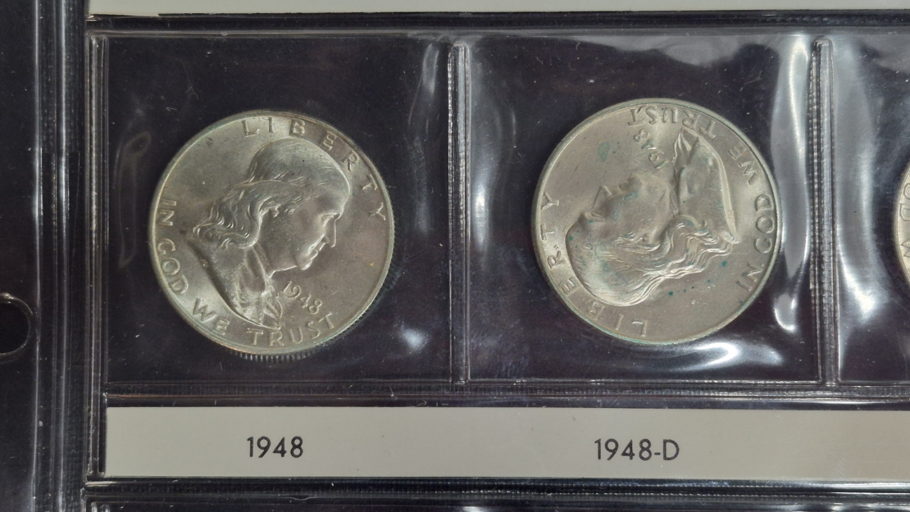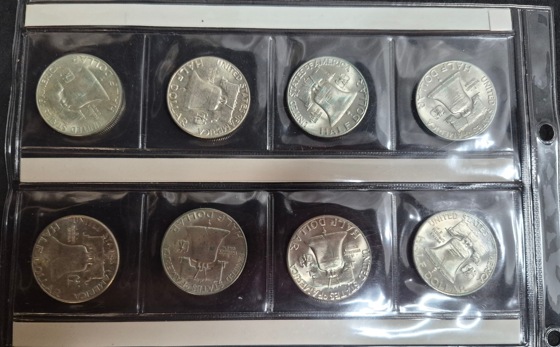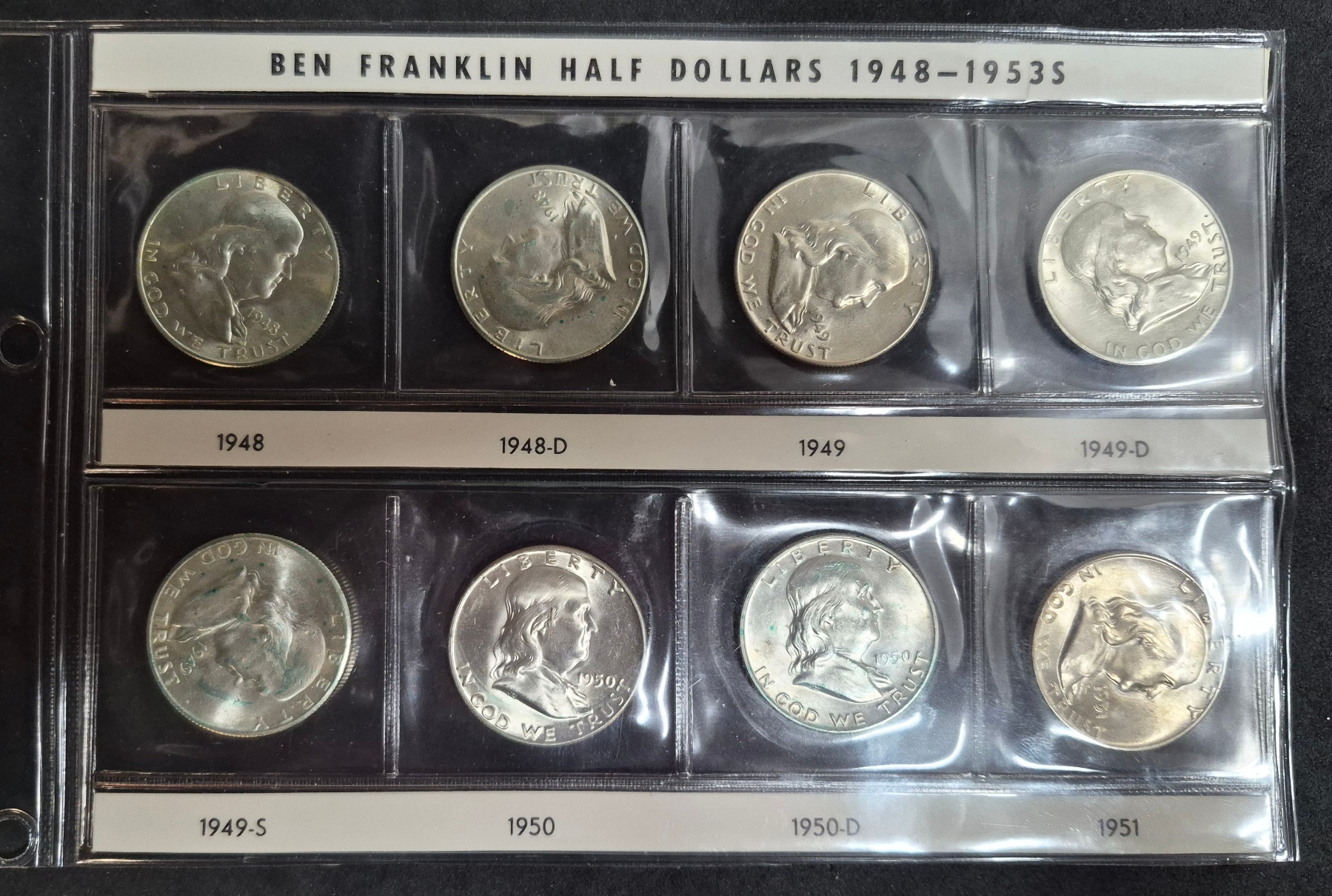 Qty 8 - Frankin Half Dollars In BU Condition In Sealed Sleeve Page 1948 Thru 1951 90% Silver - Dates Are: 1948 P & D, 1949 P -D & S, 1950 P & D, 1951 P