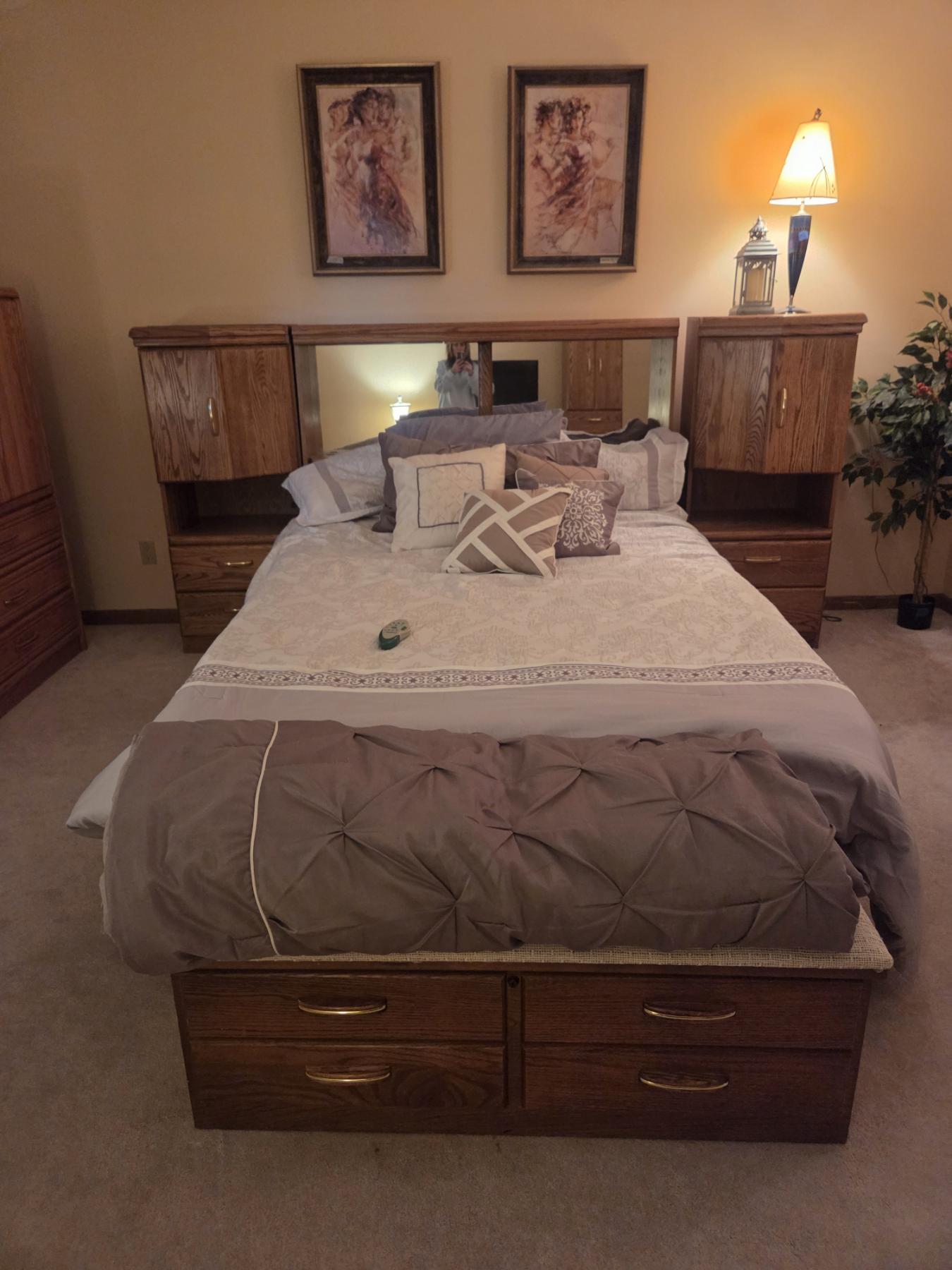 Queen TemprPedic Adjustable Mattress, Box Spring, Huge Oak Headboard And Cedar Lined Padded Bench Storage Chest