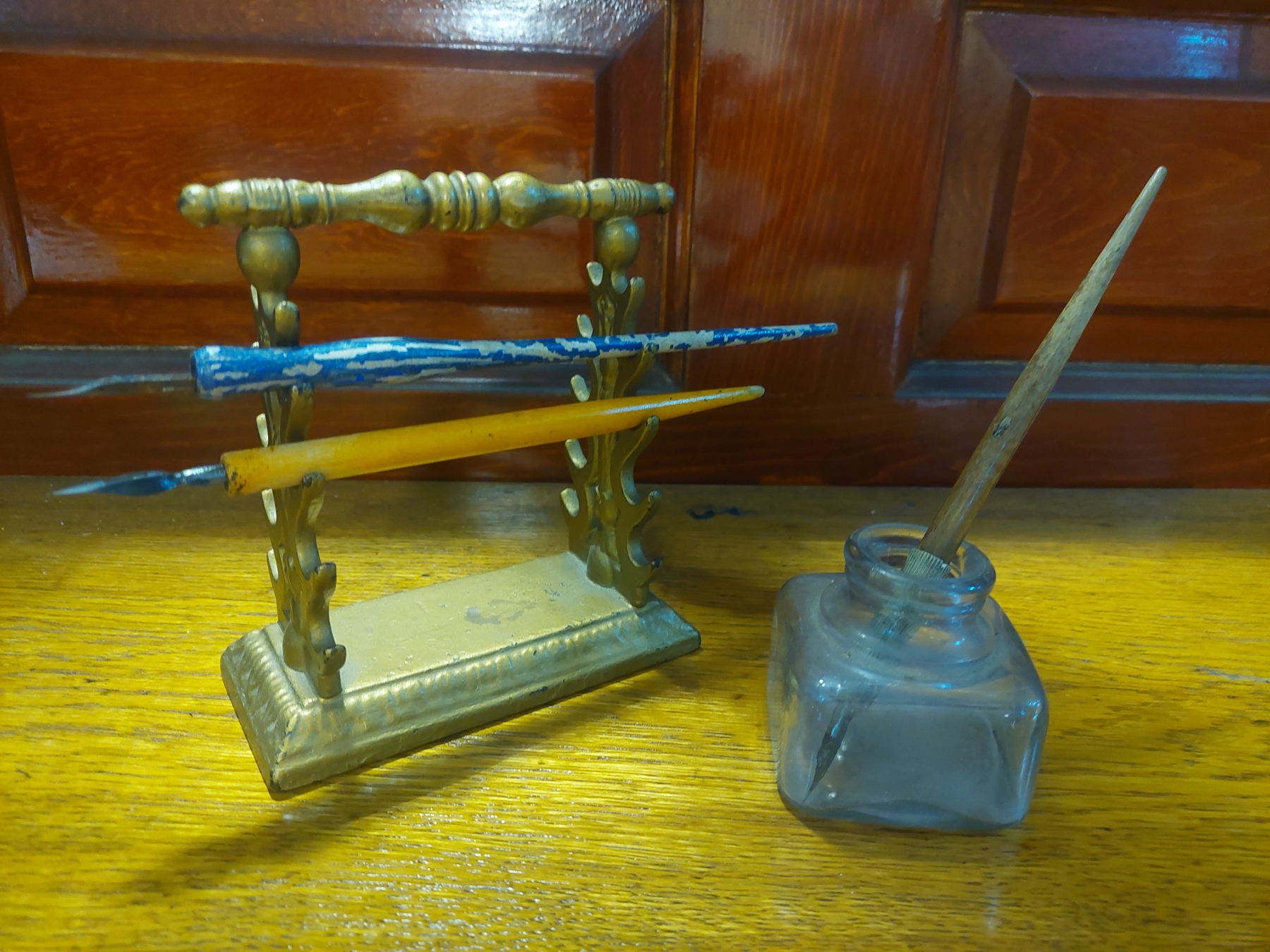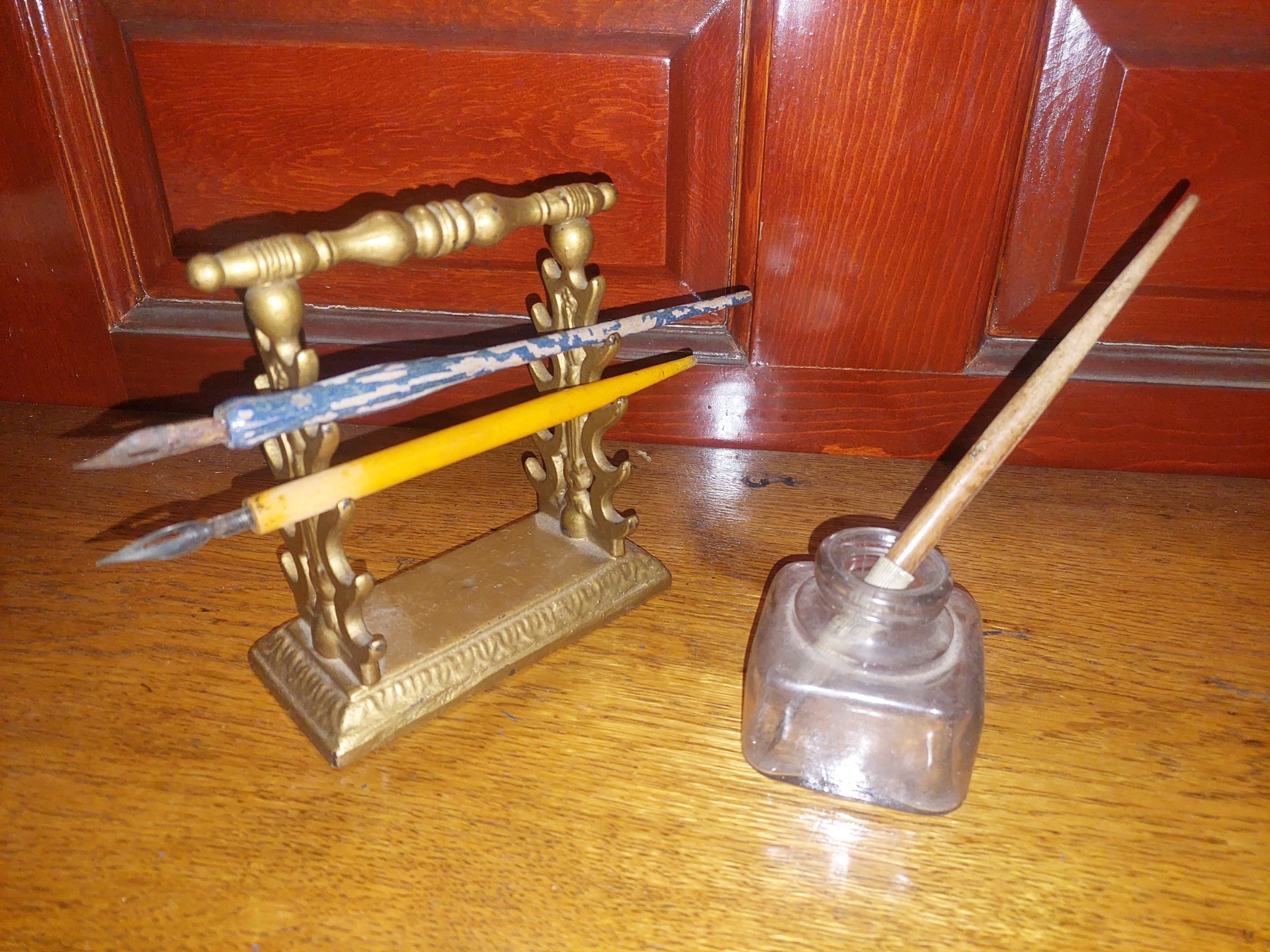 RARE - Antique Fountain Pen Holder - Ornate Brass Plated - May Be Solid Brass Or Plated Spelter - See Pics - Includes Items Shown