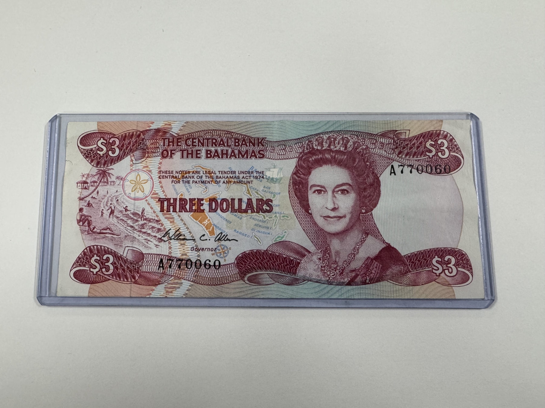 Rare Central Bank Of The Bahamas $3.00 Note - Queen Elizabeth - Mint Condition