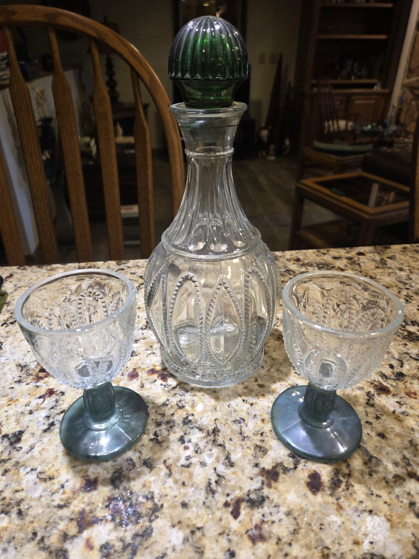 RARE Vintage Avon Decanter With Emerald Green Glass Stopper & 2 Sherry Glasses W Emerald Green Accents