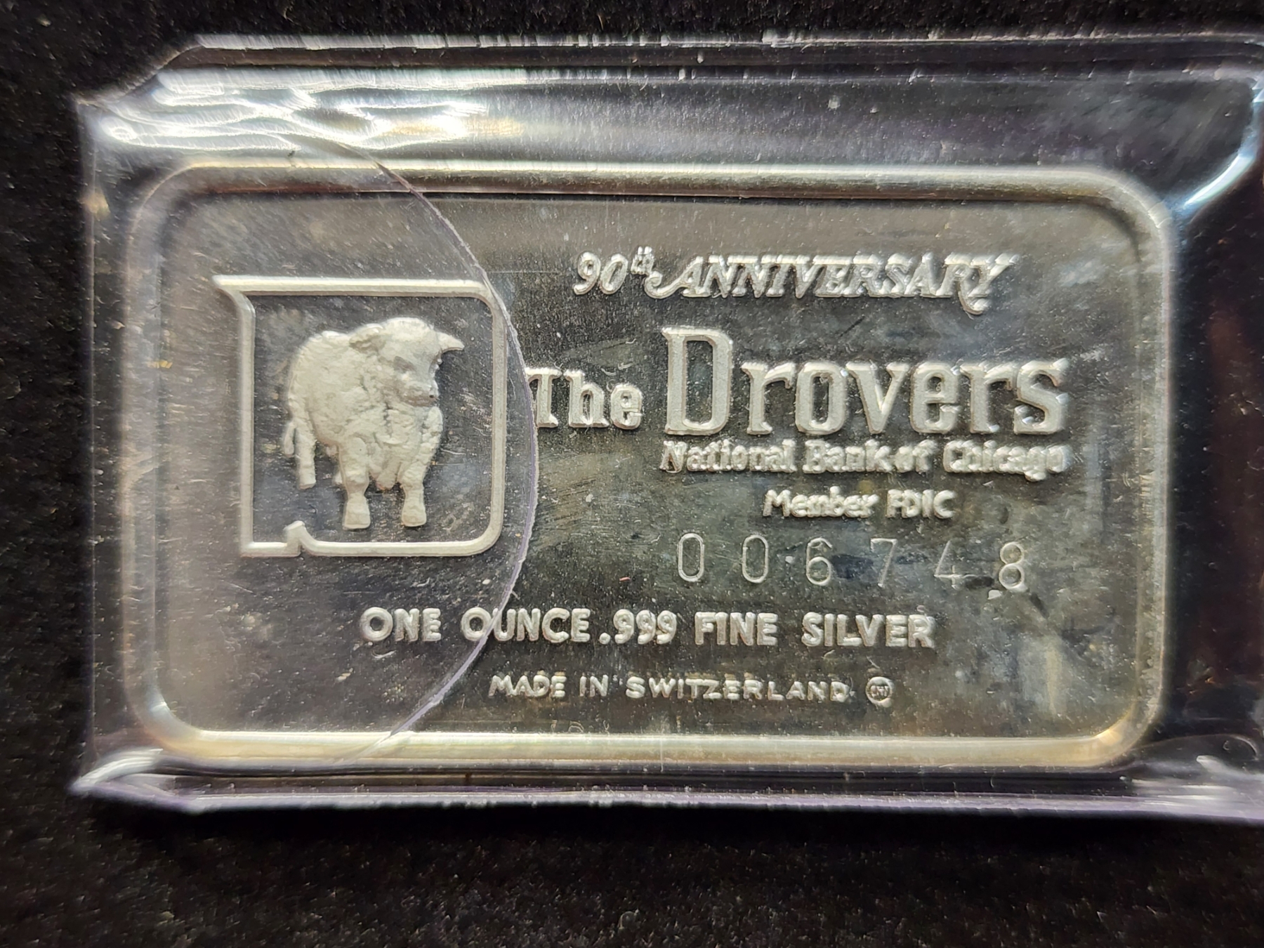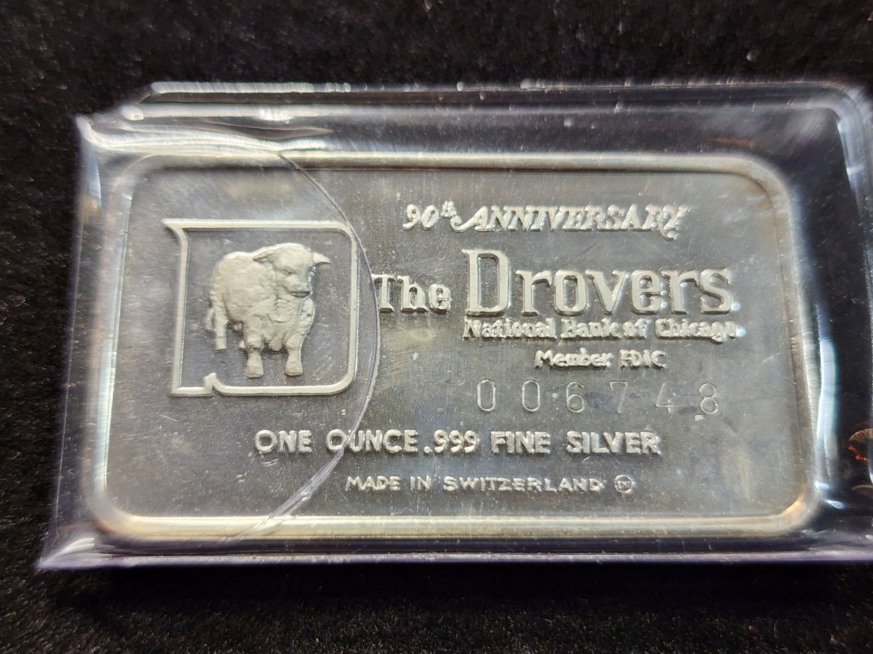 Rare Vintage Drovers Country National Bank of Chicago One Ounce .999 Fine Silver Bar
