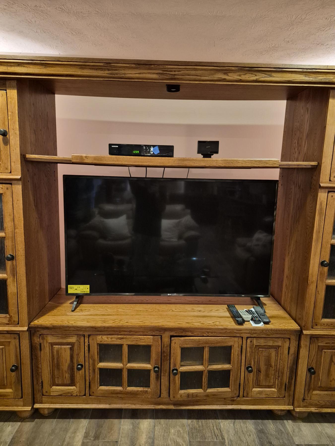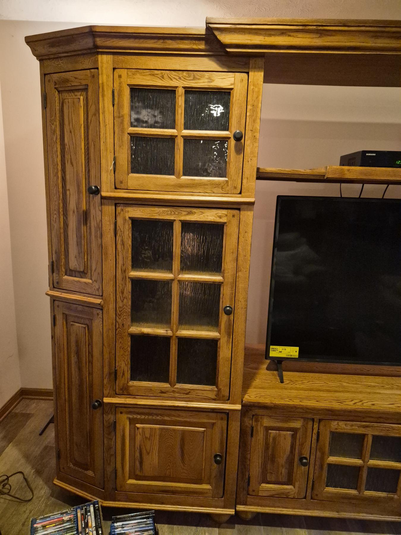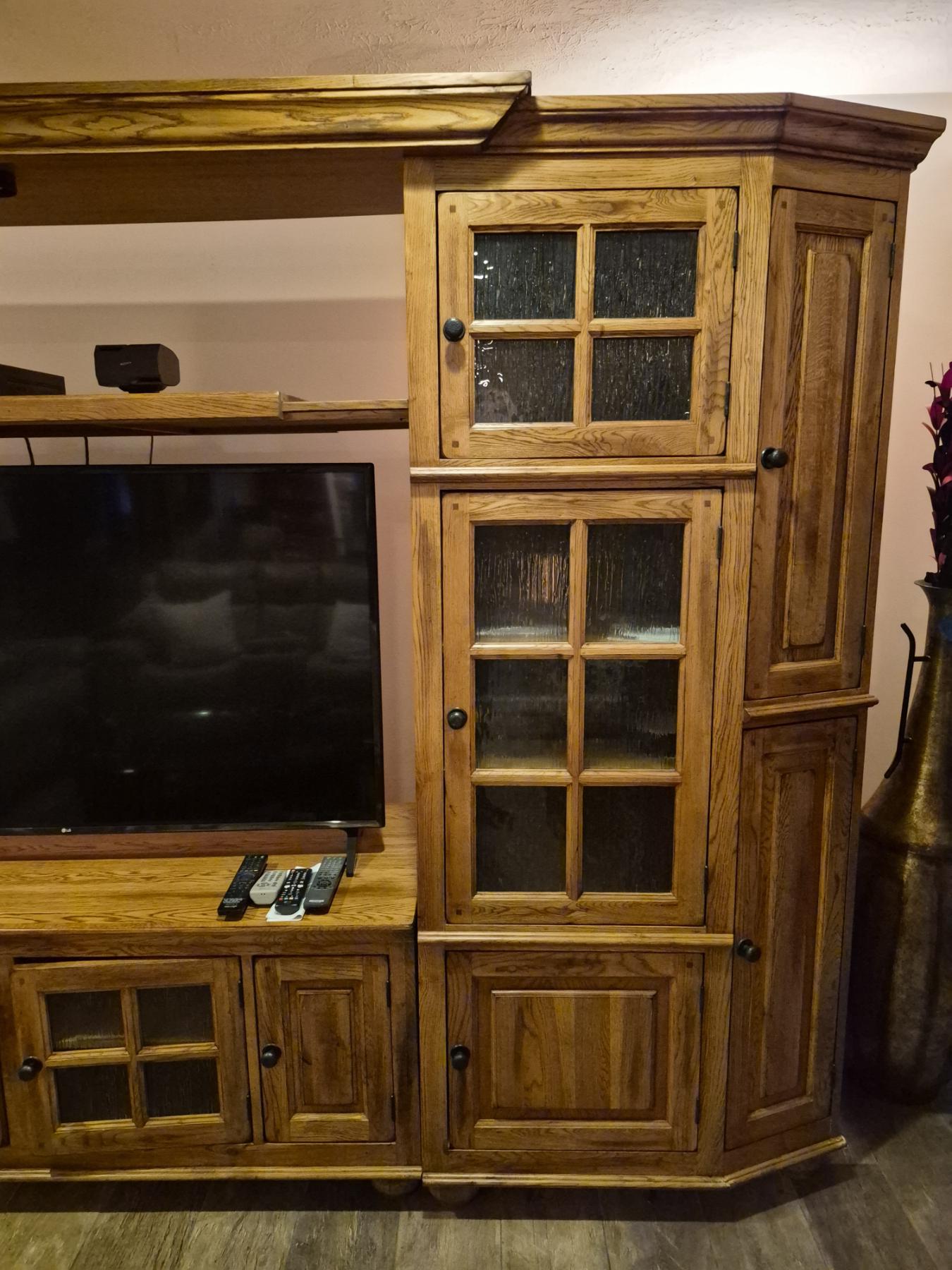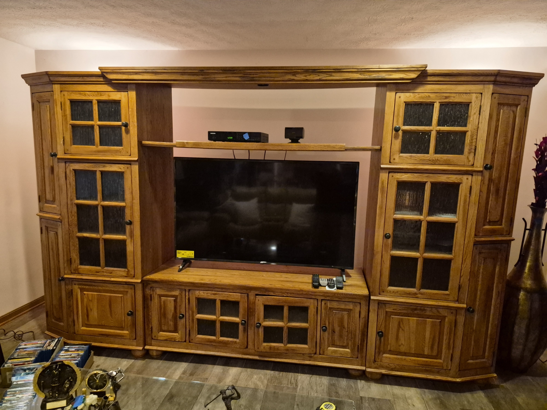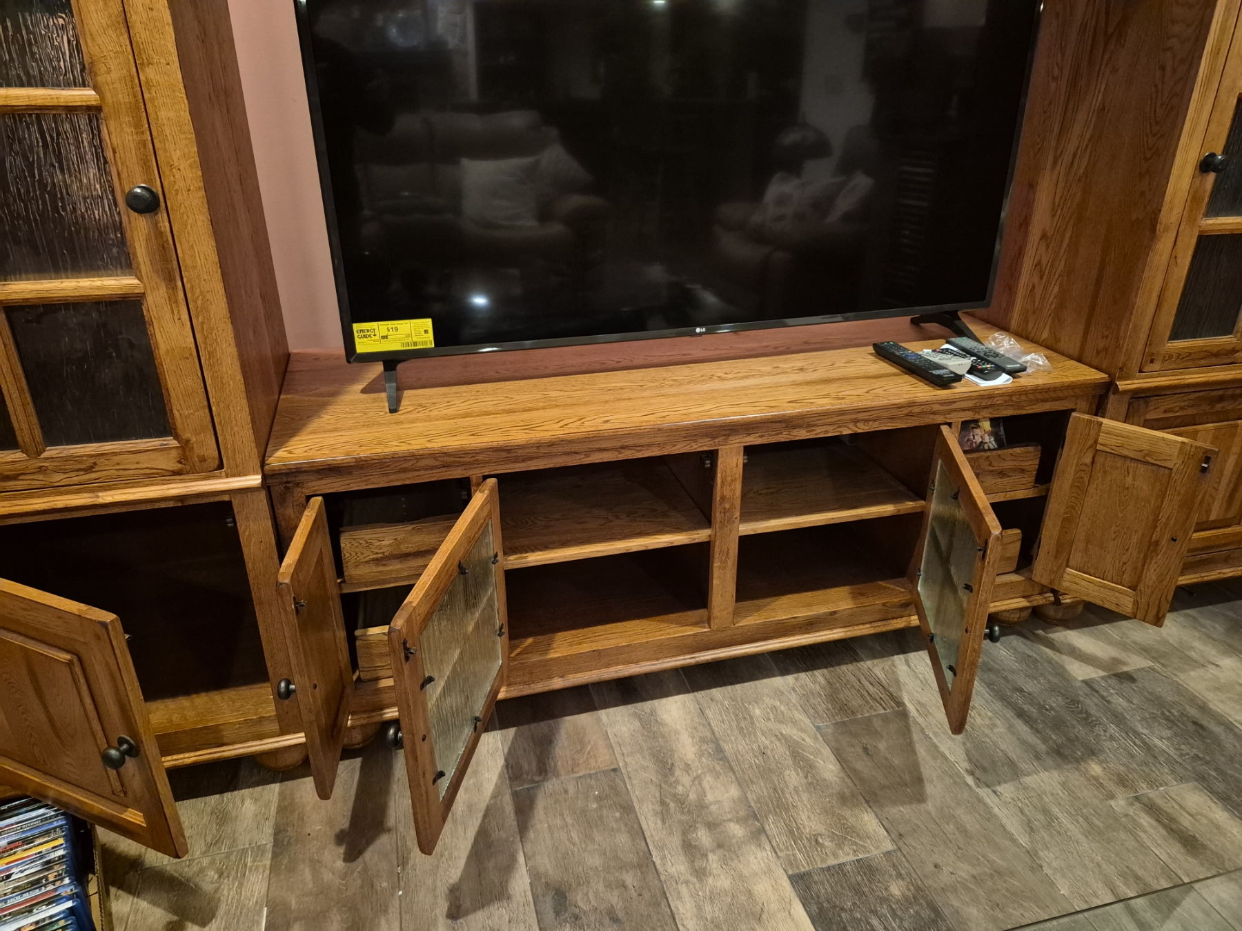 SUPERIOR High end Solid Oak Entertainment Center - Commanding Size In Perfect Condition - Measures Overall: 128" by 80" consisting of 3 sections as follows: 33/80 62/80 33/80 Fantastic Set