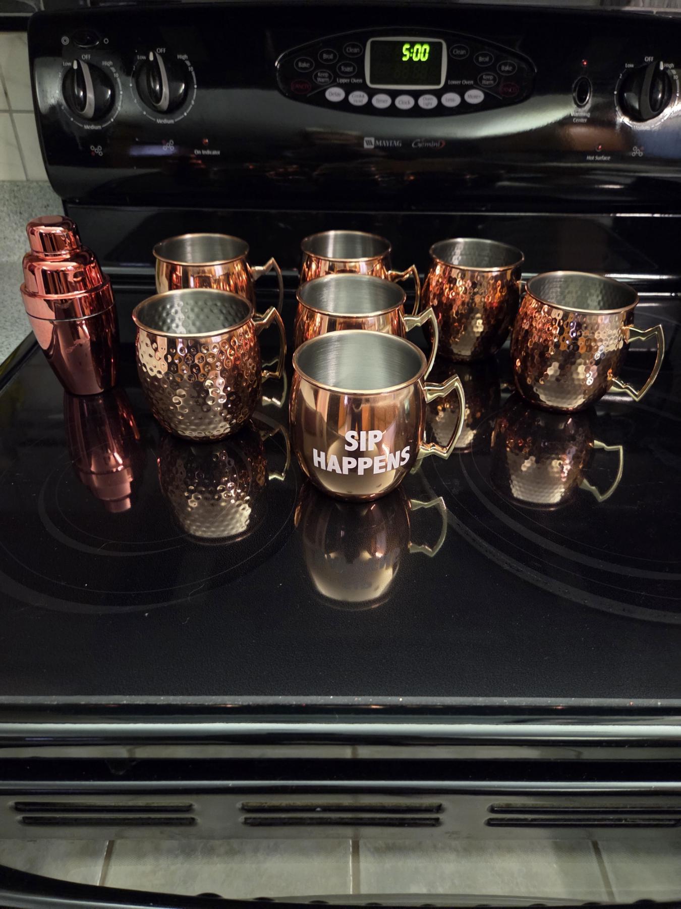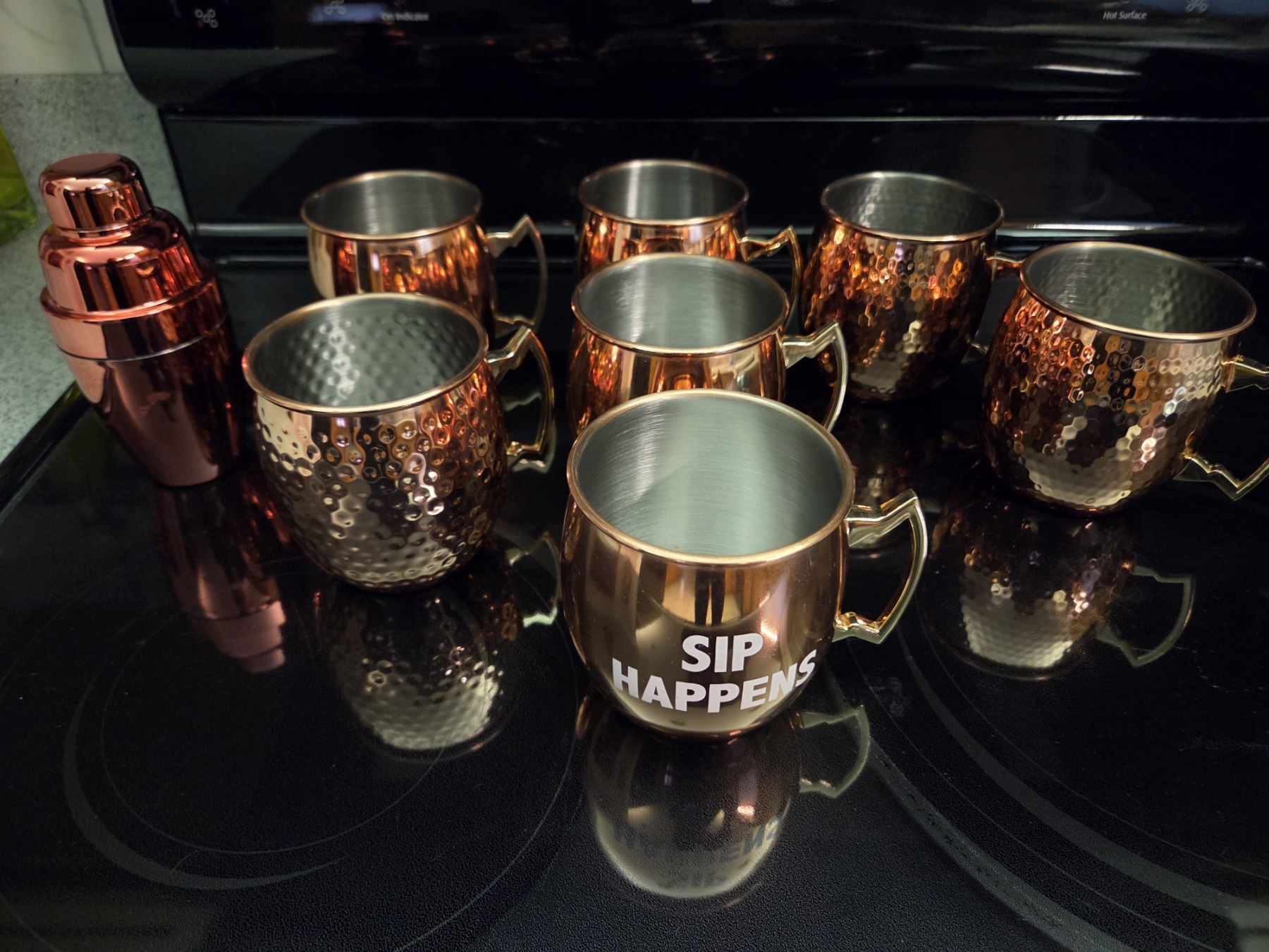 Seven Aesthetic Copper Drink Mugs With Mini Plastic Cocktail Shaker