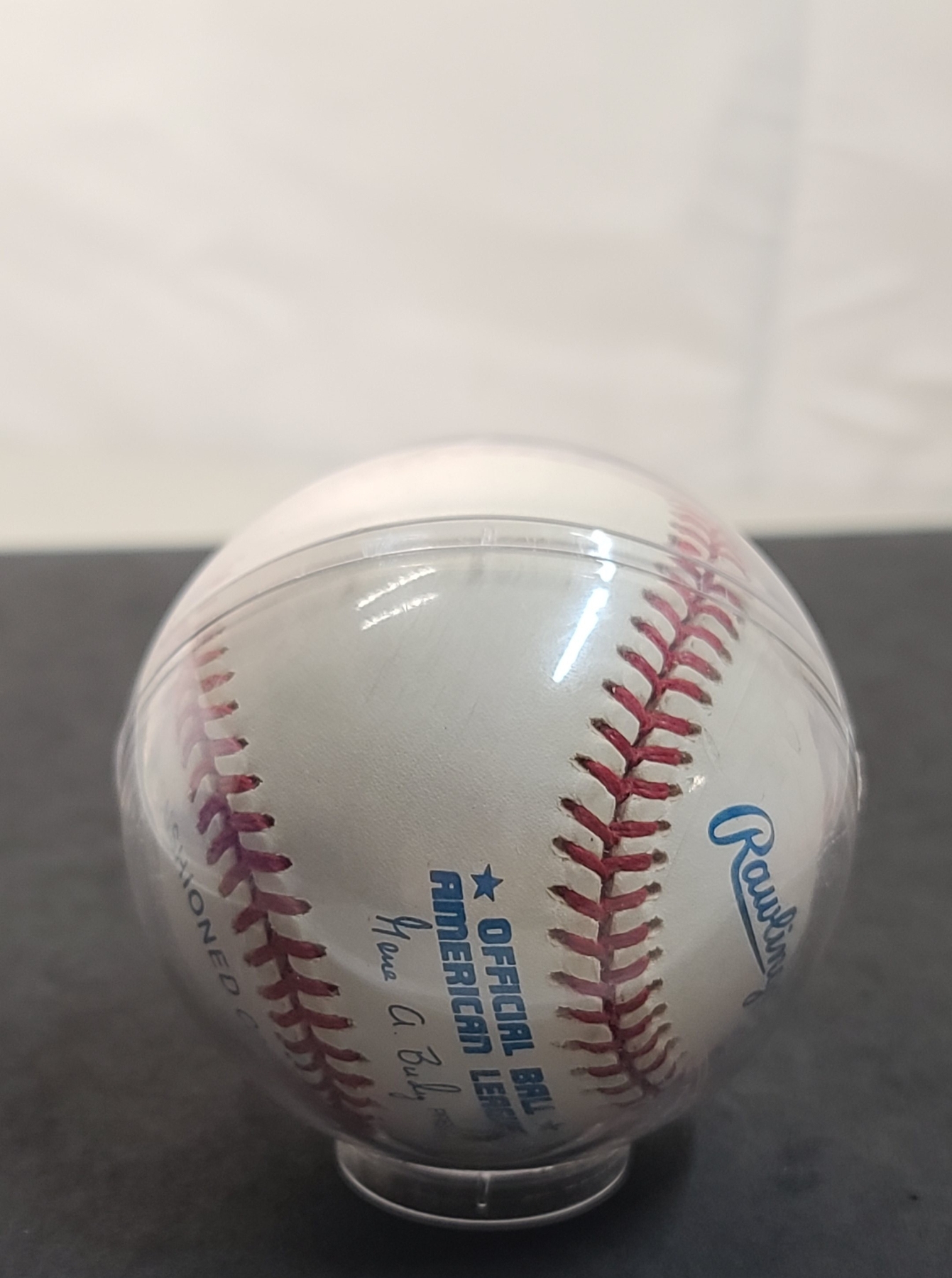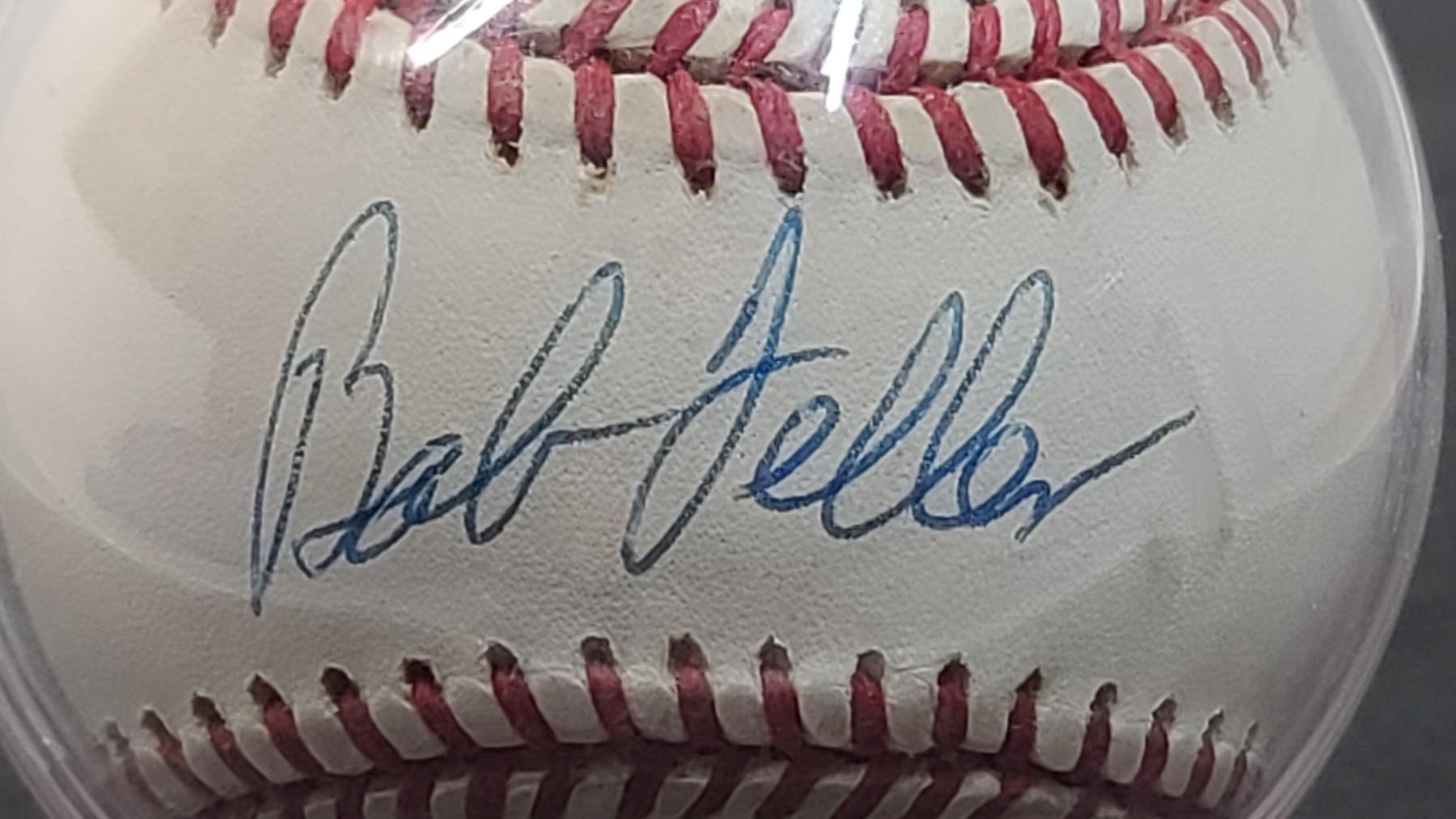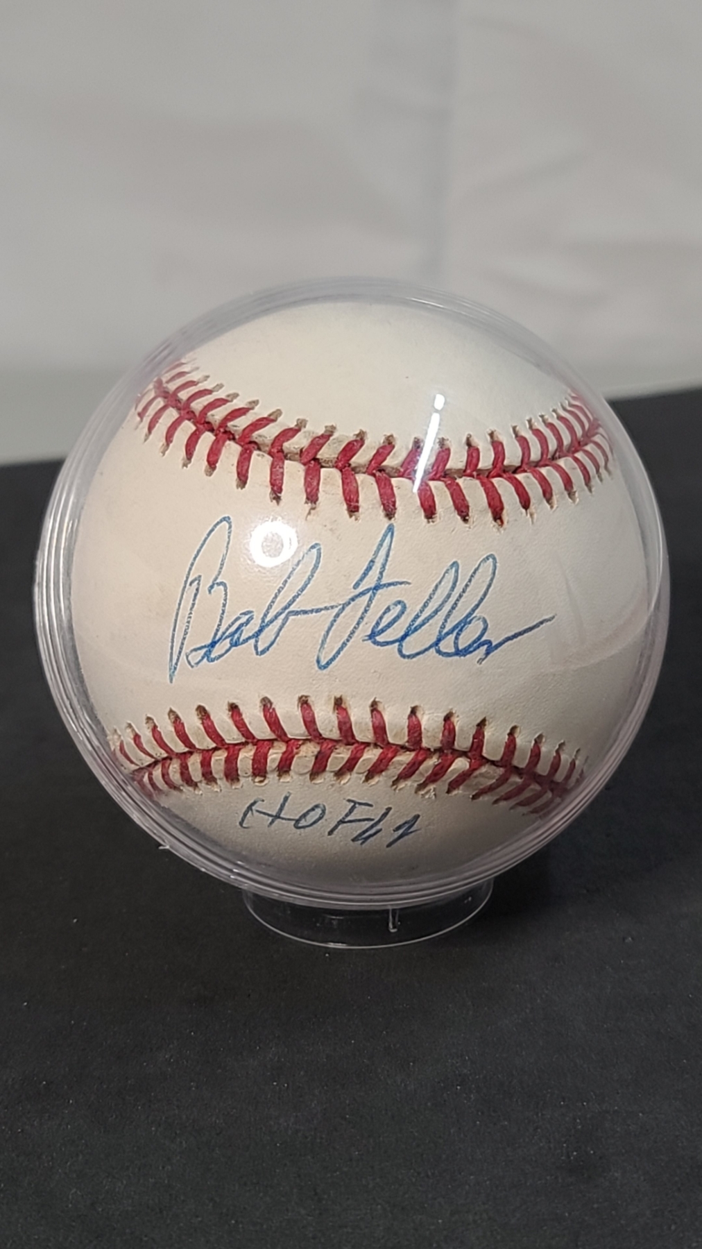 Signed Bob Feller Rawlings HOF Baseball In Ball Display Holder