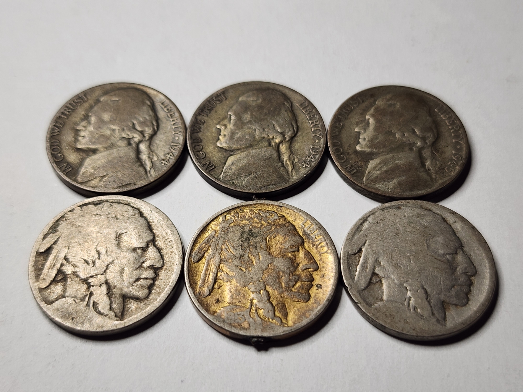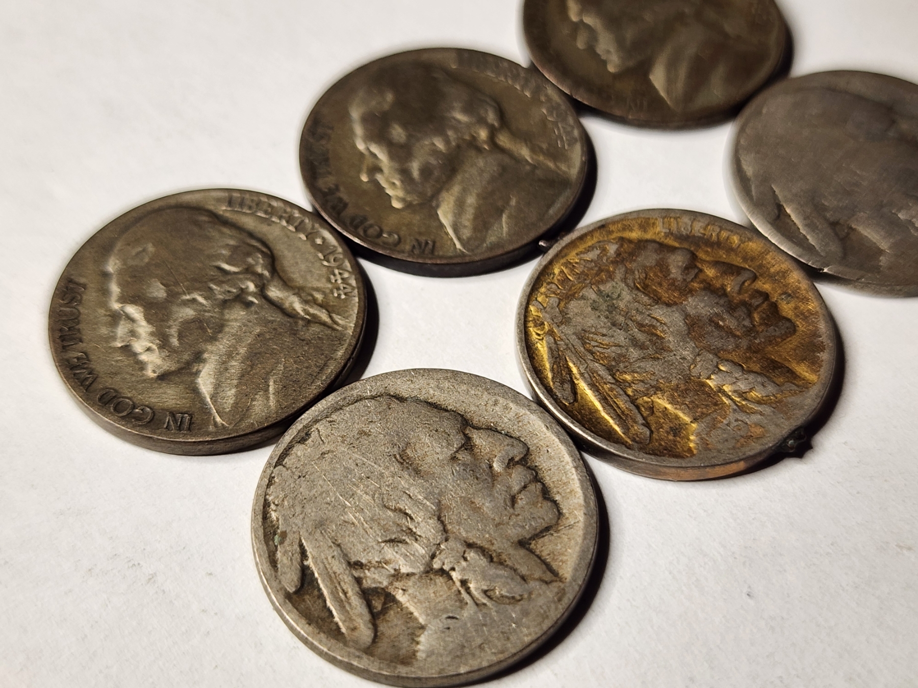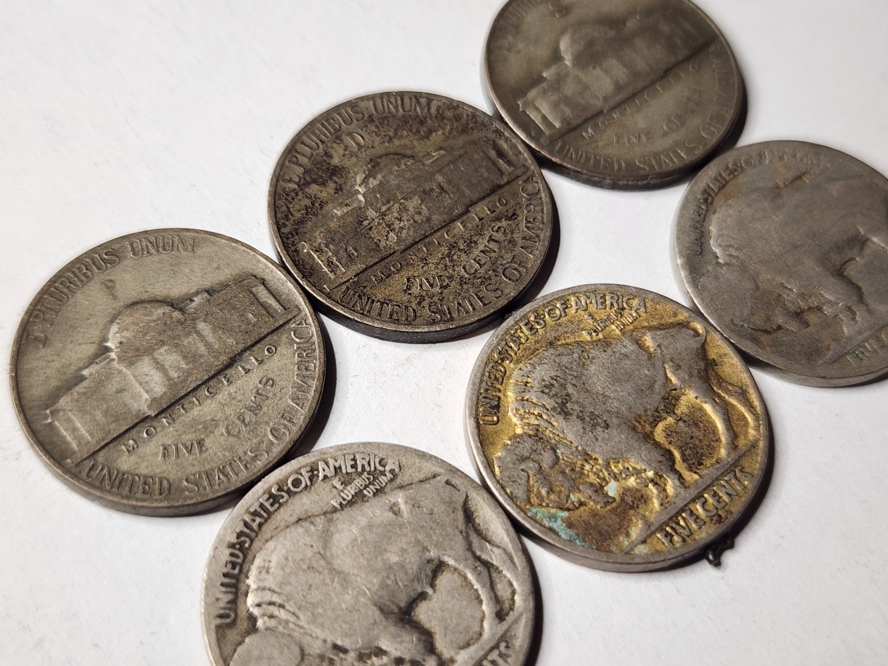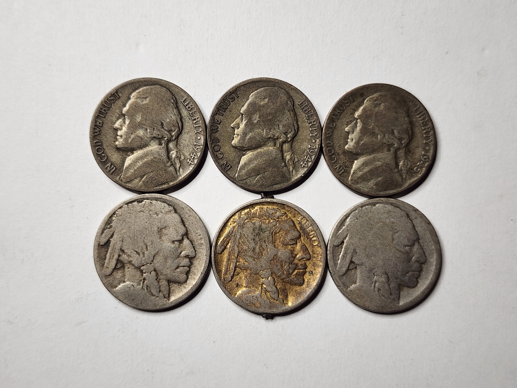 Six Assorted United States Nickels Featuring Three Silver Wartime Nickels & Three Buffalo Nickels! Every Silver Wartime Nickel will Feature A Mint Mark ABOVE the Monticello (The Building On The Reverse Side) & is made of 50% Silver With an Actual Silver Weight of 0.0563oz!