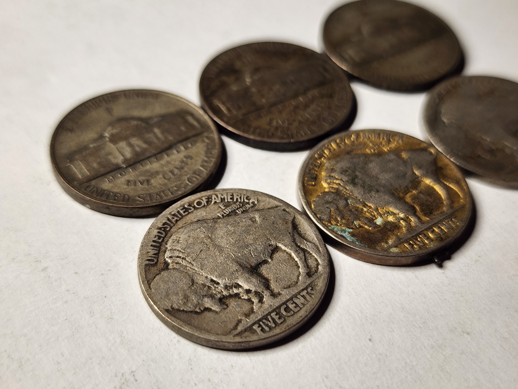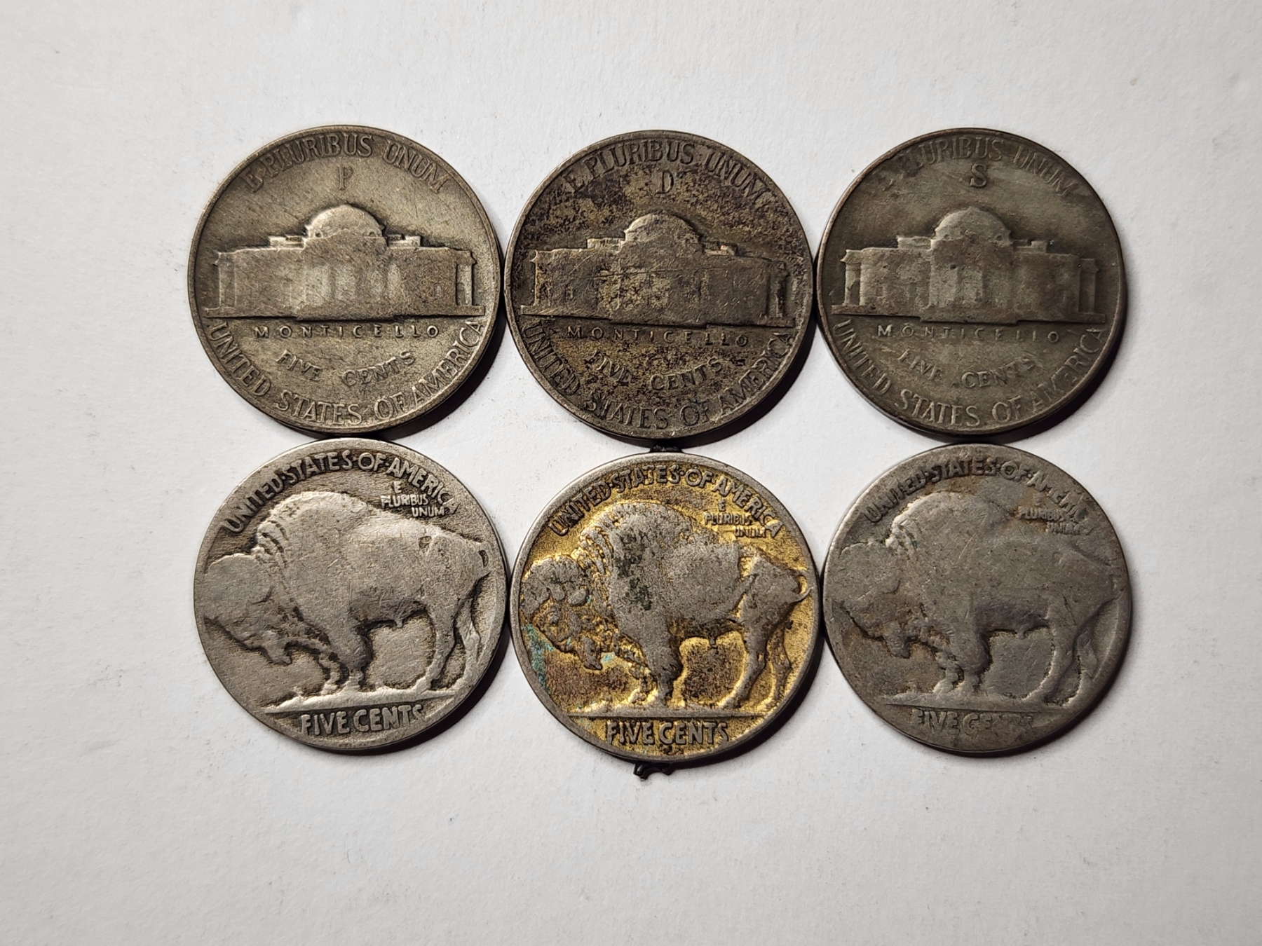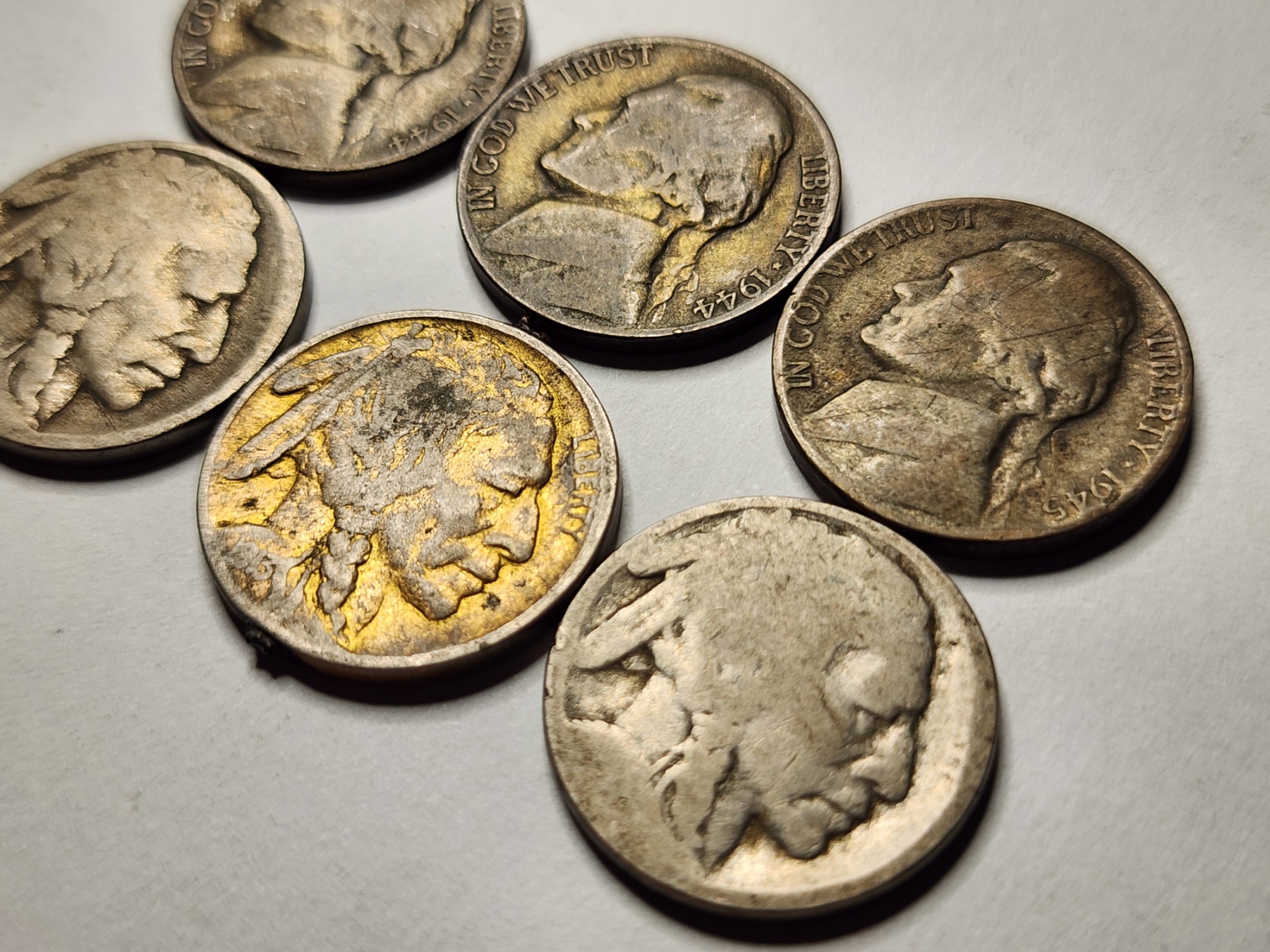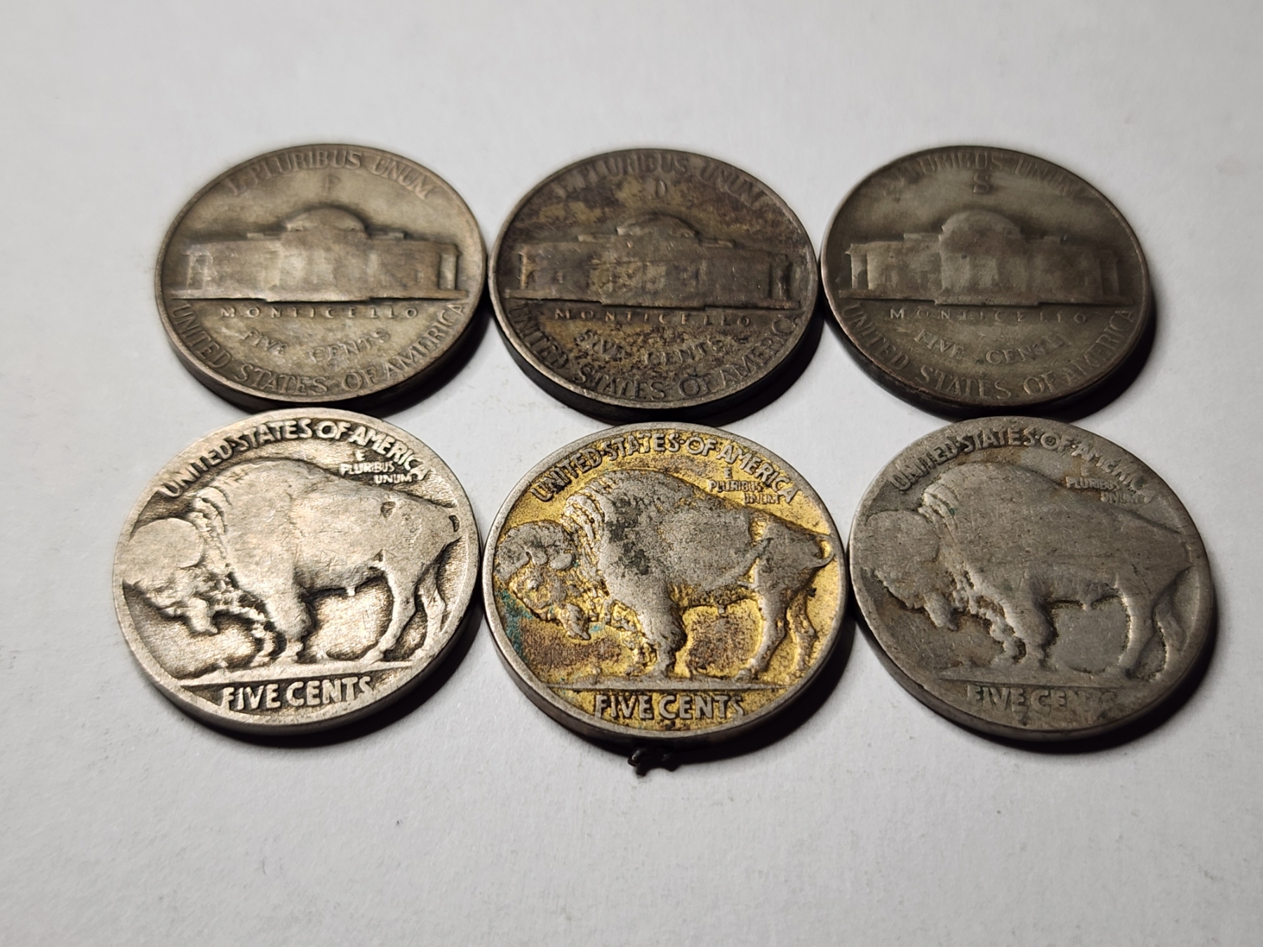 Six Assorted United States Nickels Featuring Three Silver Wartime Nickels & Three Buffalo Nickels! Every Silver Wartime Nickel will Feature A Mint Mark ABOVE the Monticello (The Building On The Reverse Side) & is made of 50% Silver With an Actual Silver Weight of 0.0563oz!