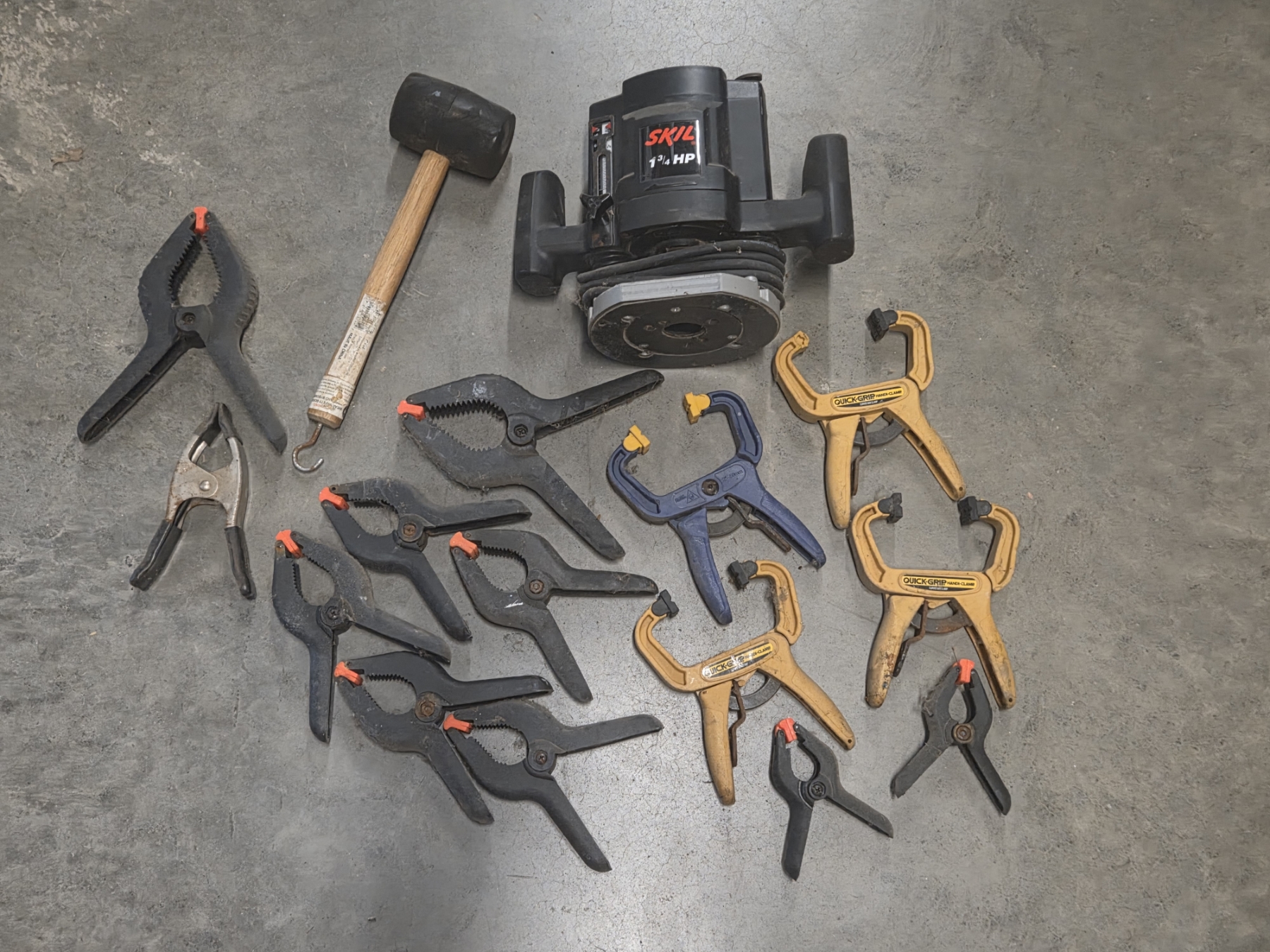 Skil Router, Rubber Mallet, & Large Group Of Hand Clamps In Great Condition